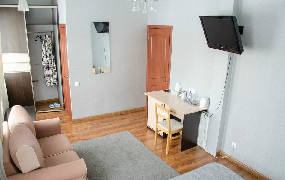Стандартный 1-местный 1-комнатный Количество комнат: 1-комнатный Тип номера: Стандартный Кол-во основных мест: 1 Мебель: вешалка, зеркало, кровать односпальная, стол, стулья, шкаф Оборудование: телевизор, чайный набор посуды, электрочайник Санузел: с душем, туалетные принадлежности Сервис: Wi-Fi бесплатно, смена полотенец, смена постельного белья, уборка номера