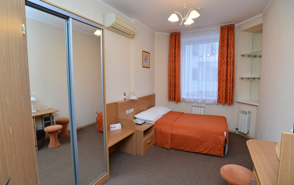 Стандартный 1-местный Количество комнат: 1-комнатный Тип номера: Стандартный Кол-во основных мест: 1 Площадь (кв. м): 20 Мебель: кровать односпальная, прикроватная тумбочка, стол, стул, шкаф Оборудование: сейф, телевизор, холодильник Санузел: с душем Сервис: Wi-Fi бесплатно, смена полотенец, смена постельного белья, уборка номера