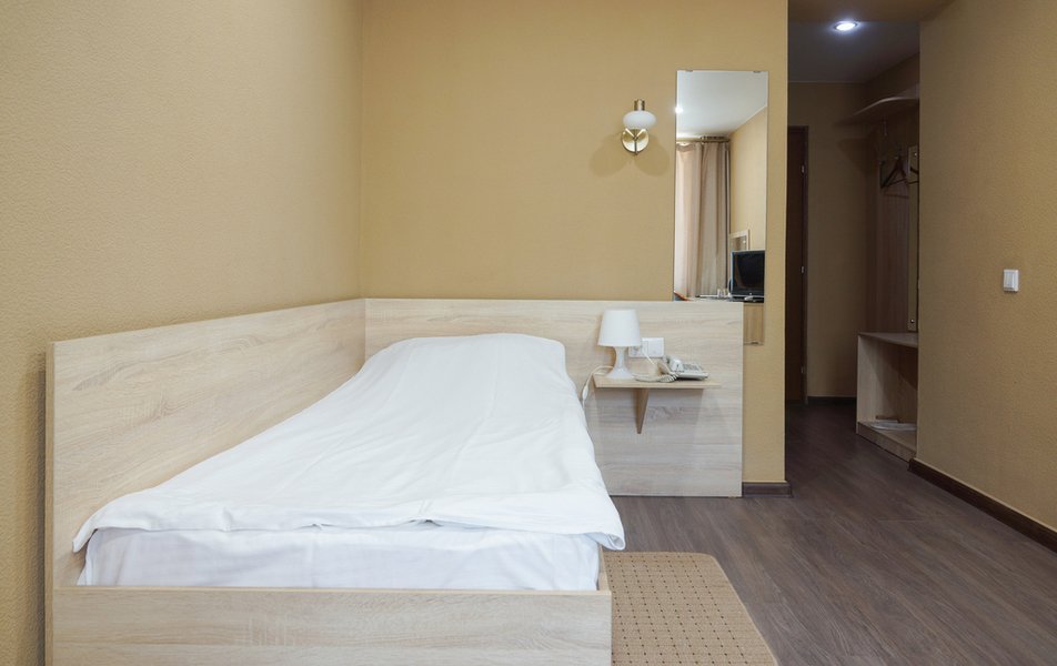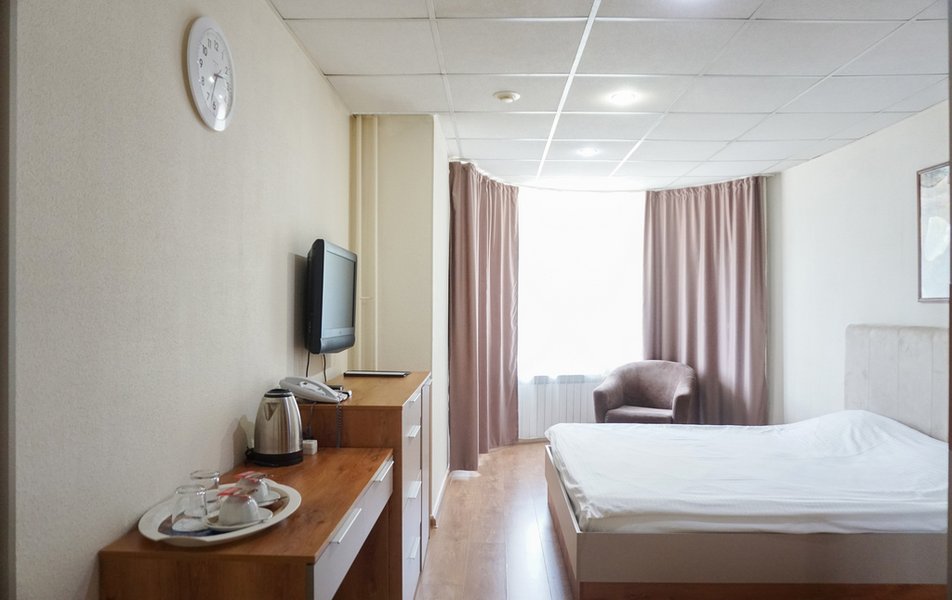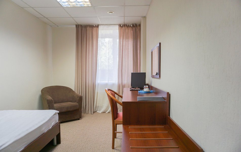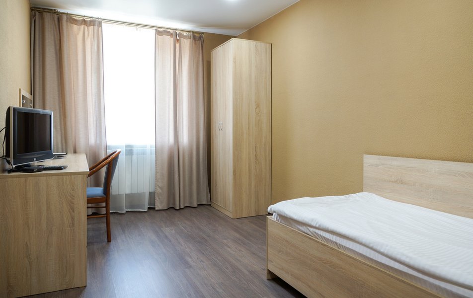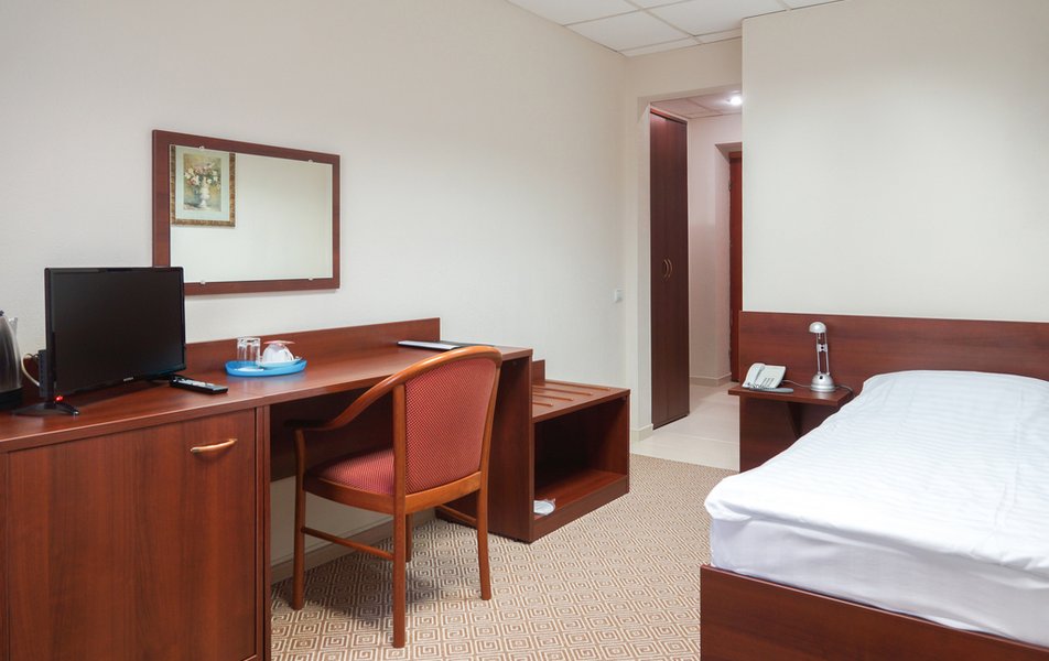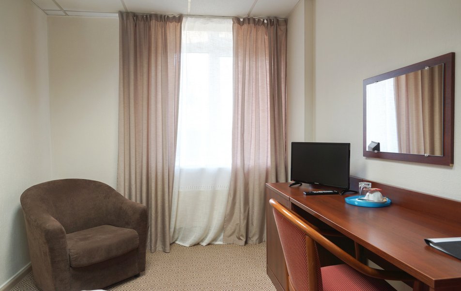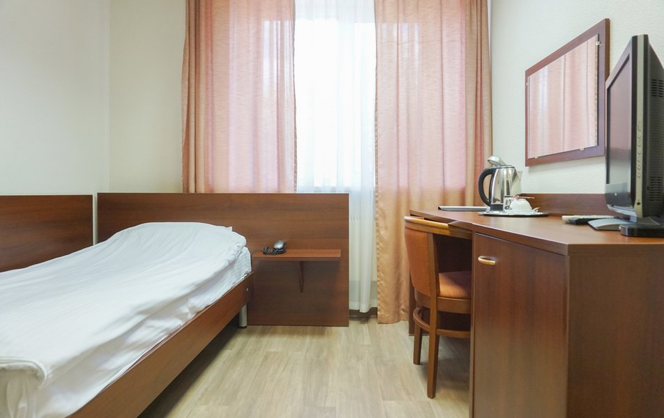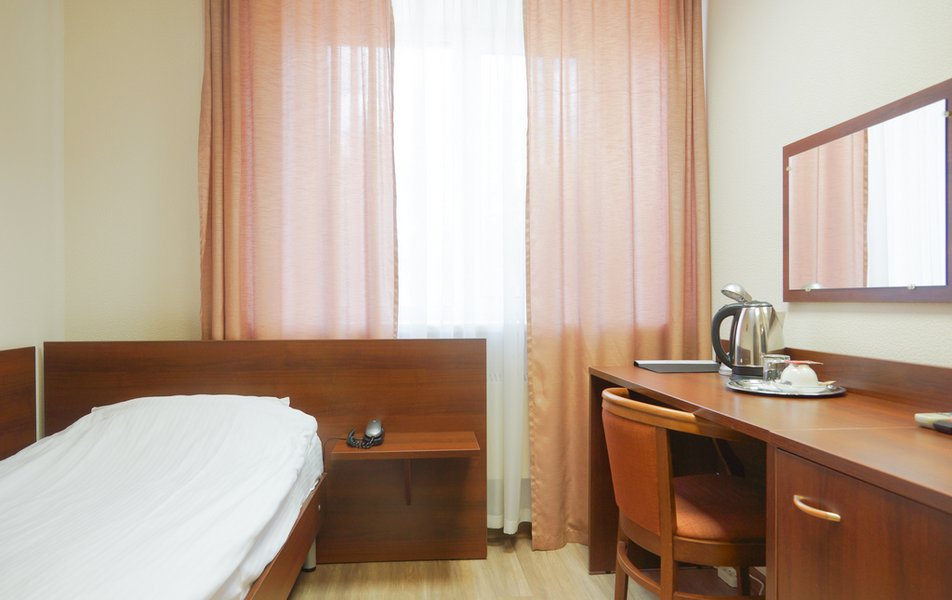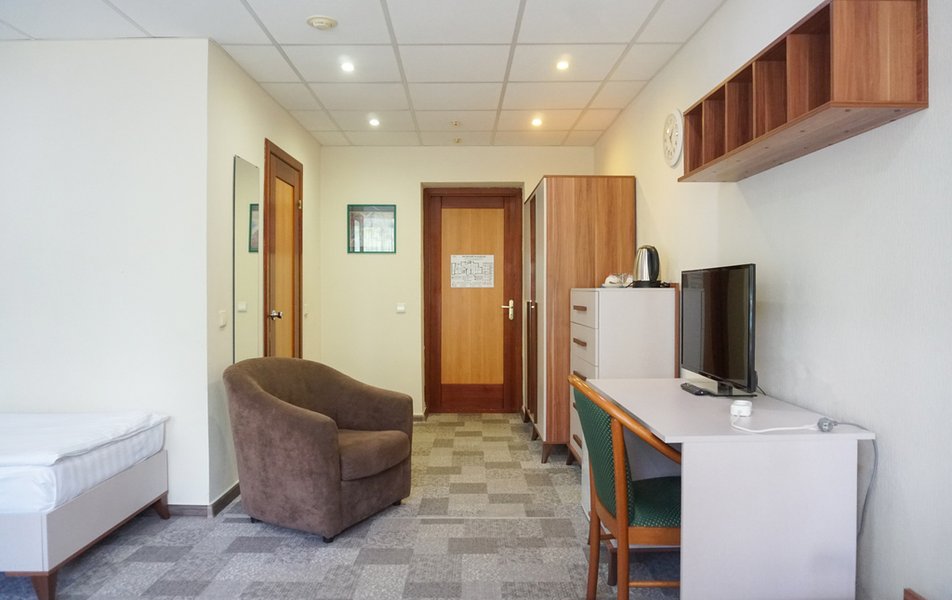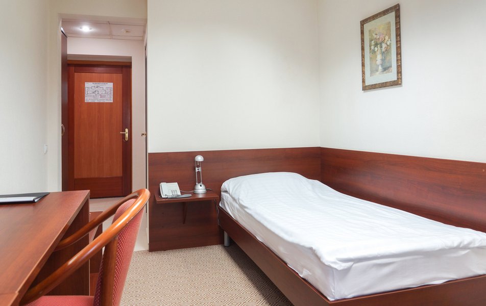 Стандартный 1-местный Количество комнат: 1-комнатный Тип номера: Стандартный Кол-во основных мест: 1 Площадь (кв. м): 14 Мебель: вешалка, зеркало, кровать односпальная, прикроватная тумбочка, стол, стул, шкаф Оборудование: мини-холодильник, телевизор, телефон, чайный набор посуды, электрочайник Санузел: с душевой кабиной, тапочки, туалетные принадлежности, фен Сервис: Wi-Fi бесплатно, смена полотенец, смена постельного белья, уборка номера, услуги внутренней телефонной связи