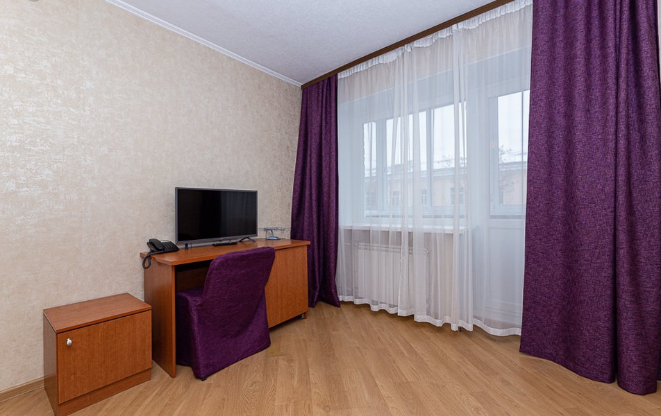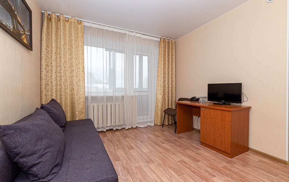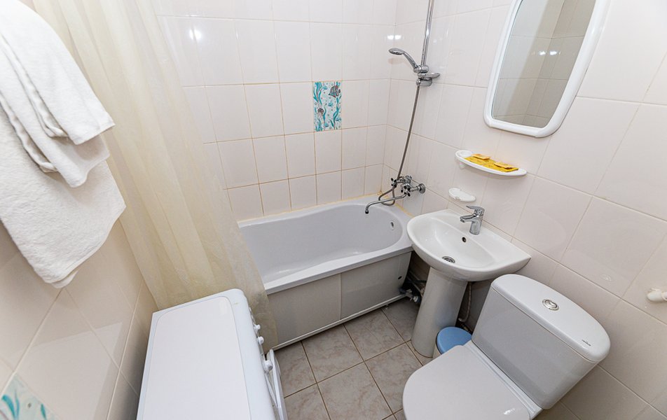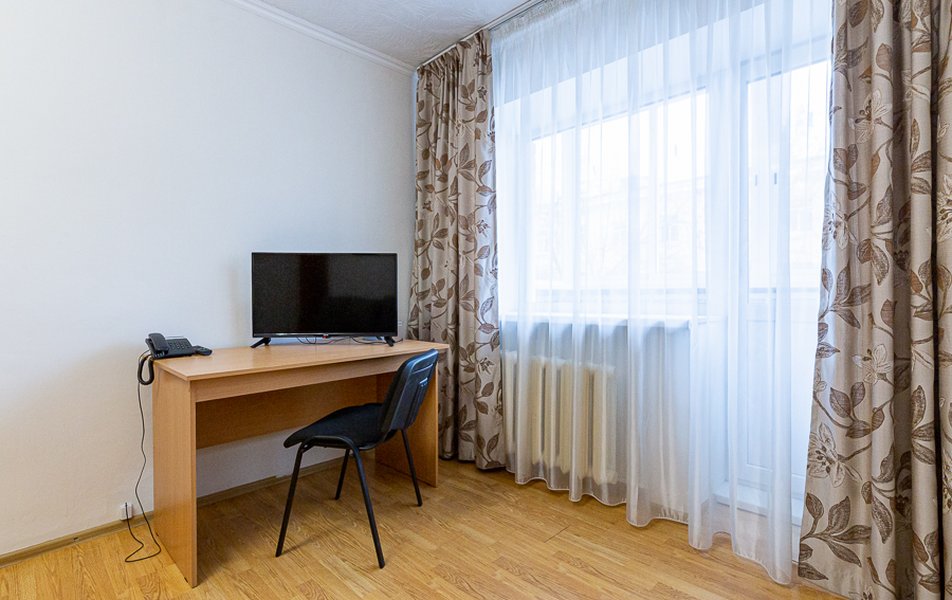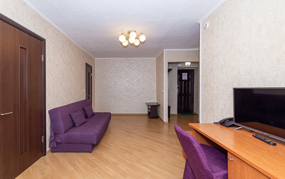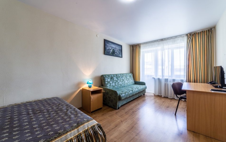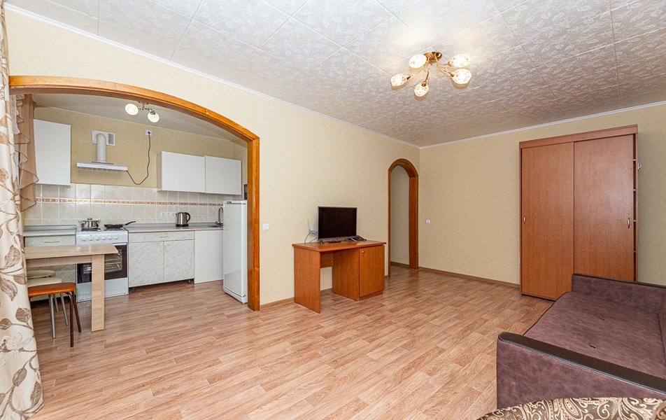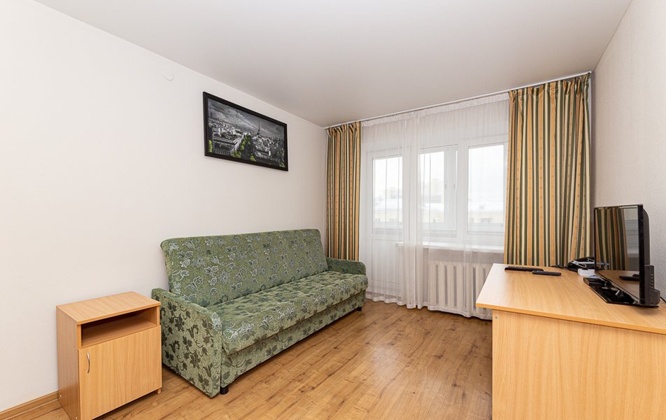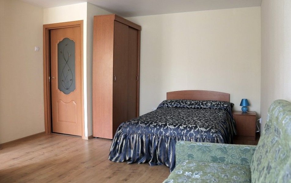 Апартаменты 1-местный Количество комнат: 1-комнатный Тип номера: Апартаменты Кол-во основных мест: 1 Мебель: вешалка, диван раскладной, зеркало, кровать полутороспальная, прикроватные тумбочки, стол, стулья, шкаф Оборудование: микроволновая печь, набор посуды, плита электрическая, стиральная машина, телевизор, телефон, холодильник, электрочайник Санузел: с ванной, туалетные принадлежности, фен Сервис: Wi-Fi бесплатно, услуги внутренней телефонной связи