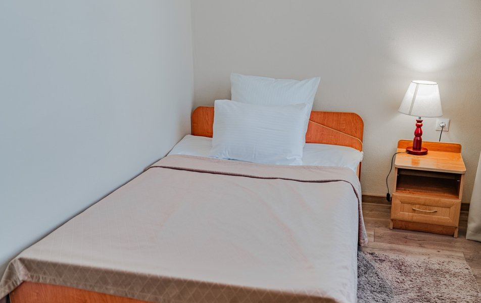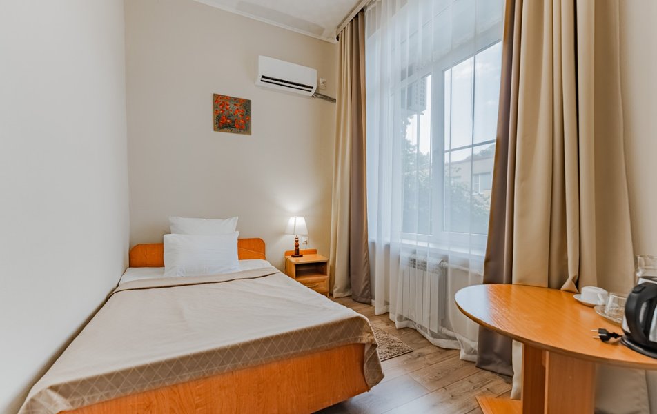Стандартный 1-местный 1-комнатный Количество комнат: 1-комнатный Тип номера: Стандартный Вид из номера: на двор Кол-во номеров: 6 Кол-во основных мест: 1 Площадь (кв. м): 19 Мебель: кресло, кровать полутороспальная, прикроватная тумбочка, столик журнальный, столик туалетный, шкаф Оборудование: кондиционер, телевизор, телефон, холодильник, чайный набор посуды, электрочайник Санузел: с душем, тапочки, туалетные принадлежности, фен, халат Сервис: Wi-Fi бесплатно, смена полотенец: ежедневно, кроме воскресенья, смена постельного белья: 1 раз в 3 дня, уборка номера: ежедневно, кроме воскресенья, услуги внутренней телефонной связи