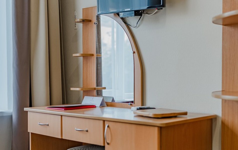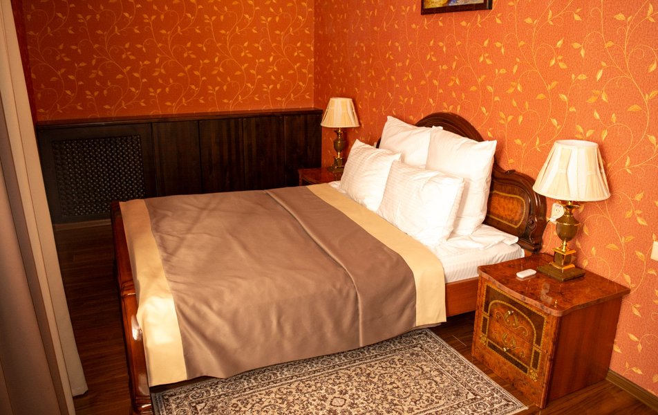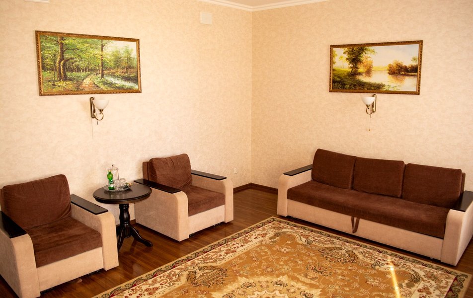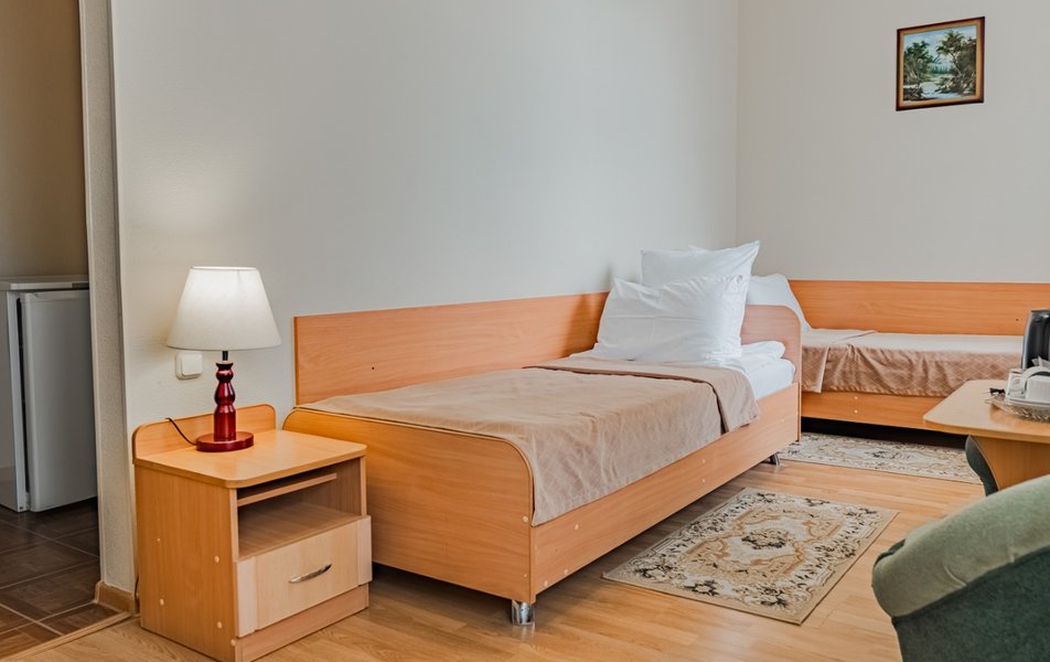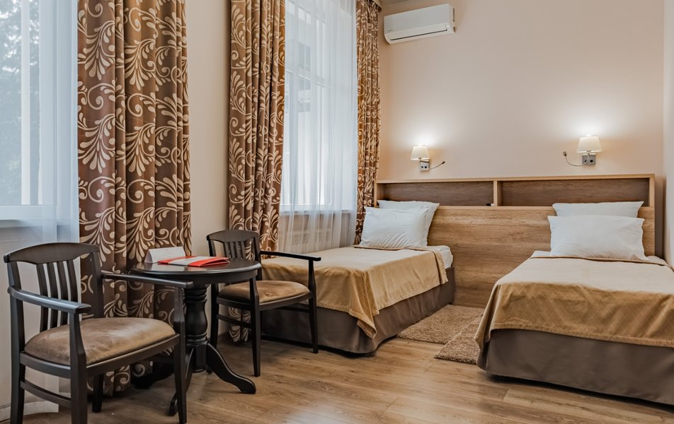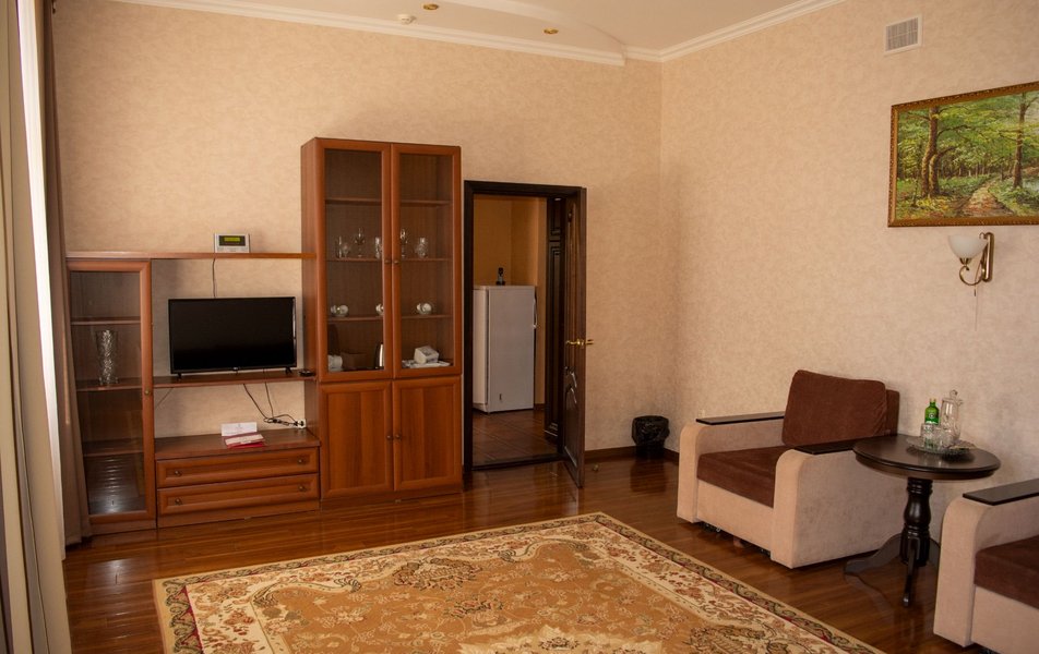 Люкс 2-местный 2-комнатный Количество комнат: 2-комнатный Тип номера: Люкс Дополнительное место: диван Вид из номера: на парк Кол-во основных мест: 2 Площадь (кв. м): 38-48 Мебель: диван, кресла, кровать двуспальная, прикроватные тумбочки, столик журнальный, столик туалетный, шкаф Оборудование: гладильная доска, сплит-система, телевизор, телефон, утюг, холодильник, чайный набор посуды, электрочайник Санузел: тапочки, туалетные принадлежности, фен, халат Сервис: Wi-Fi бесплатно, смена полотенец: ежедневно, кроме воскресенья, смена постельного белья: ежедневно, кроме воскресенья, уборка номера: ежедневно, кроме воскресенья, услуги внутренней телефонной связи