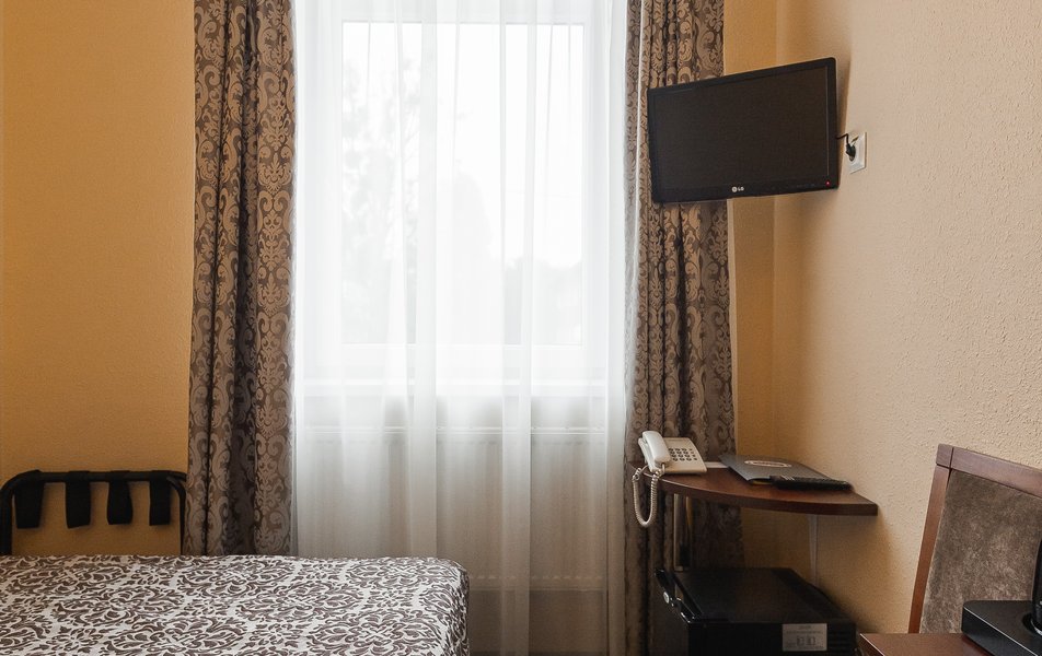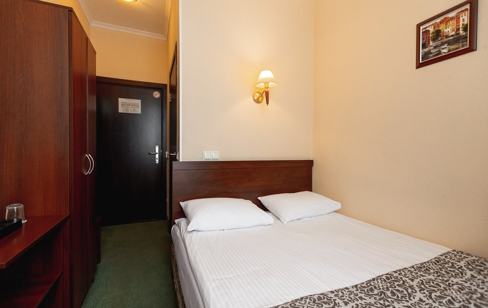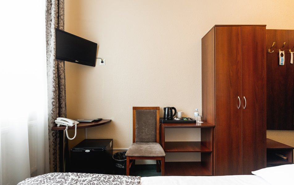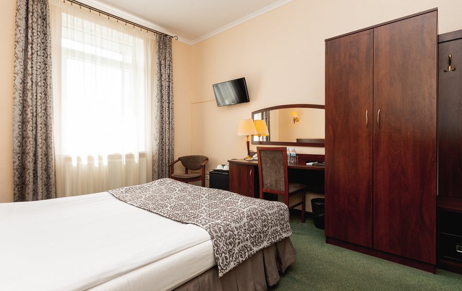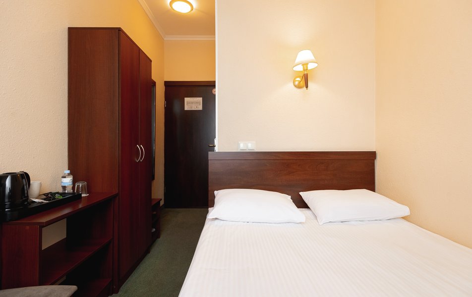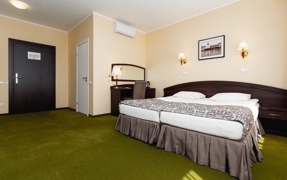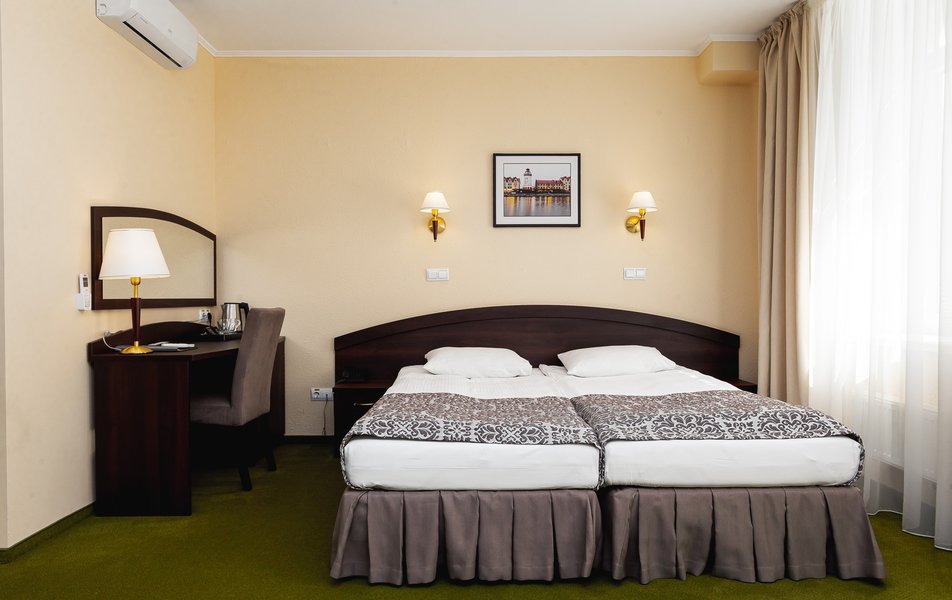 Доброго всем времени суток. Мы останавливались в этой гостиницы во время нашего путешествия по Калининграду. Мы сами ничего не выбирали и не бронировали, за нас это сделал наш туроператор. Наше заселение прошло быстро и мы отправились по номерам. Номер нам достался на четвёртом этаже. Сказать, что он маленький- это вообще ничего не сказать. Он просто мизерный! Никогда ещё не видали таких маленьких номеров. Он настолько маленький, что чтобы подойти к кровати нужно было отодвинуть в сторону стул. Окна номера выходили на дорогу и постоянно было слышно проезжающие мимо гостиницы машины. Порадовало наличие бутылочек с питевой водой, чайника, растворимого кофе и чая в пакетированного чая. Мелочь как говориться, а приятно. Ванная комната тоже не большая. Вместо ванной душевая со шторкой. Из гигиенических принадлежностей маленькое круглое мыло, гель для душа и шампунь. Набор полотенец заботливо был развешен на специальной полочке. Вся сантехника работала исправно. Перебоев с водой не было. Очень порадовало наличие фена. В номере, как и во всей гостинице, очень чисто! Отдельное спасибо горничным! Интерьер гостиницы выполнен в сине-белых тонах. На стенах, по всей гостиницы, развешены фотографии Калининграда разных эпох. В холле, возле лифтов устроена читальная зона, с уютными диванчиками и полками с книжками. Возле ресепшен сделана уютная зона отдыха со старинным пианино и баром. У входа небольшая витрина с сувенирами, которые при желании можно приобрести на память о Калининграде. Что нас очень огорчило даже больше чем мизерные номера, так это ресторан гостиницы. Он физически не вмещал всех гостей гостиницы. Чтобы попасть на завтрак нужно было сначала отстоять большую очередь к шведскому столу, а потом долго ждать пока появиться свободный столик. Персонал ресторана не справлялся с таким количеством постояльцев и нам приходилось долго ждать пока они принесут чисты ножи, вилки, ложки, посуду и еду. Очень не приятно- это реально напрягало. Приходилось буквально завтракать стоя. Да и ещё делать это побыстрее, чтобы не опоздать на автобус. Отвратительно! Этот отель из-за маленьких номеров и огромного количества народа в ресторане чуть не испортил всё впечатление о Калининграде.