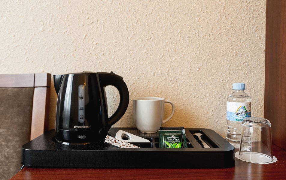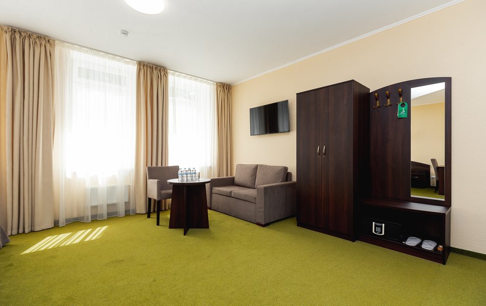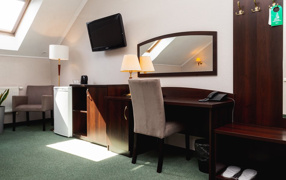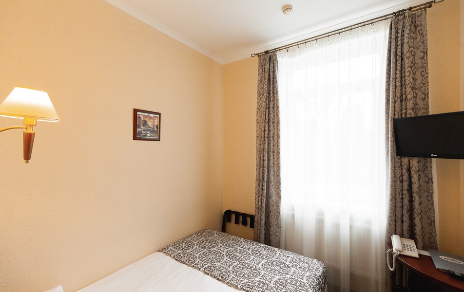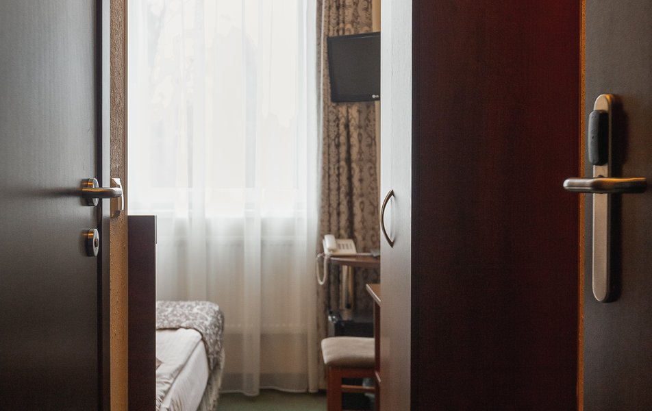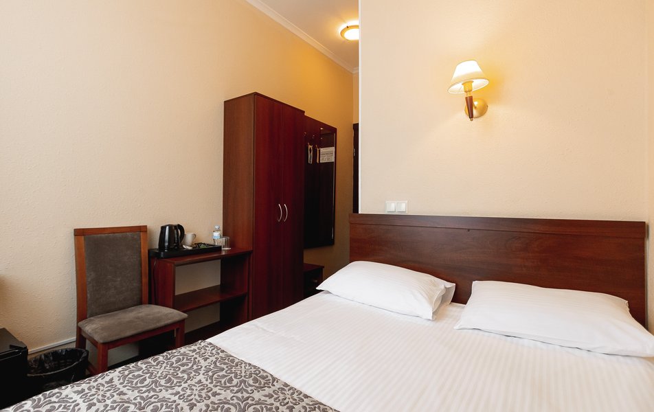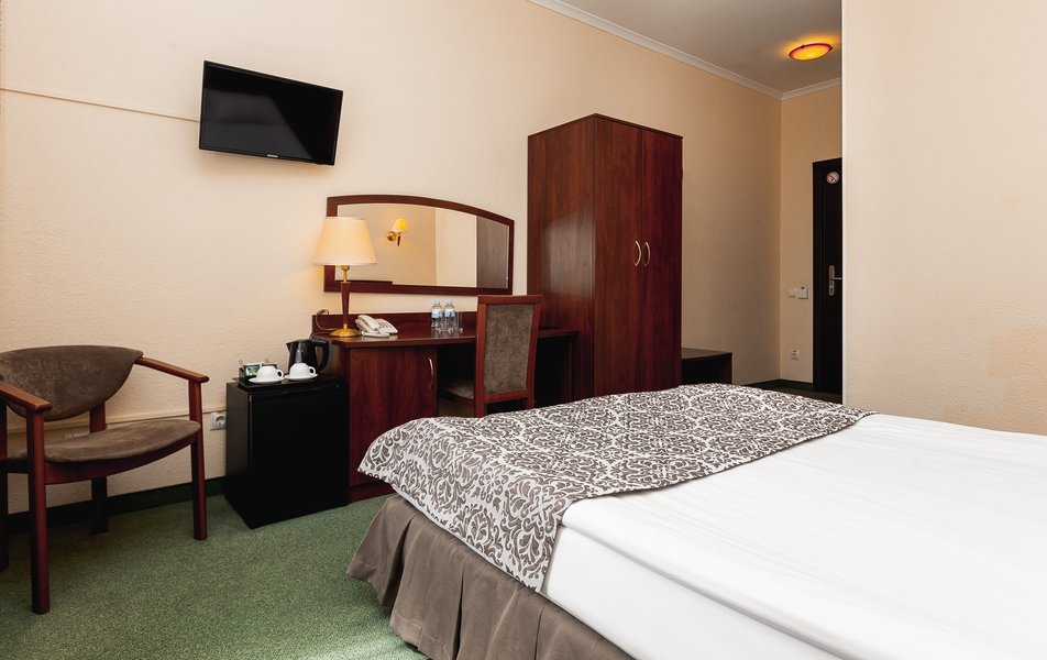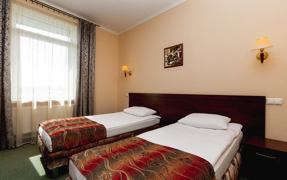 Доброго всем времени суток. Мы останавливались в этой гостиницы во время нашего путешествия по Калининграду. Мы сами ничего не выбирали и не бронировали, за нас это сделал наш туроператор. Наше заселение прошло быстро и мы отправились по номерам. Номер нам достался на четвёртом этаже. Сказать, что он маленький- это вообще ничего не сказать. Он просто мизерный! Никогда ещё не видали таких маленьких номеров. Он настолько маленький, что чтобы подойти к кровати нужно было отодвинуть в сторону стул. Окна номера выходили на дорогу и постоянно было слышно проезжающие мимо гостиницы машины. Порадовало наличие бутылочек с питевой водой, чайника, растворимого кофе и чая в пакетированного чая. Мелочь как говориться, а приятно. Ванная комната тоже не большая. Вместо ванной душевая со шторкой. Из гигиенических принадлежностей маленькое круглое мыло, гель для душа и шампунь. Набор полотенец заботливо был развешен на специальной полочке. Вся сантехника работала исправно. Перебоев с водой не было. Очень порадовало наличие фена. В номере, как и во всей гостинице, очень чисто! Отдельное спасибо горничным! Интерьер гостиницы выполнен в сине-белых тонах. На стенах, по всей гостиницы, развешены фотографии Калининграда разных эпох. В холле, возле лифтов устроена читальная зона, с уютными диванчиками и полками с книжками. Возле ресепшен сделана уютная зона отдыха со старинным пианино и баром. У входа небольшая витрина с сувенирами, которые при желании можно приобрести на память о Калининграде. Что нас очень огорчило даже больше чем мизерные номера, так это ресторан гостиницы. Он физически не вмещал всех гостей гостиницы. Чтобы попасть на завтрак нужно было сначала отстоять большую очередь к шведскому столу, а потом долго ждать пока появиться свободный столик. Персонал ресторана не справлялся с таким количеством постояльцев и нам приходилось долго ждать пока они принесут чисты ножи, вилки, ложки, посуду и еду. Очень не приятно- это реально напрягало. Приходилось буквально завтракать стоя. Да и ещё делать это побыстрее, чтобы не опоздать на автобус. Отвратительно! Этот отель из-за маленьких номеров и огромного количества народа в ресторане чуть не испортил всё впечатление о Калининграде.