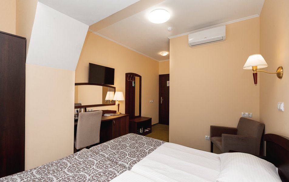 Хорошо, что было всего две ночи. Перетерпела: крохотный двухместный номер, все пространство которого занимает огромная кровать. Если в номере будут жить двое, то им даже не хватит места постоять рядом. Окно комнаты выходит на трассу , чрезвычайно оживленную до поздней ночи. По ней на десятке автобусов можно доехать до центра или дойти по узкому тротуару до Южного вокзала. Завтрак стандартный, но невкусный, жидкий кофе надо наливать из титана. Овощей нет, кроме нарезанного заветренного салата с редким вкраплением перца и огурца. Очень неудобная для людей с чемоданами входная зона, высокое крутое крыльцо, с пандуса для багажа багаж падает. Ну и для курящих гуманно было бы поставить во дворе лавочку или пару-тройку пластмассовых кресел. Но парковочная зона большая, так что автомобилистам удобно. Поздно уже, но посмотрела — за ту же цену можно найти отель посимпатичнее, в буквальном и переносном смысле этого определения.
