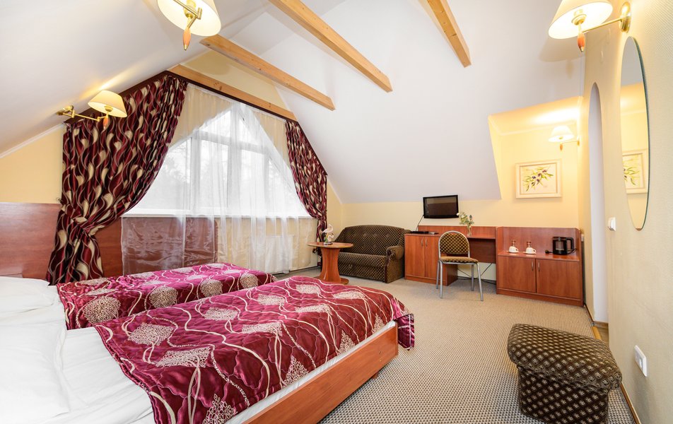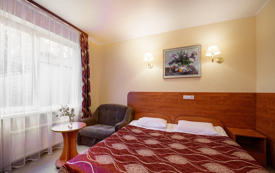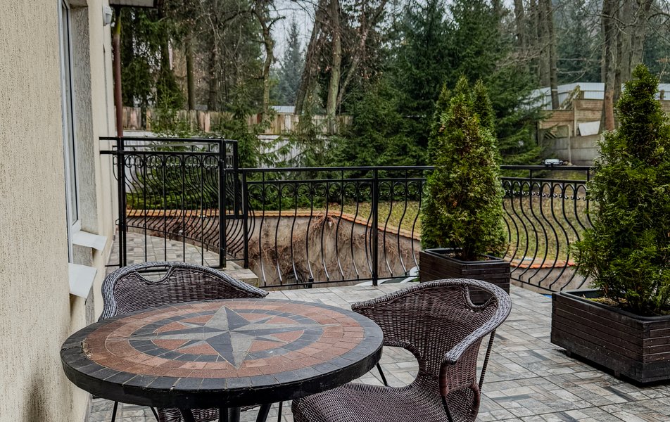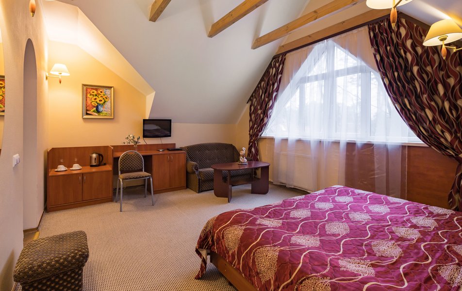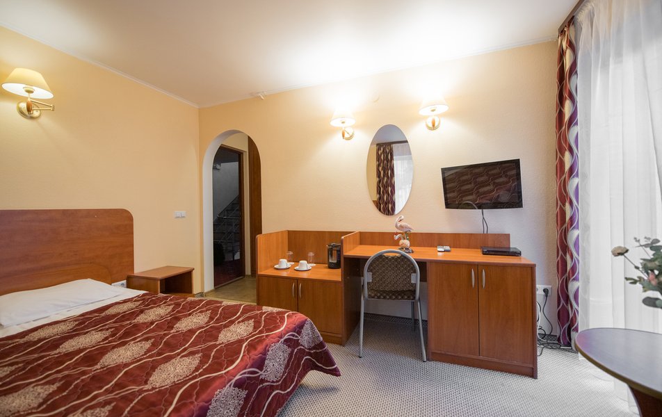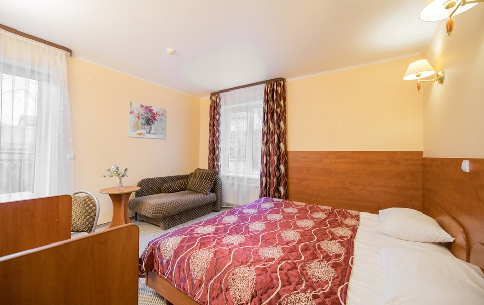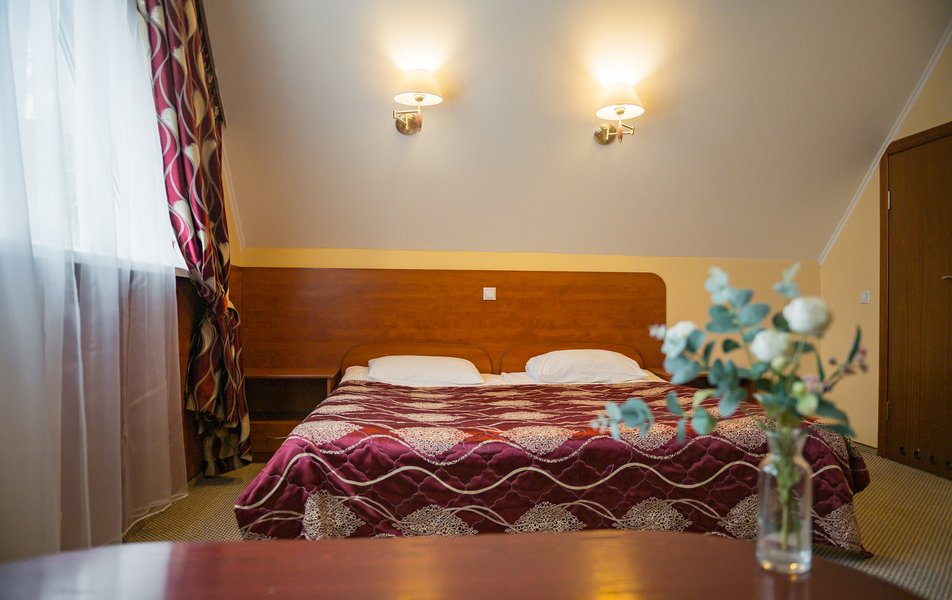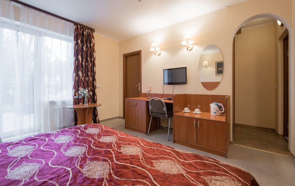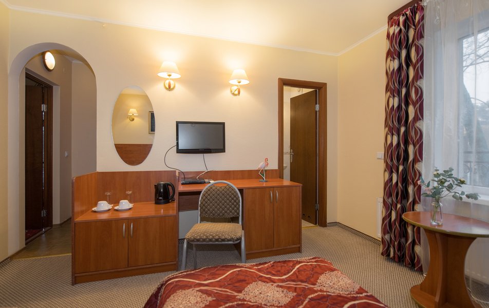 Это мини-отель, при этом очень компактный, красивый и удачно расположенный по отношению к тем достопримечательностям, что так важны гостям Светлогорска. Близость к ж.д. станции "Светлогорск-2" не влияет на тишину, царящую в этом милом уголке города. Снимали полу-люкс, на 2 этаже. Мне было очень приятно, что в нем две комнаты, два балкона, прекрасный матрас (с моими протрузиями и грыжами это очень важно) на котором я спала глубоким сном и без болей просыпалась! Есть телевизор, телефон, холодильник, фен, диван в гостиной, освещение можно подстраивать под нужды. Отметим еще воду - она настолько мягкая, что я лишений раз зале зала в душ. Завтраки готовят по вашему выбору из меню и договору с вечера. Персонал приветливый, заботливый, нет недостатков))) Мы за 4 ночи отдохнули как за месяц в санатории. Есть в самом отеле и сауна, что актуально для зимних месяцев, и бильярд.