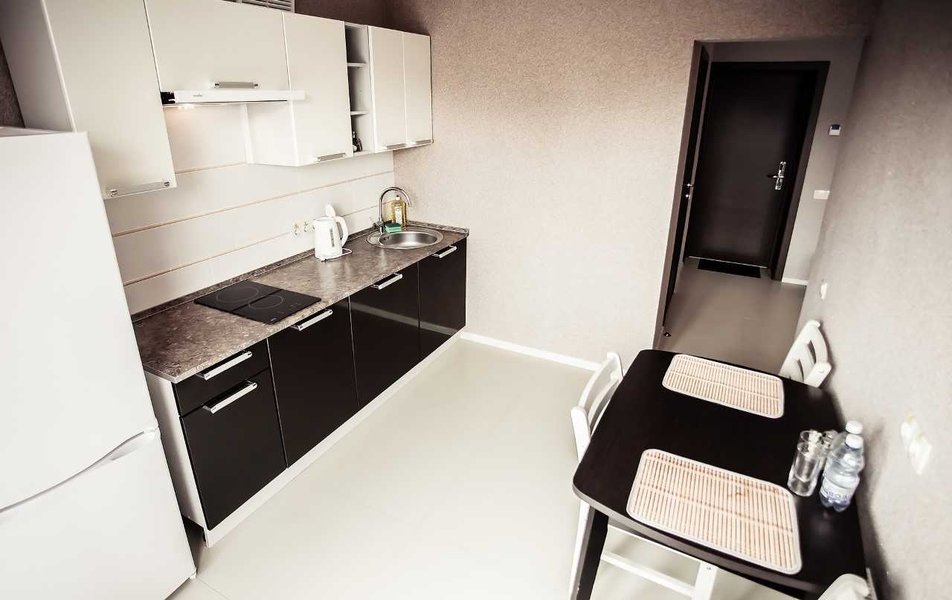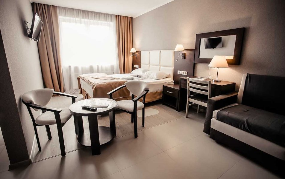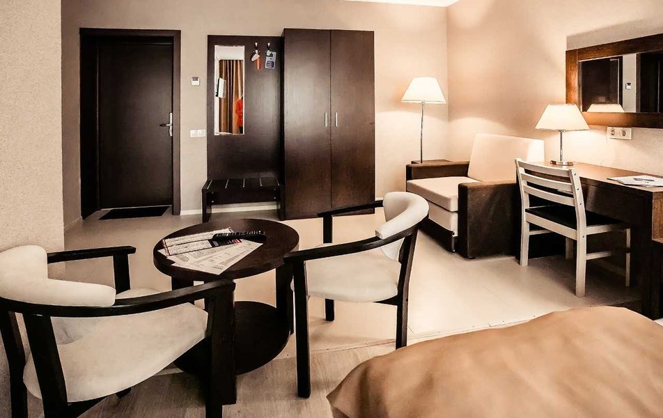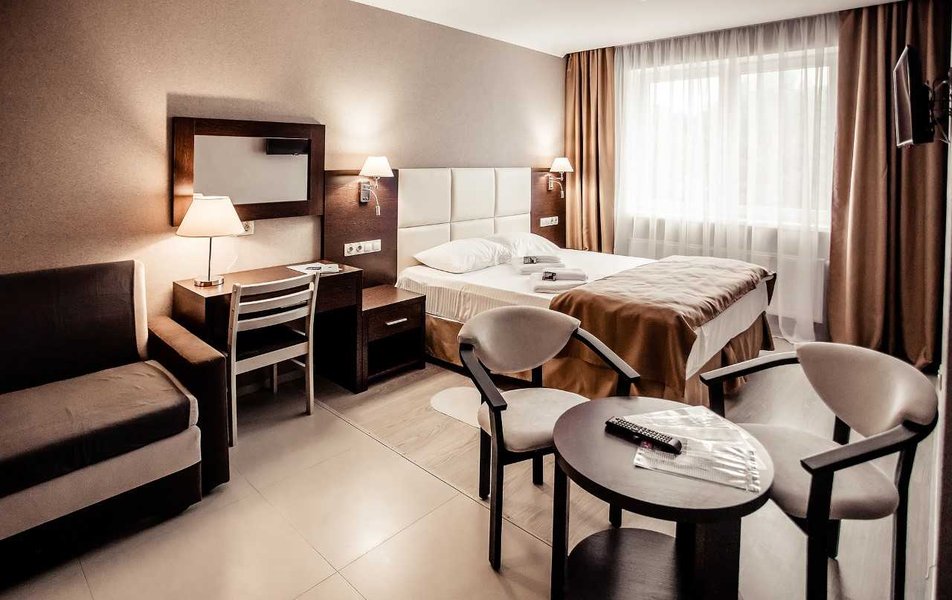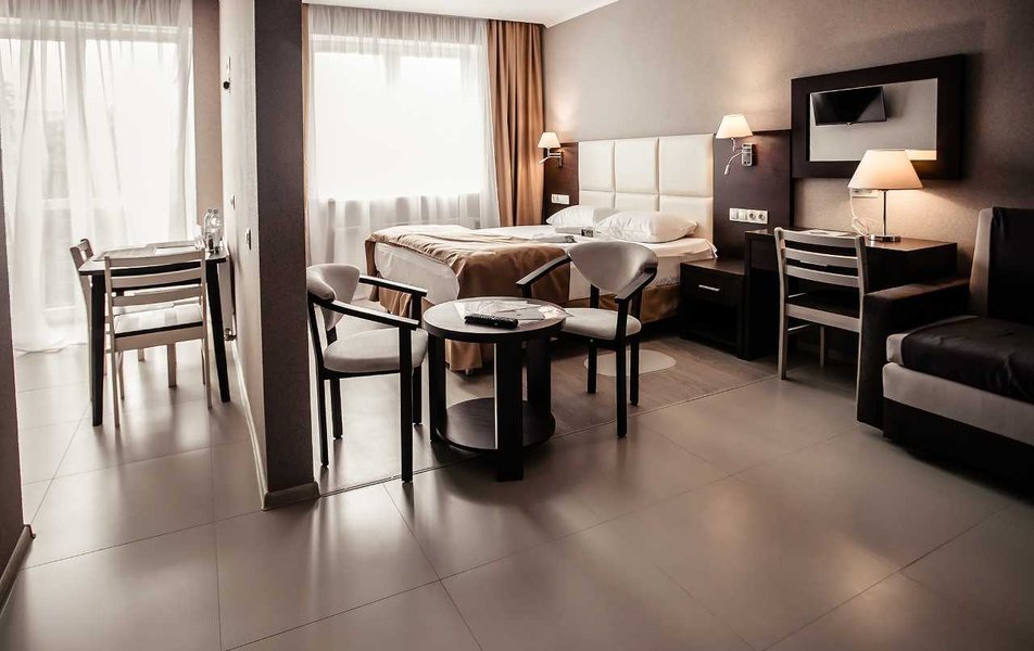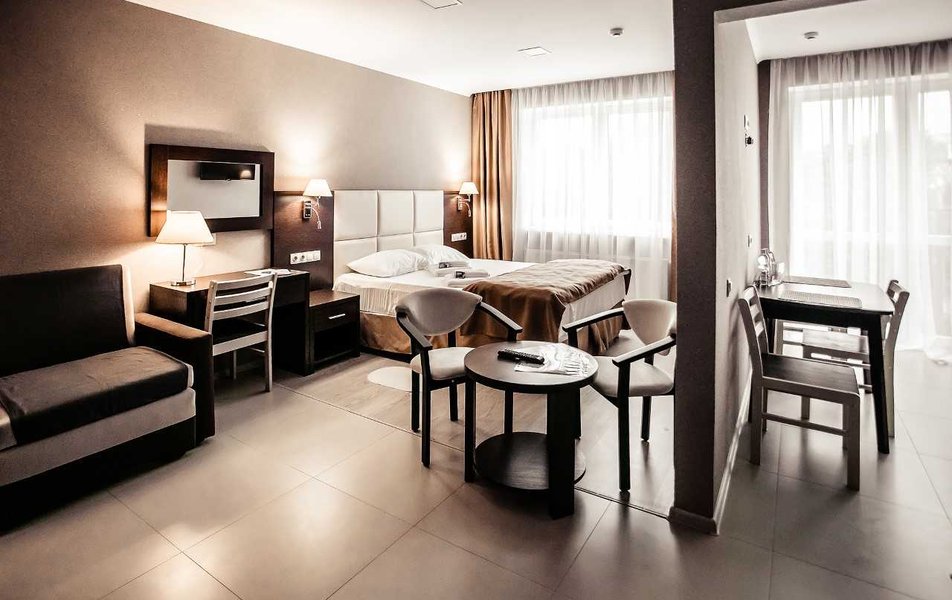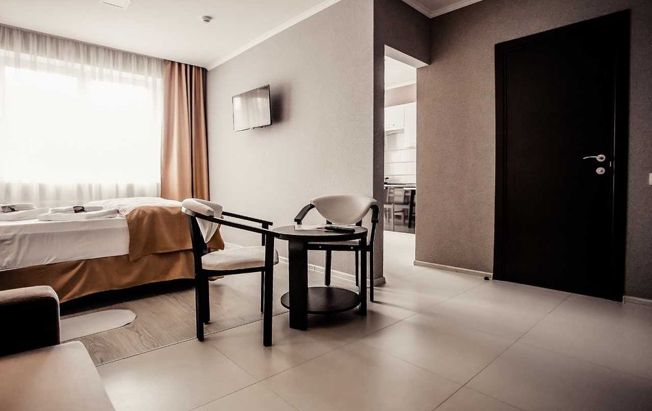 Отдыхали вдвоем с женой. Отличная гостиница формата апарт-отель. Три этажа, 18 номеров формата небольшой однокомнатной квартиры. Номер состоит из основного помещения и отделенной стеной, но без двери, полноценной кухни - в наличии подвесные шкафчики, набор посуды, включающий разные тарелки, кружки, чашки поменьше, пивные бокалы, бокалы для вина, столовые приборы, сковороду, кастрюлю. Есть также ножи, один подлиннее, другой покороче, шумовка. Из оборудования - электрическая двухкомфорочная панель с вытяжкой, микроволновка, электрочайник, двухкамерный холодильник. Стол, четыре стула, на столе перечница/солонка, коврики. В шкафчиках нашлись пачка соли двух видов, сахар в емкости с дозатором (такие ставят в кофейнях на столиках). Все чисто, уютно, функционально, очень по-домашнему, нет ощущения "казенного", для тех, кто любит с утра пораньше посидеть на кухне - самое то, да и потом - есть все, чтобы что-то полноценно что-то приготовить/разогреть, если по какой-либо причине вы не идете куда-то питаться за пределы отеля. Еще из оборудования - напольный вентилятор. Мне не хватало, пожалуй, только тостера, но это индивидуально, всего по таким мелочам не предусмотришь. Продолжая бытовую тему, следует обязательно отметить, что постирать-погладить что-то тут можно бесплатно, стиральные машины расположены в специальной комнате, утюги и гладильные доски - на каждом этаже. Для сушки белья - типовые раскладные козлы, они в комплекте в номере. Кроме того, есть массажное кресло (на этаже). В основной части номера - просторно, мебель вся аккуратная, конечно гостиничный стиль в ней чувствуется, но минимально, все функционально и в полном порядке. Итак, от окна по периметру: кровати (в описываемом номере две раздельные), прикраватные тумбочнки, далее, вдоль стены - стол с большим выдвижным ящиком, перед лицом - зеркало, стул, далее - широкое кресло (было похоже на раскладное, но, честно говоря, не пробовали), далее еще одна тумбочка, торшер и на тумбочке настольный светильник. У двери двустворчатый шкаф, разделен на три секции, одна с полками, другая с вешалками-плечиками для одежды и третья внизу - ниша для чемодана или обуви. Вешалки со съемным креплением крюка. На одной из полок - сейф. Далее левее - секция с зеркалом и двумя крюками для одежды. Можно спокойно присесть, чтобы снять/надеть обувь, или использовать как место, куда положить чемодан (если их больше одного) Из мелочей в наличии рожок для обуви и щетка для одежды. Обходим периметр с другого конца: от угла кровати вдоль окон направо (напротив кроватей) - журнальный столик и сверху на стене телевизор. Для тех, кому интересно - два HDMI, один USB, один 3,5 выход на наушники. USB поддерживает даже большие носители (подключил 4 Тб съемный диск с фильмами, все открывается и воспроизводится) Телевизор с каналами не пробовал, т.к. давно не смотрю эфирные каналы. На кухне на такой же стойке - второй телевизор, но там, к сожалению USB нет, видимо, модель попроще, поэтому даже не включал. Освещения хватает, есть две пары встроенных в потолок светильников, можно включить либо одну, либо все. Выключить верхний свет можно с любого из выключателей (в наличии их три пары - у каждой кровати и близ двери). Очень удобно. У каждой кровати есть также прикроватный свет. Состоит из пары светильников - одни классический "ночник" с абажуром, второй - светодио
