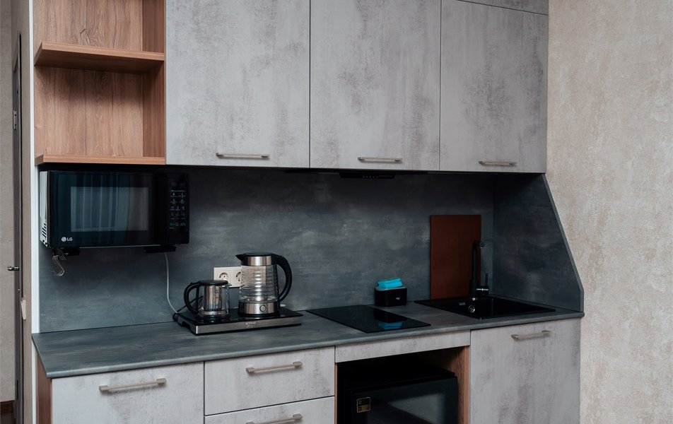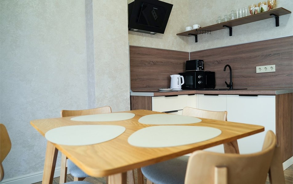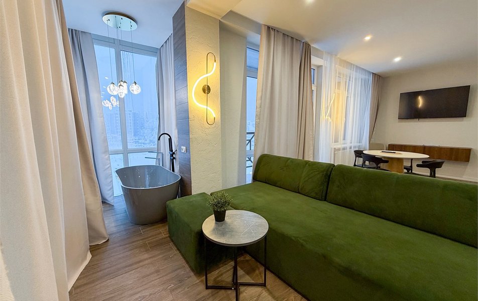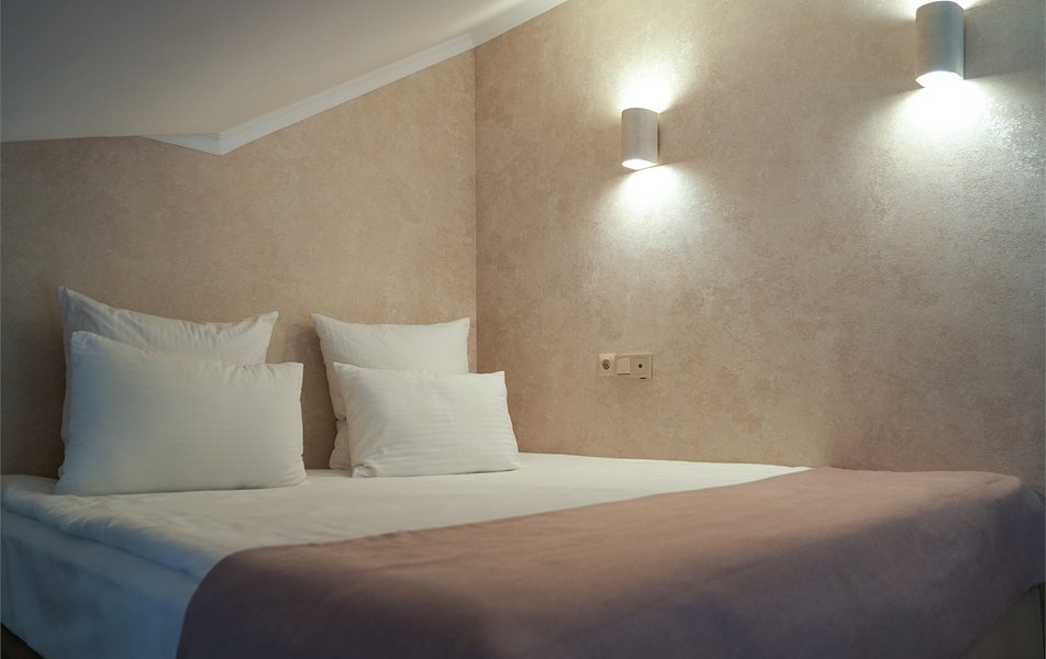 Люкс 2-местный 2-комнатный 2-уровневый Количество комнат: 2-комнатный Тип номера: Люкс Кол-во доп. мест: 2 Кол-во основных мест: 2 Площадь (кв. м): 50 Мебель: вешалка, диван, зеркало, кровать двуспальная, прикроватные тумбочки, стол, стулья, шкаф Оборудование: микроволновая печь, набор посуды, плита электрическая, телевизор, холодильник, чайный набор посуды, электрочайник Санузел: с душем, туалетные принадлежности, фен Сервис: Wi-Fi бесплатно, смена полотенец, смена постельного белья, уборка номера