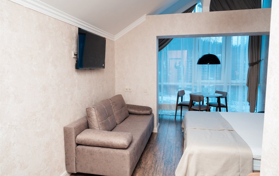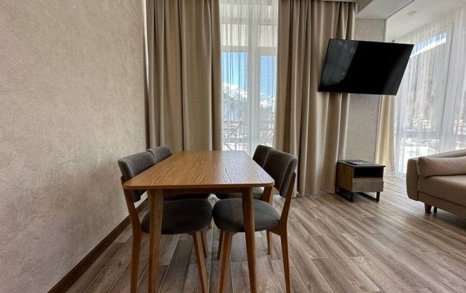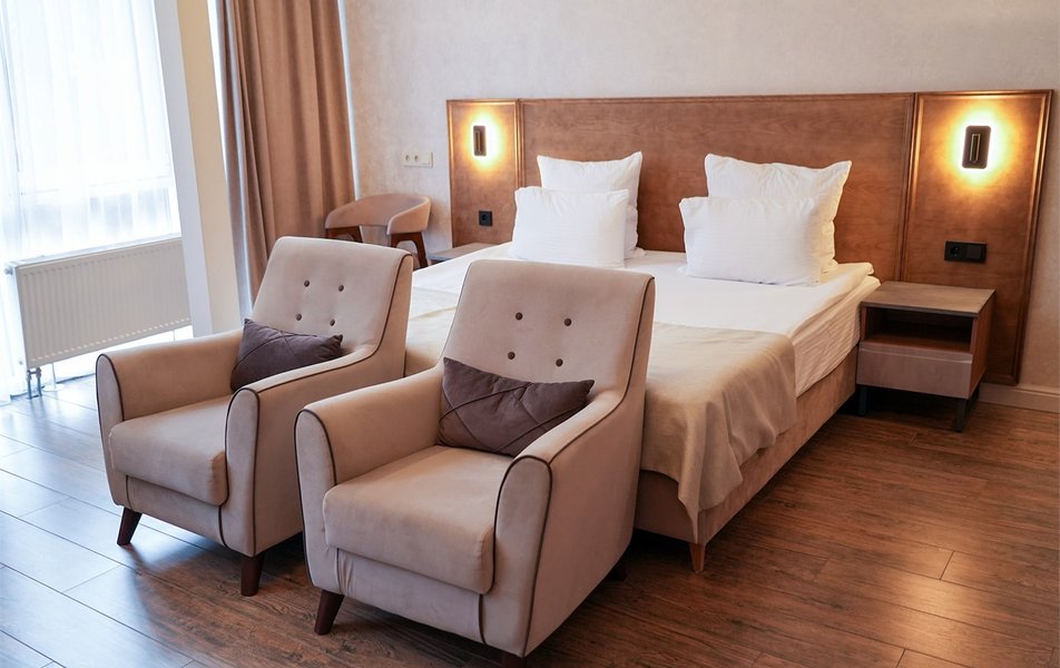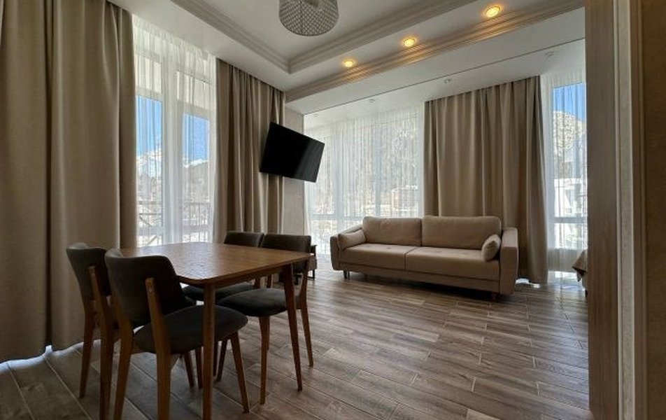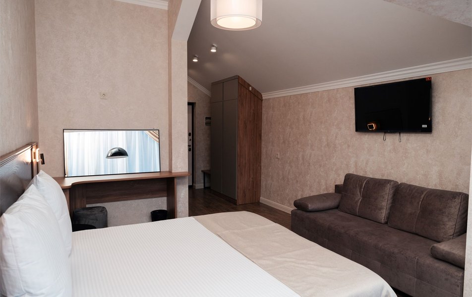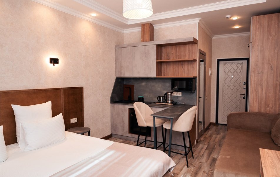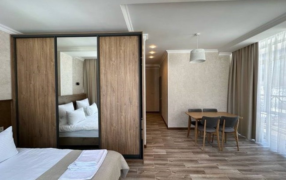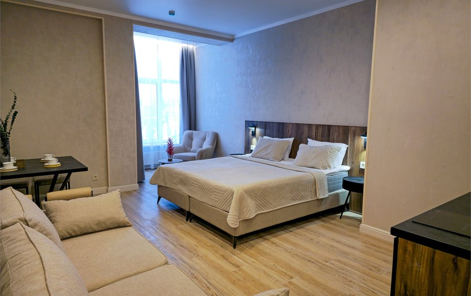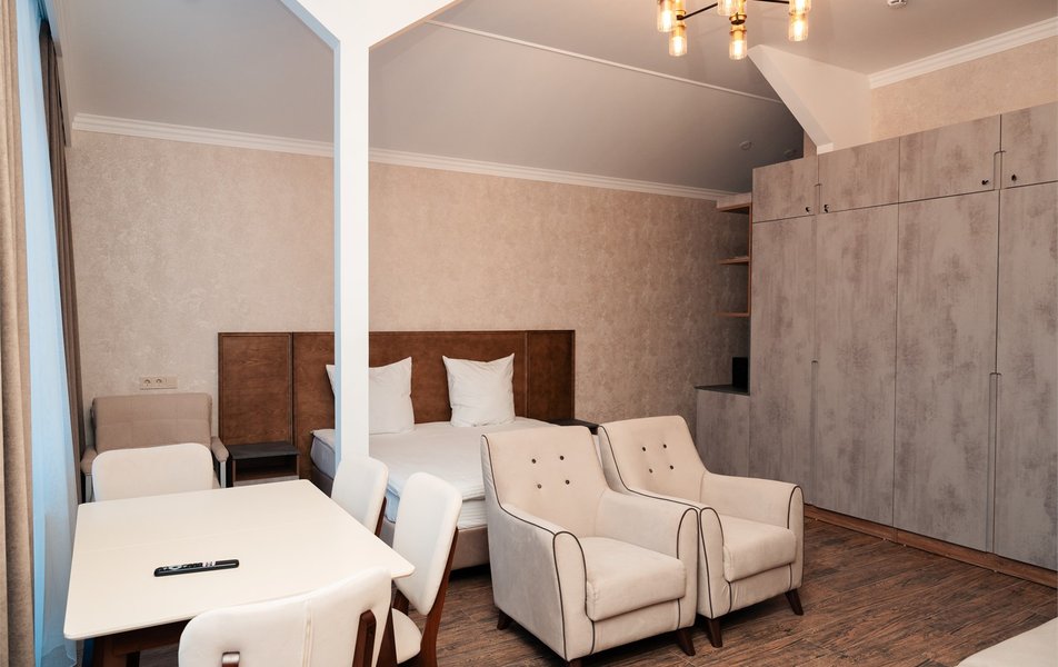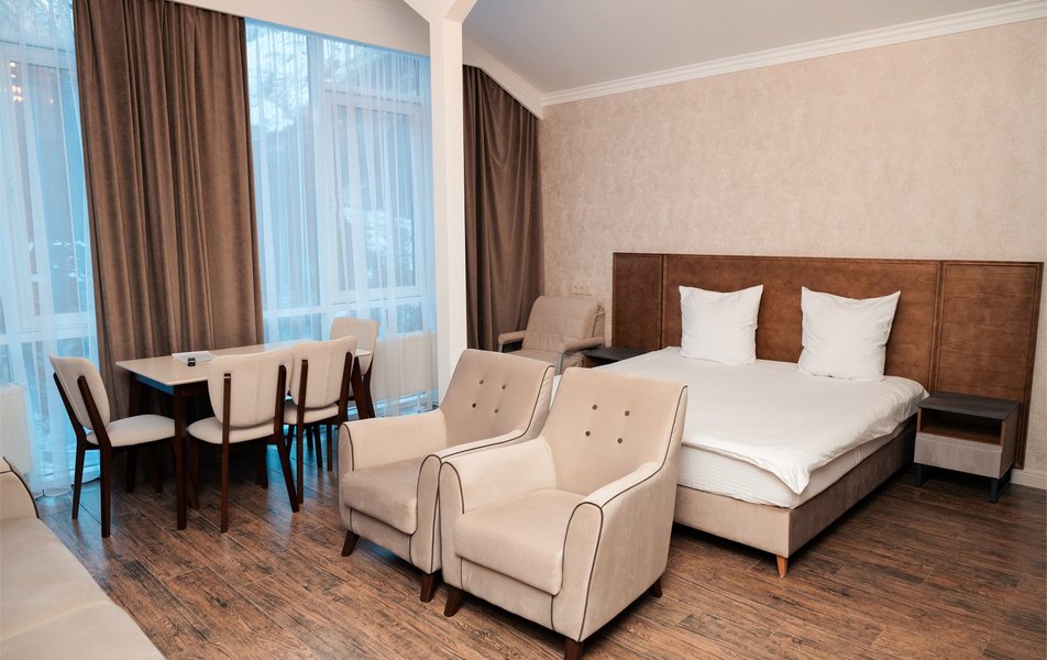 Люкс 2-местный 2-комнатный Количество комнат: 2-комнатный Тип номера: Люкс Кол-во доп. мест: 4 Кол-во основных мест: 2 Площадь (кв. м): 42 Мебель: вешалка, диван, зеркало, кровать двуспальная, прикроватные тумбочки, стол, стулья, шкаф Оборудование: микроволновая печь, набор посуды, плита электрическая, телевизор, холодильник, чайный набор посуды, электрочайник Санузел: с душем, туалетные принадлежности, фен Сервис: Wi-Fi бесплатно, смена полотенец, смена постельного белья, уборка номера