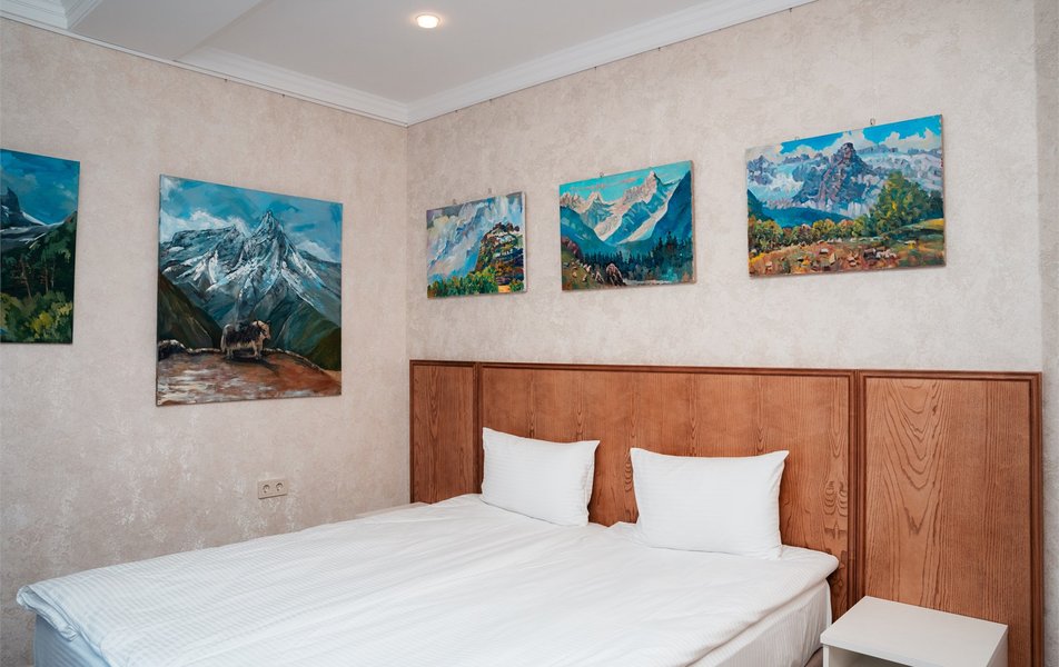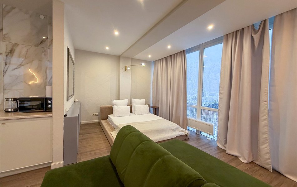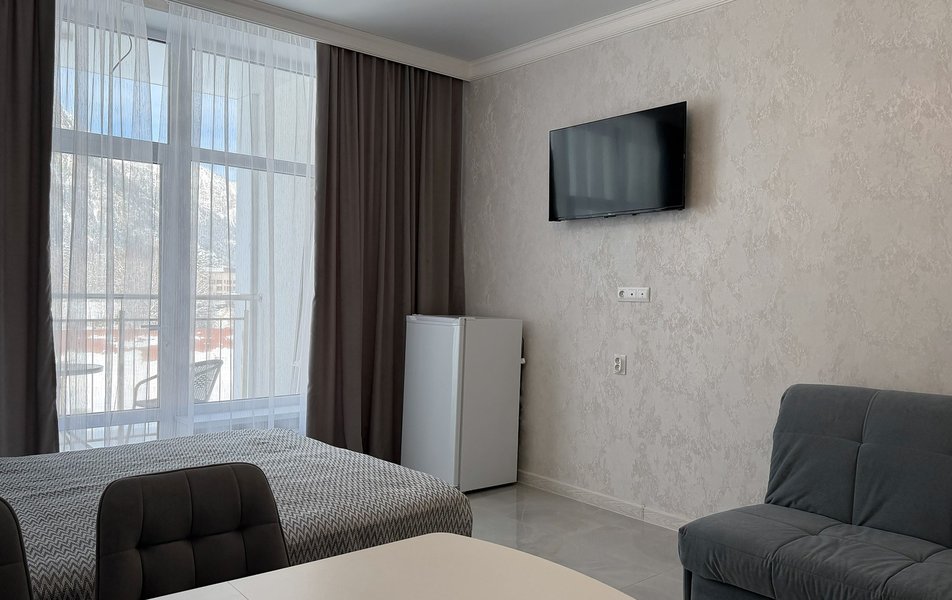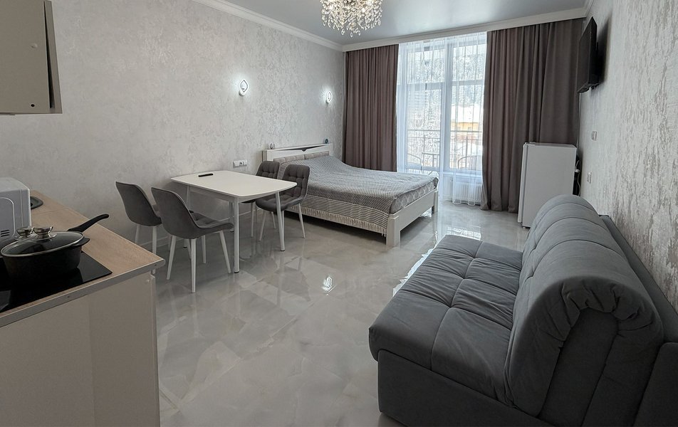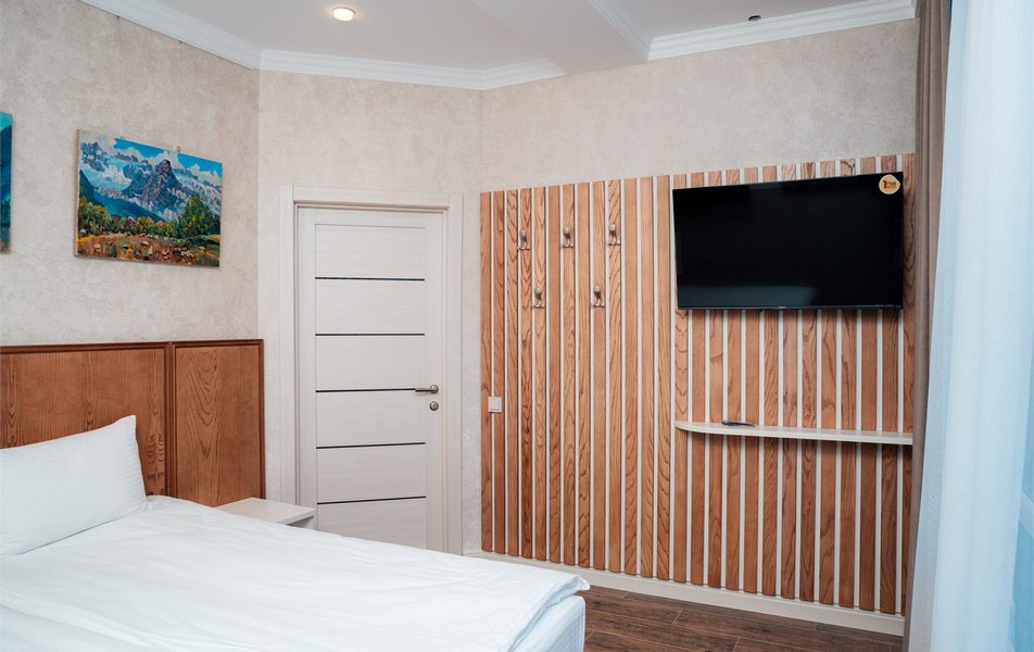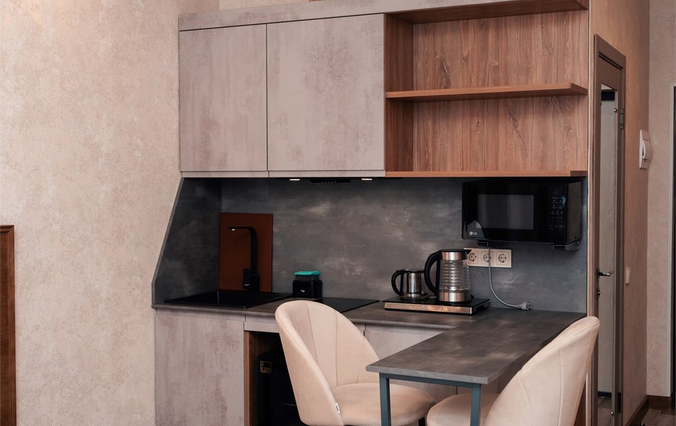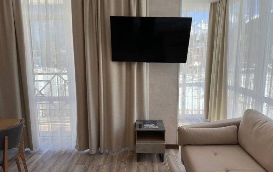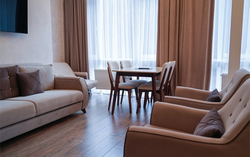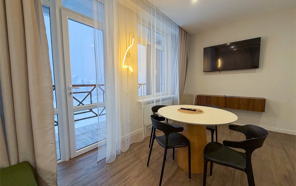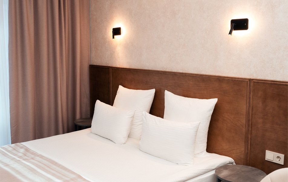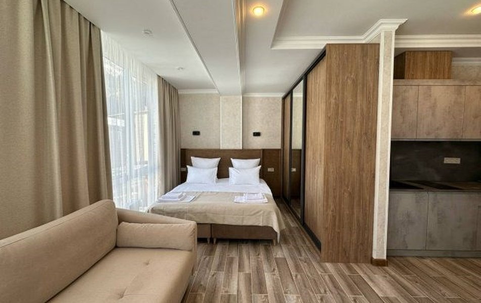 Люкс 2-местный 2-комнатный Количество комнат: 2-комнатный Тип номера: Люкс Кол-во доп. мест: 4 Кол-во основных мест: 2 Площадь (кв. м): 42 Мебель: вешалка, диван, зеркало, кровать двуспальная, прикроватные тумбочки, стол, стулья, шкаф Оборудование: микроволновая печь, набор посуды, плита электрическая, телевизор, холодильник, чайный набор посуды, электрочайник Санузел: с душем, туалетные принадлежности, фен Сервис: Wi-Fi бесплатно, смена полотенец, смена постельного белья, уборка номера