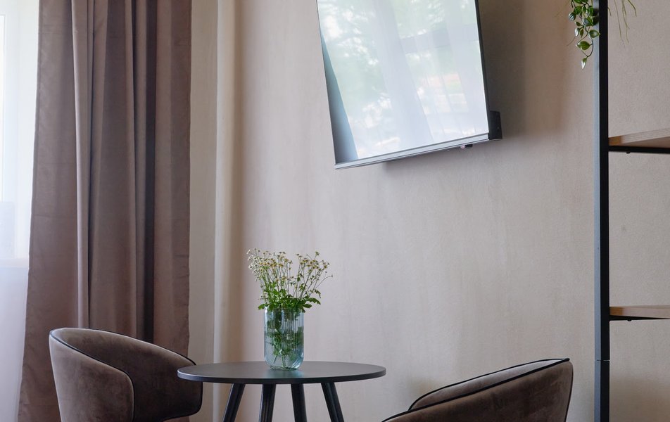 Номер 2-местный 1-комнатный (TWIN) Количество комнат: 1-комнатный Тип номера: Апартаменты Вид из номера: на двор Кол-во основных мест: 2 Площадь (кв. м): 25 Мебель: вешалка, зеркало, кровати односпальные, прикроватные тумбочки, стол, стулья, шкаф Оборудование: телевизор ЖК, чайный набор посуды, электрочайник Санузел: с душем, туалетные принадлежности, фен Сервис: Wi-Fi бесплатно, смена полотенец, смена постельного белья, уборка номера