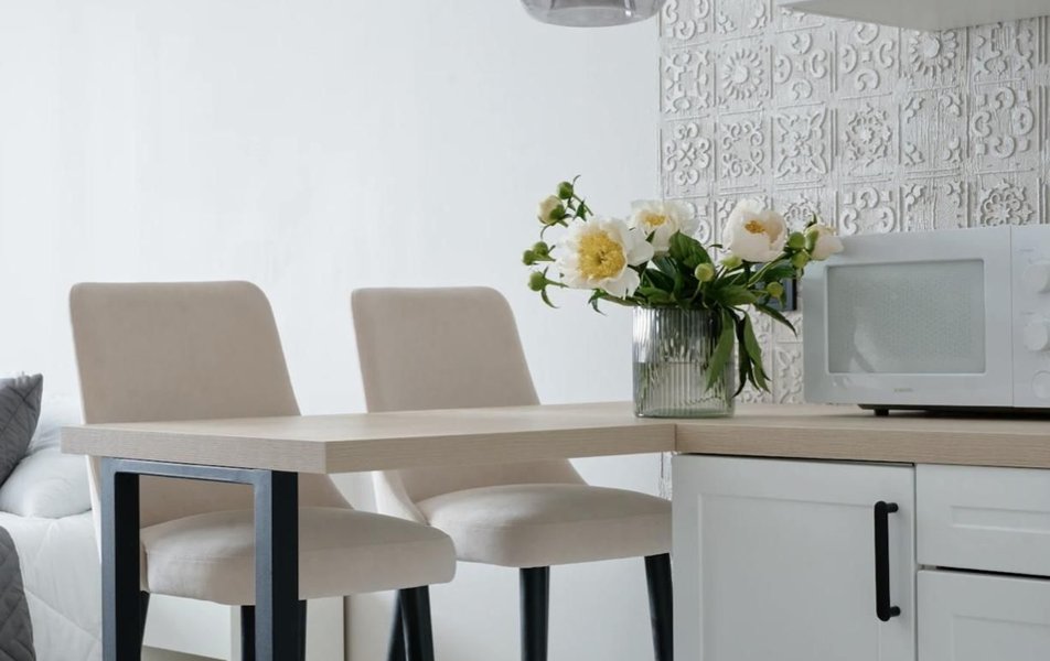 Номер 2-местный 1-комнатный (Лофт с кухней) Количество комнат: 1-комнатный Тип номера: Апартаменты Вид из номера: на двор Кол-во основных мест: 2 Площадь (кв. м): 28 Мебель: вешалка, зеркало, кровать двуспальная, стол, стулья, шкаф Оборудование: микроволновая печь, мини-холодильник, набор посуды, плита электрическая, телевизор ЖК, чайный набор посуды, электрочайник Санузел: с душем, туалетные принадлежности, фен Сервис: Wi-Fi бесплатно, смена полотенец, смена постельного белья, уборка номера