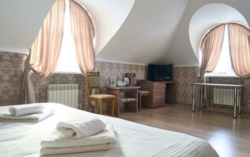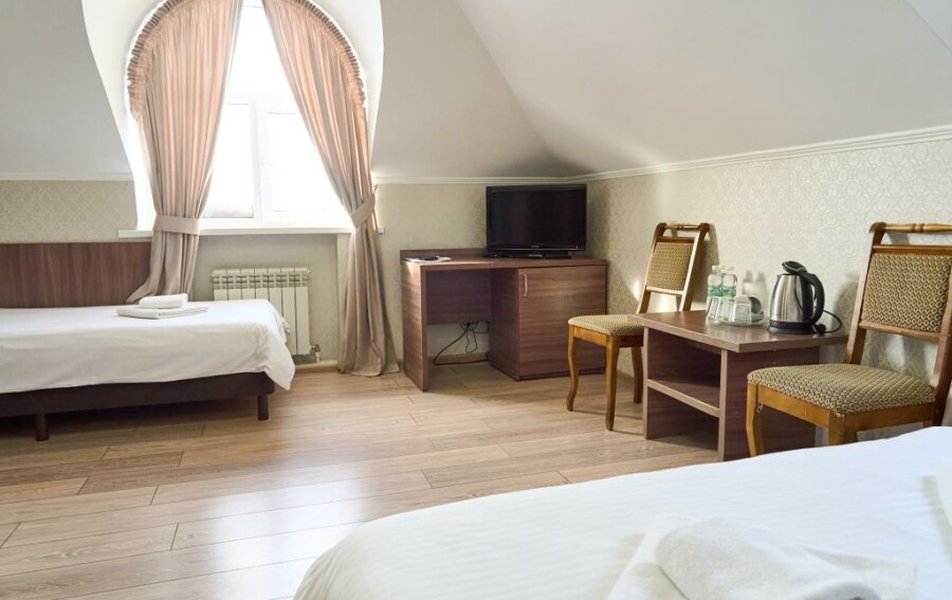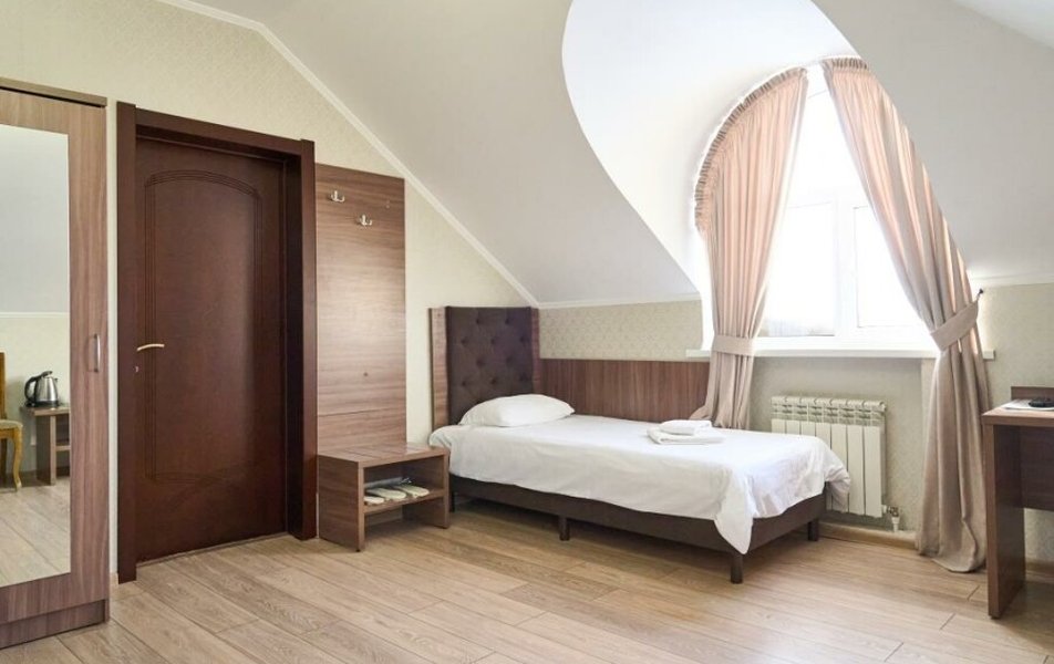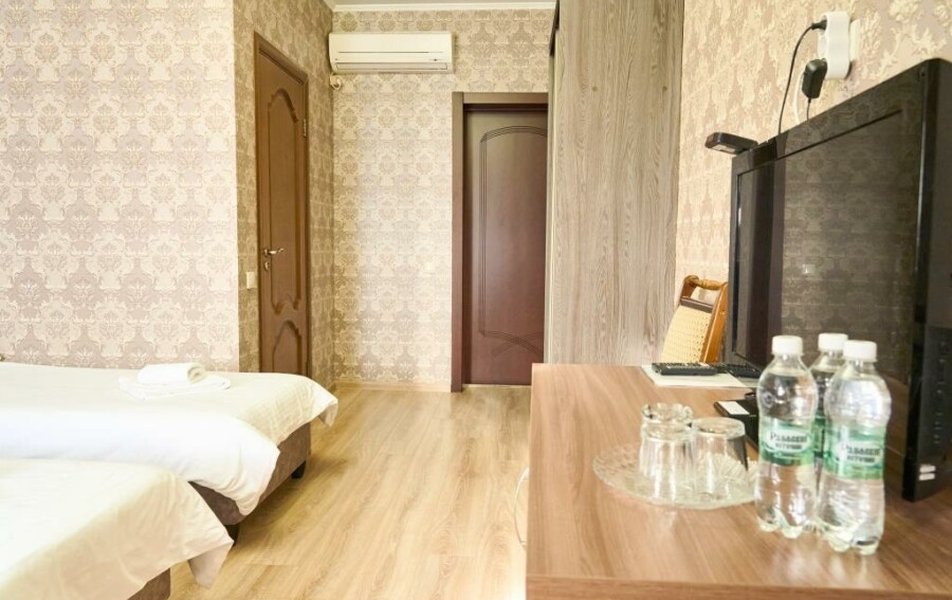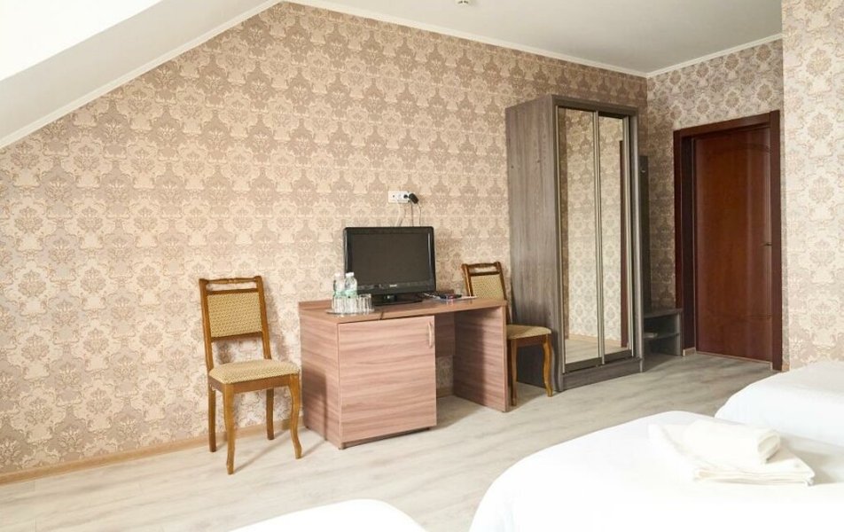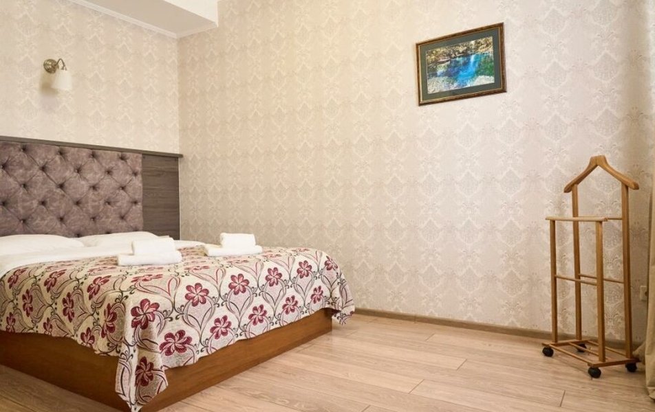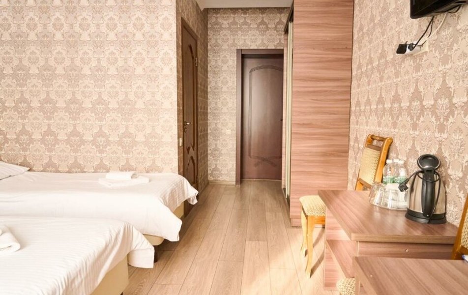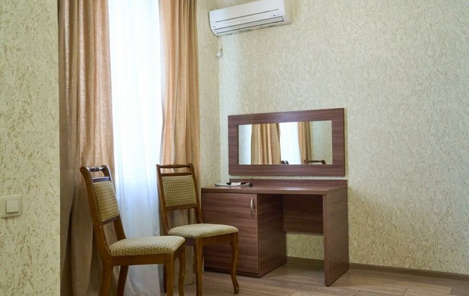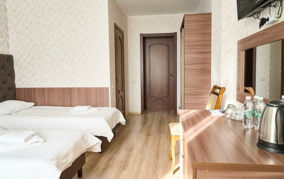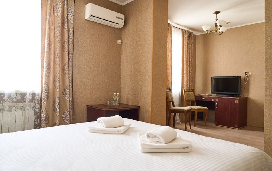 Полулюкс 2-местный (с ванной) Количество комнат: 1-комнатный Тип номера: Полулюкс Кол-во основных мест: 2 Площадь (кв. м): 25 Мебель: вешалка, зеркало, кровать двуспальная, прикроватные тумбочки, стол, стулья, шкаф Оборудование: кондиционер, телевизор, телефон Санузел: с ванной, туалетные принадлежности, фен Сервис: Wi-Fi бесплатно, смена полотенец, смена постельного белья, уборка номера