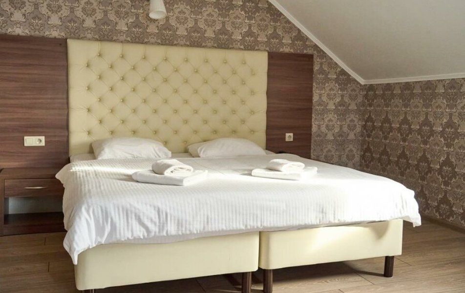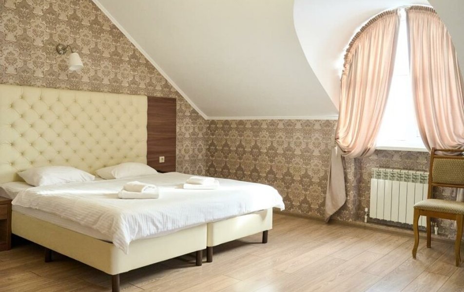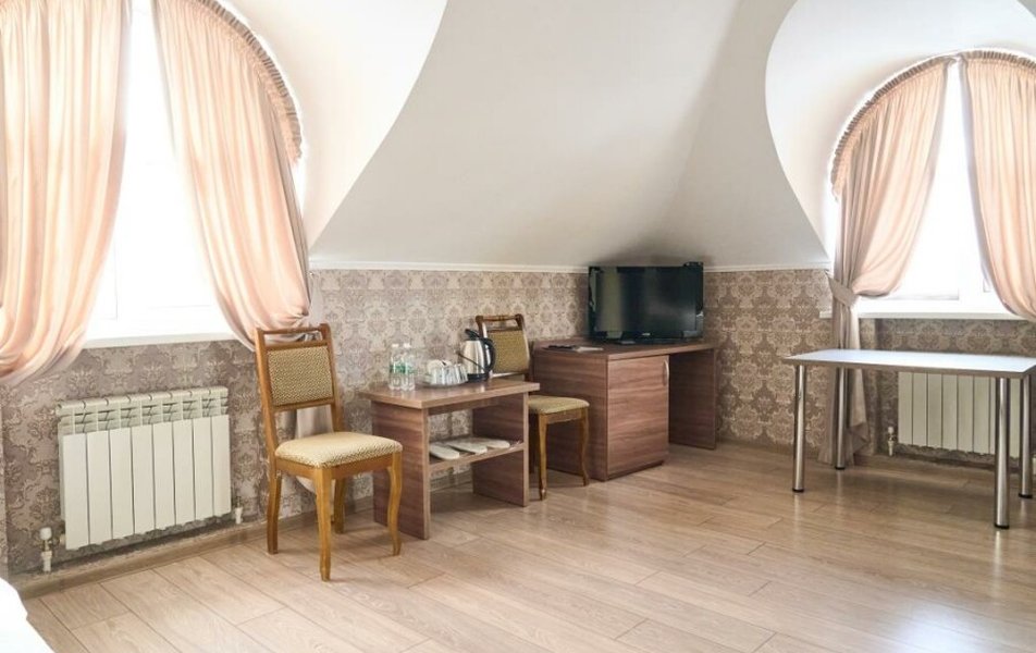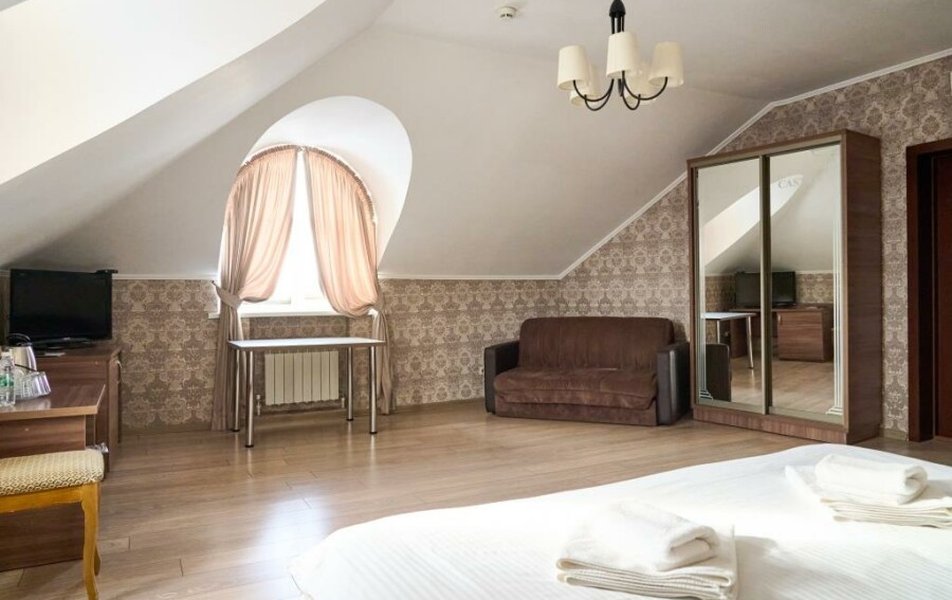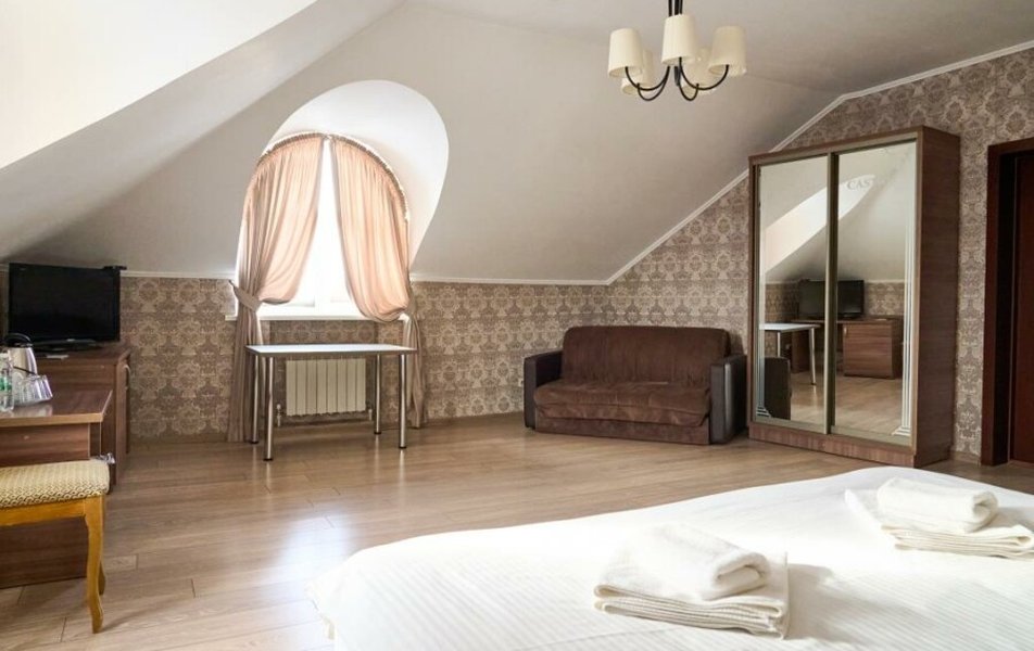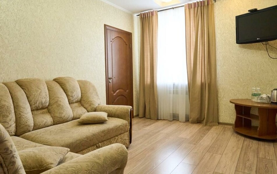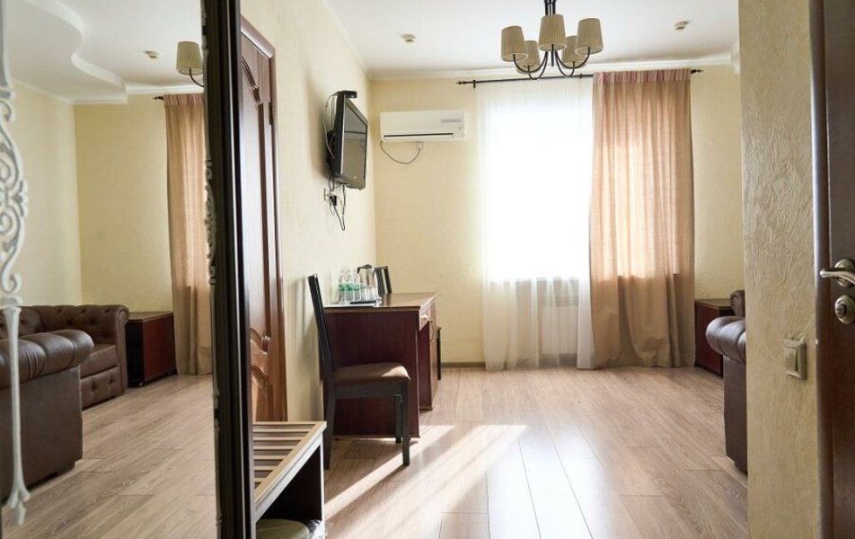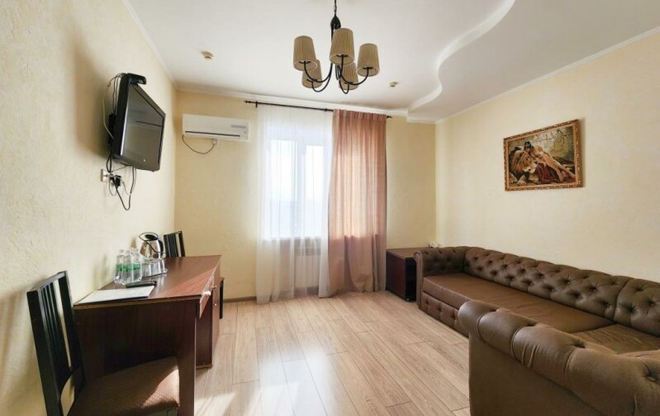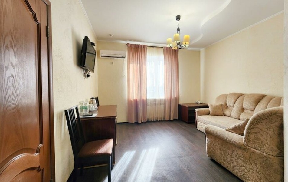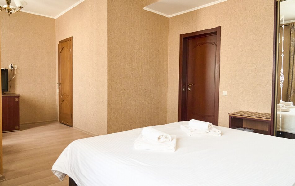 Люкс 2-местный 2-комнатный Количество комнат: 2-комнатный Тип номера: Люкс Кол-во доп. мест: 2 Кол-во основных мест: 2 Площадь (кв. м): 35 Мебель: вешалка, диван раскладной, зеркало, кровать двуспальная, прикроватные тумбочки, стол, стулья, шкаф Оборудование: кондиционер, телевизор, телефон Санузел: с душем, туалетные принадлежности, фен Сервис: Wi-Fi бесплатно, смена полотенец, смена постельного белья, уборка номера