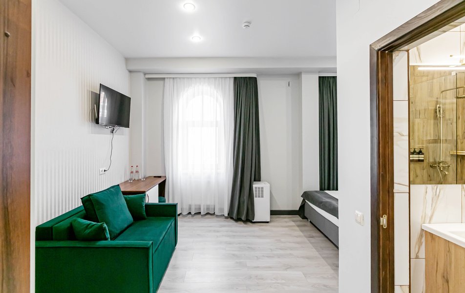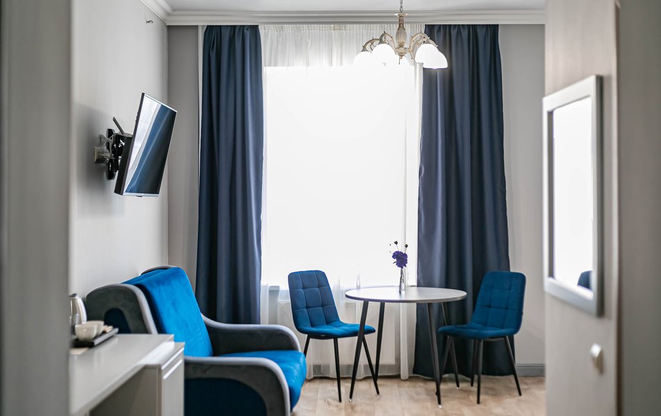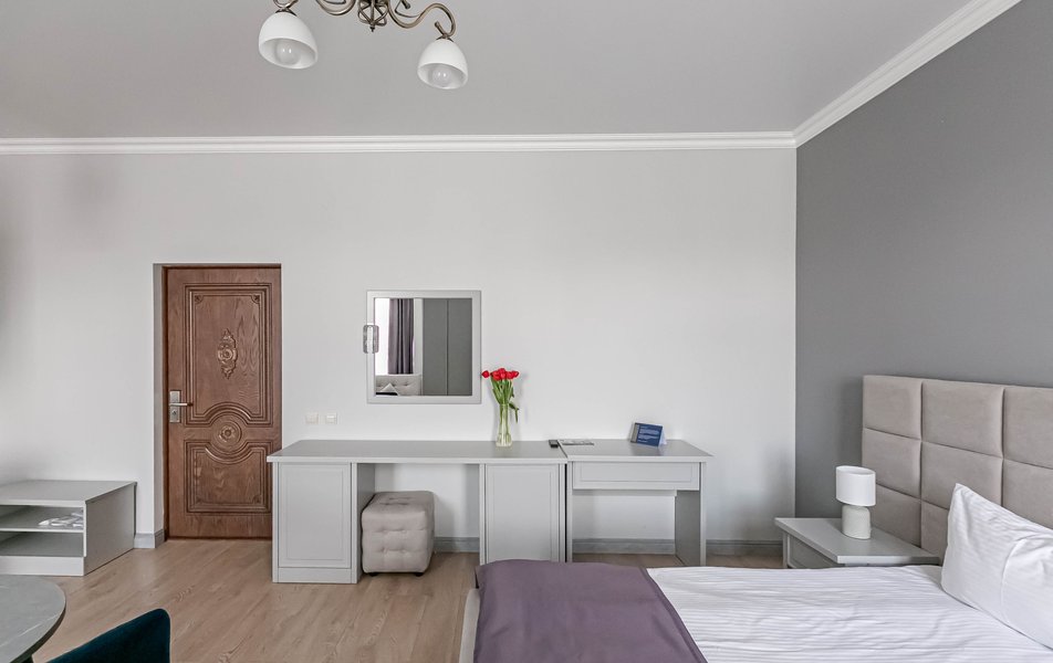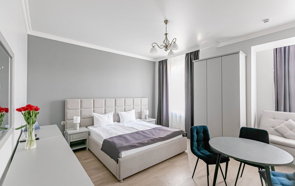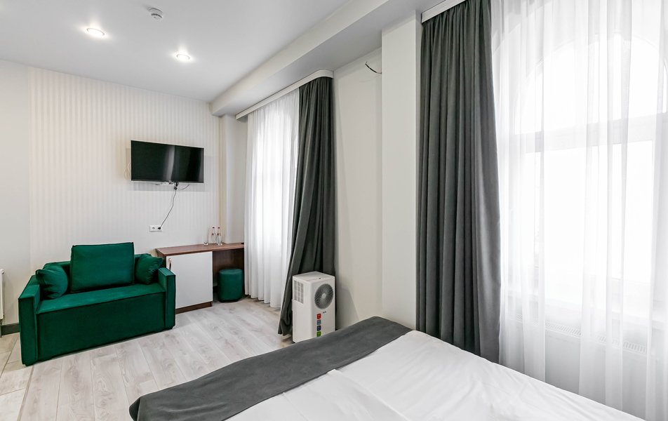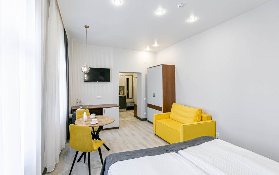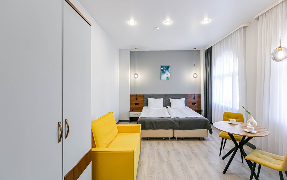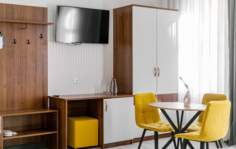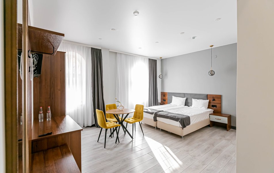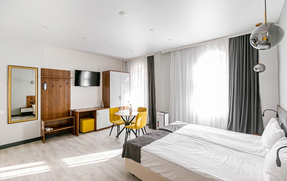 Стандартный 2-местный 1-комнатный Количество комнат: 1-комнатный Тип номера: Стандартный Дополнительное место: диван Вид из номера: на город Кол-во основных мест: 2 Мебель: диван, зеркало, кровать двуспальная, стол, стулья, шкаф Оборудование: кондиционер, телевизор, чайный набор посуды, электрочайник Санузел: с душем, туалетные принадлежности, фен Сервис: Wi-Fi бесплатно, смена полотенец, смена постельного белья, уборка номера