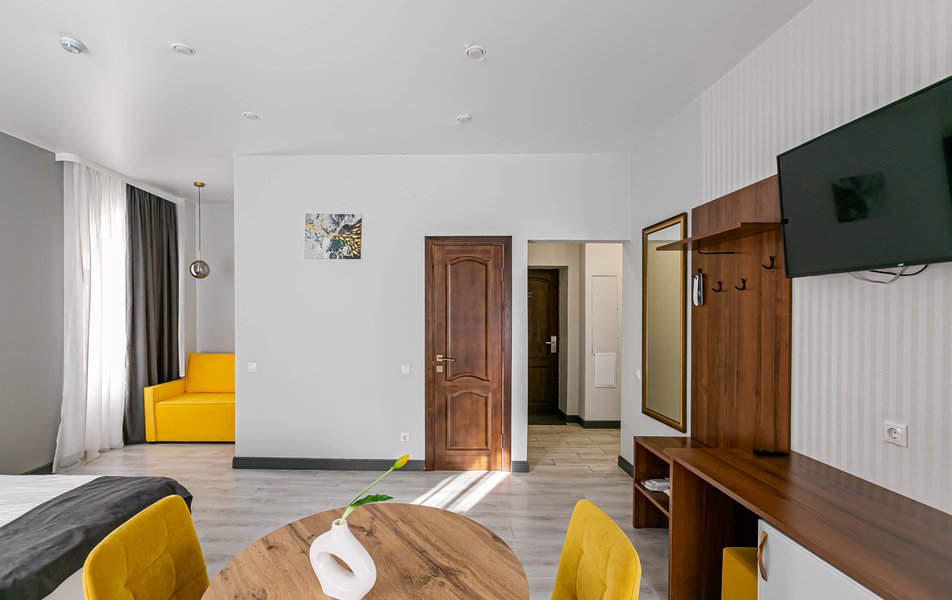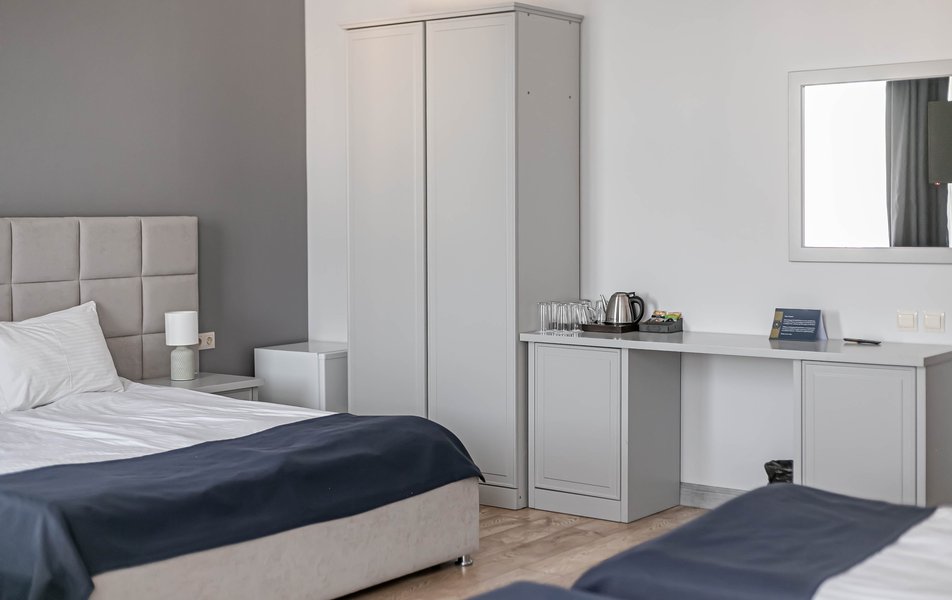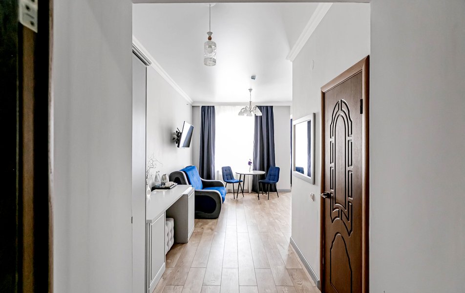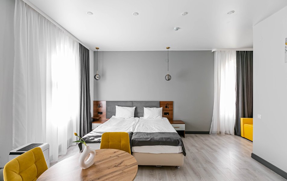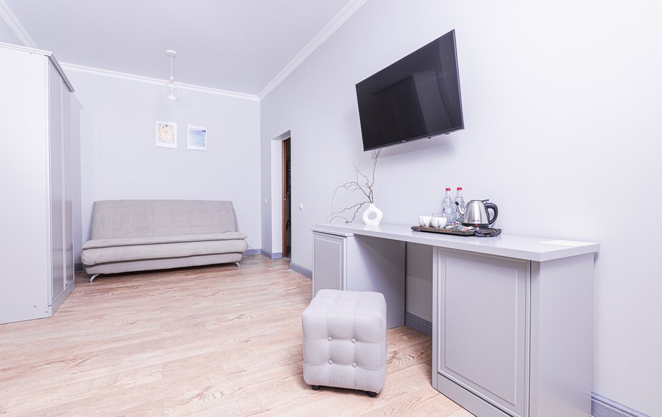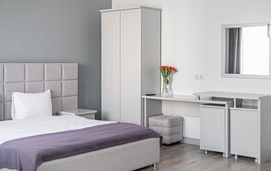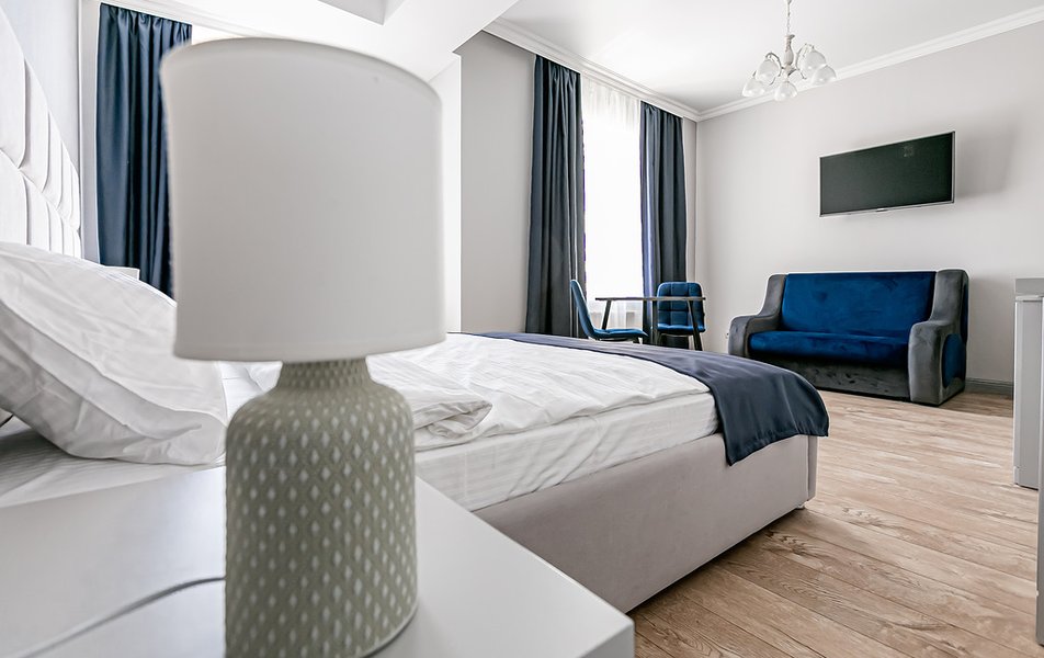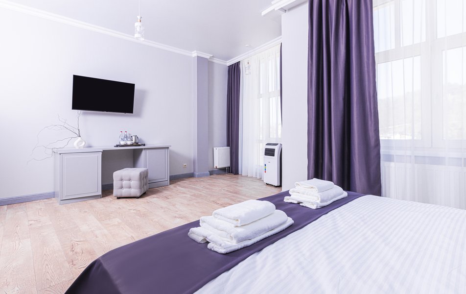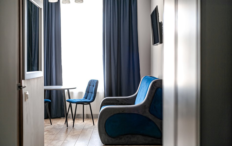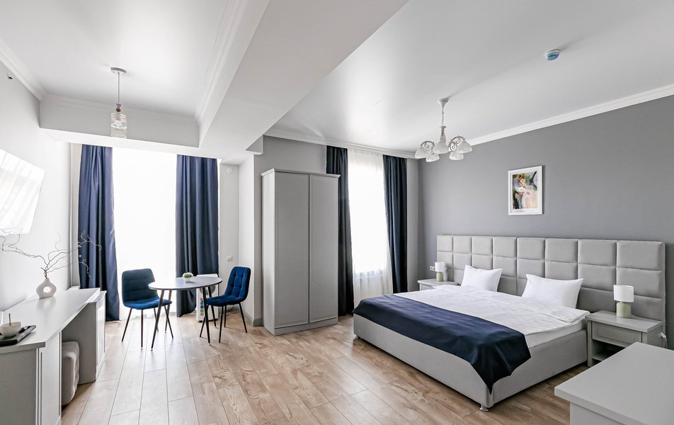 Стандартный 2-местный 1-комнатный Количество комнат: 1-комнатный Тип номера: Стандартный Дополнительное место: диван Вид из номера: на город Кол-во основных мест: 2 Мебель: диван, зеркало, кровать двуспальная, стол, стулья, шкаф Оборудование: кондиционер, телевизор, чайный набор посуды, электрочайник Санузел: с душем, туалетные принадлежности, фен Сервис: Wi-Fi бесплатно, смена полотенец, смена постельного белья, уборка номера