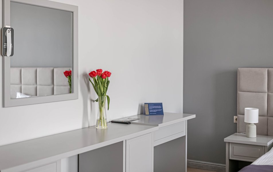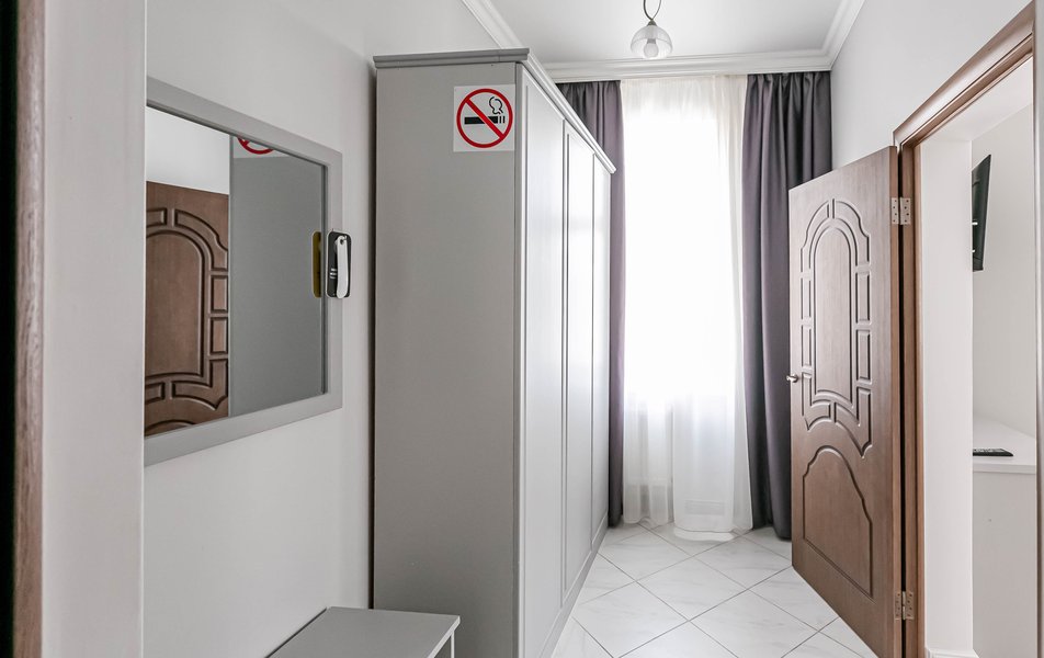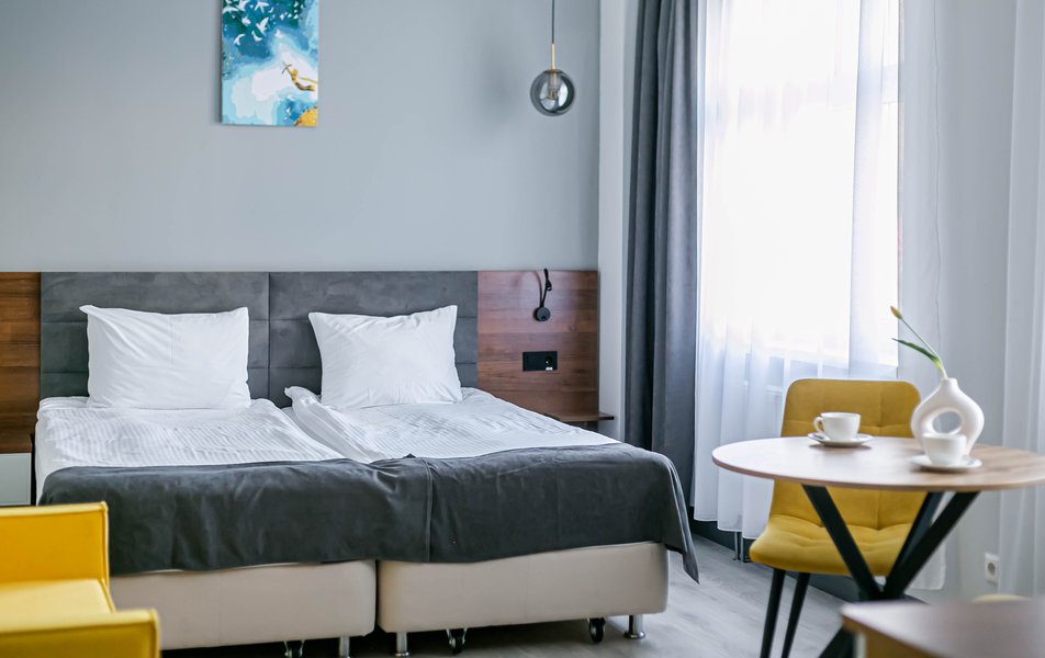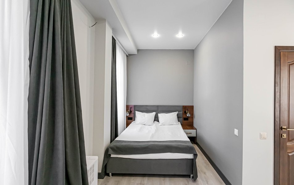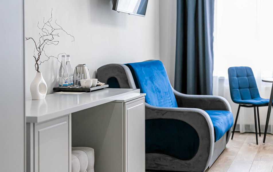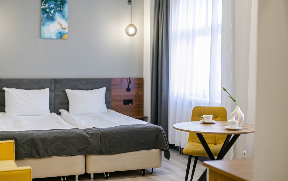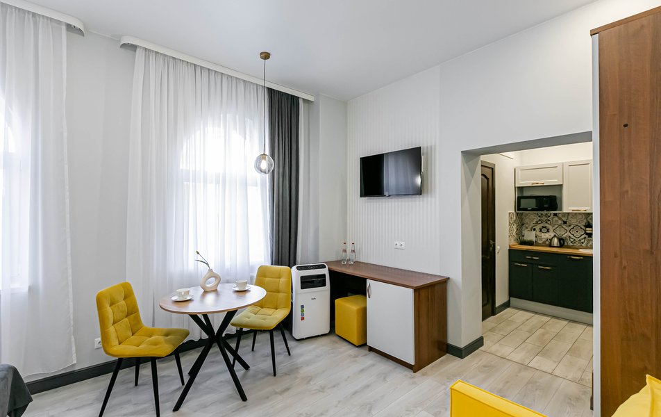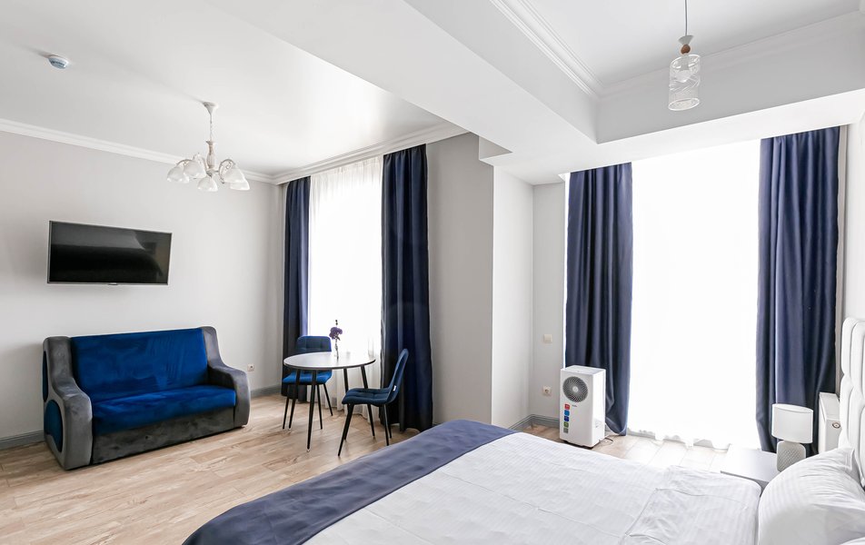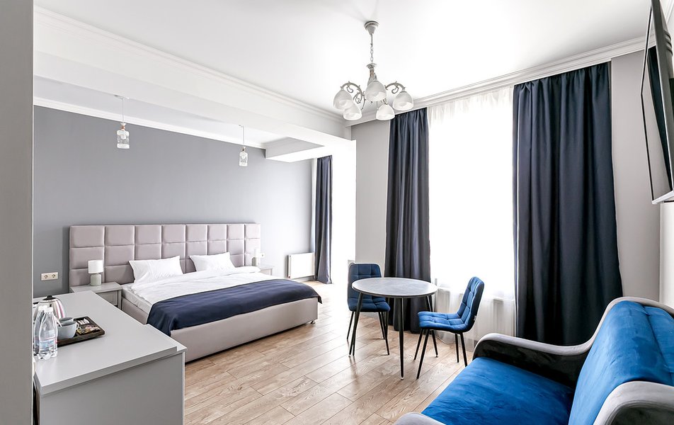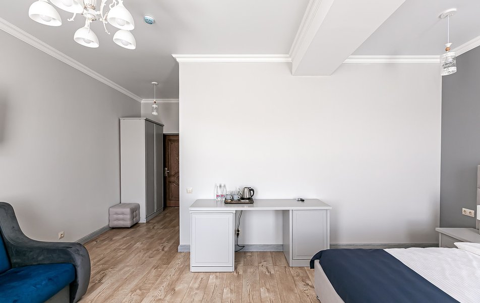 Стандартный 2-местный 1-комнатный Количество комнат: 1-комнатный Тип номера: Стандартный Дополнительное место: диван Вид из номера: на город Кол-во основных мест: 2 Мебель: диван, зеркало, кровать двуспальная, стол, стулья, шкаф Оборудование: кондиционер, телевизор, чайный набор посуды, электрочайник Санузел: с душем, туалетные принадлежности, фен Сервис: Wi-Fi бесплатно, смена полотенец, смена постельного белья, уборка номера