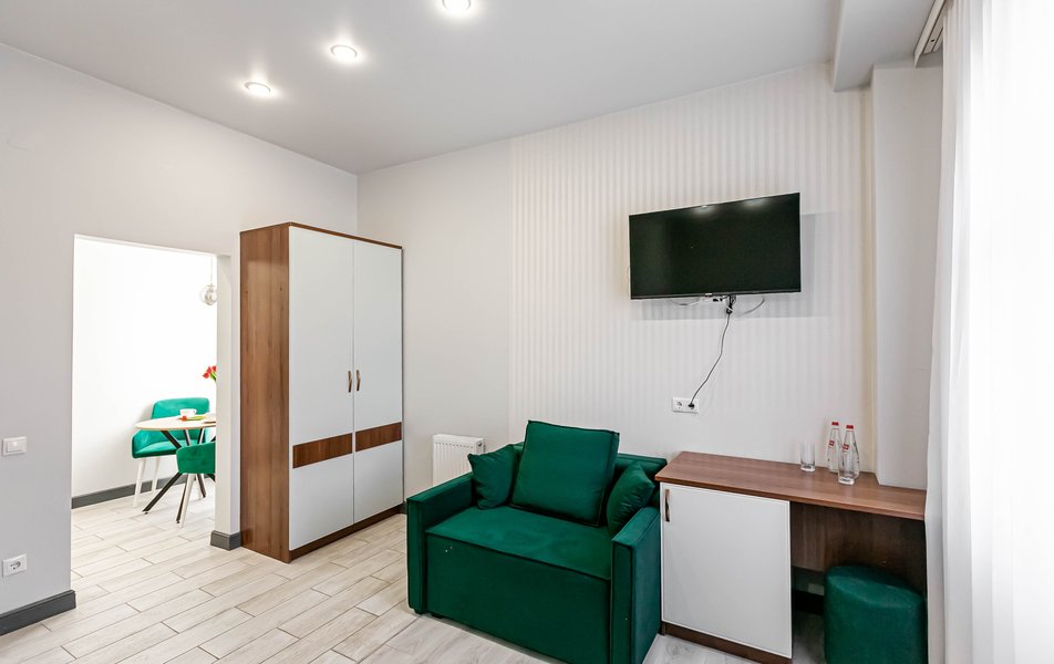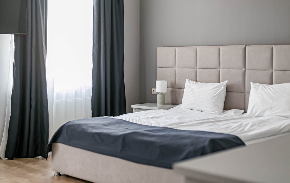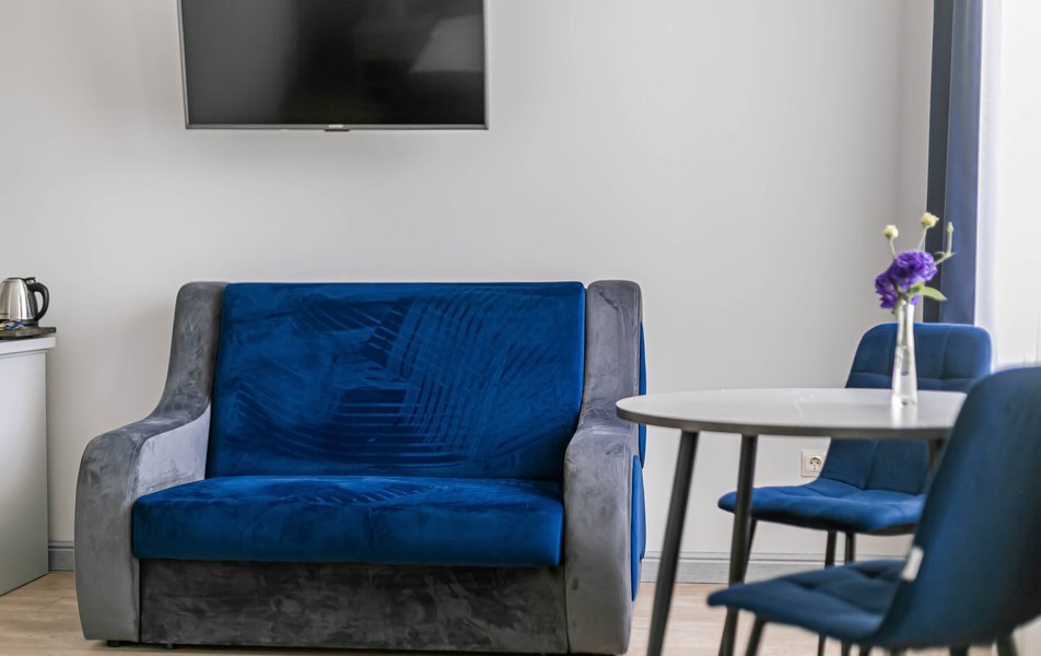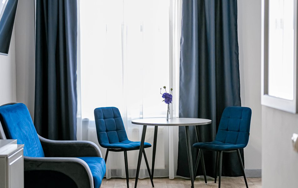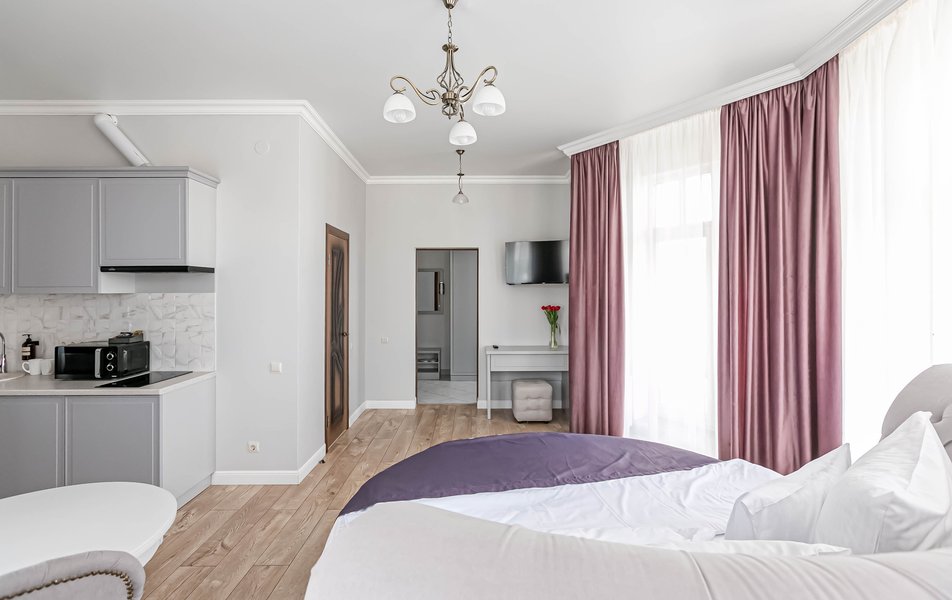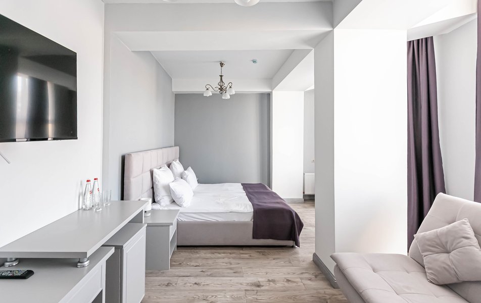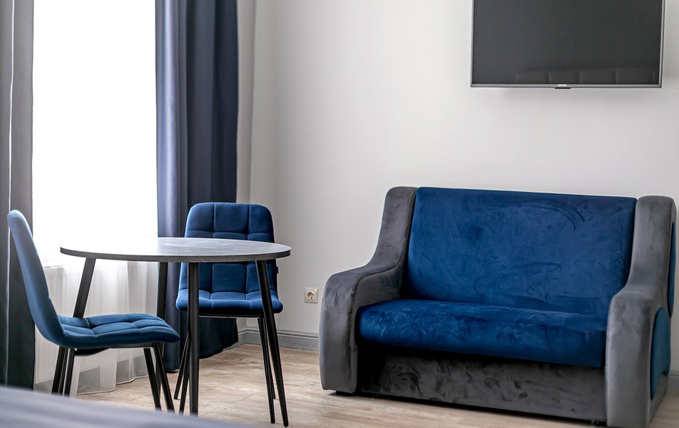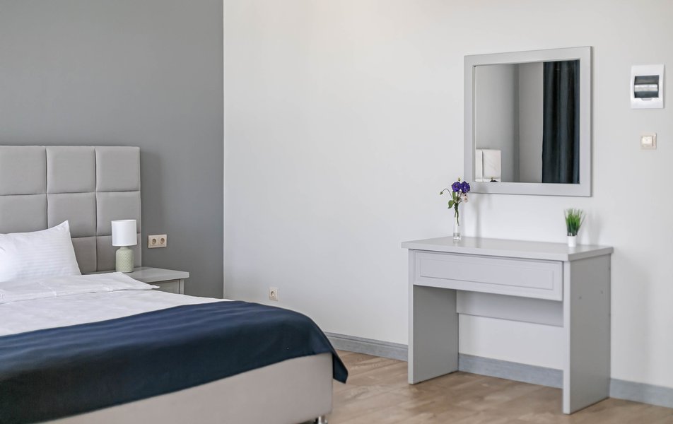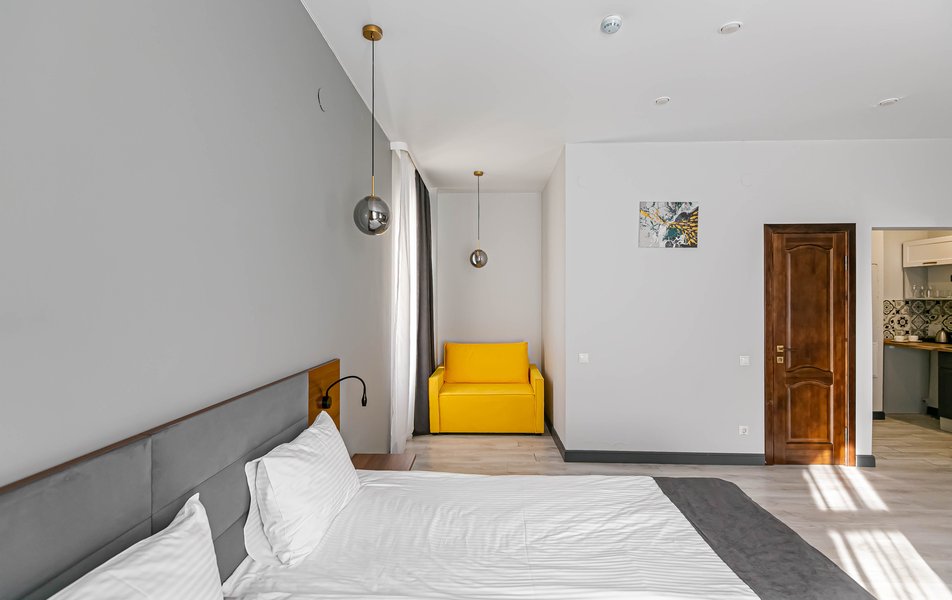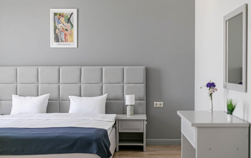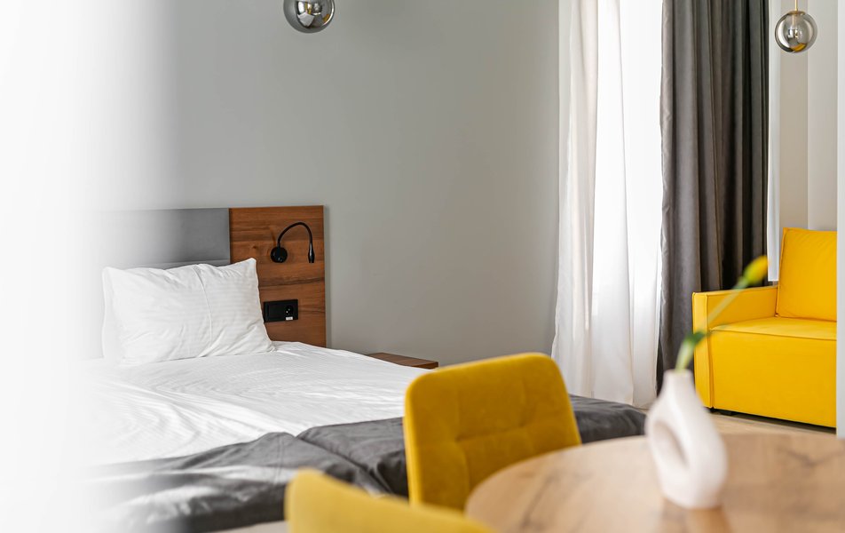 Стандартный 2-местный 1-комнатный Количество комнат: 1-комнатный Тип номера: Стандартный Дополнительное место: диван Вид из номера: на город Кол-во основных мест: 2 Мебель: диван, зеркало, кровать двуспальная, стол, стулья, шкаф Оборудование: кондиционер, телевизор, чайный набор посуды, электрочайник Санузел: с душем, туалетные принадлежности, фен Сервис: Wi-Fi бесплатно, смена полотенец, смена постельного белья, уборка номера