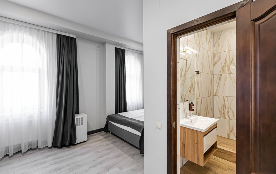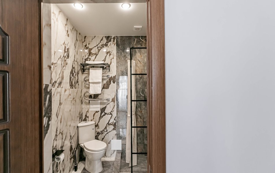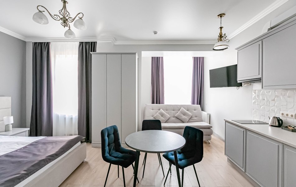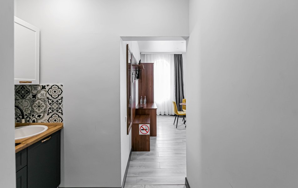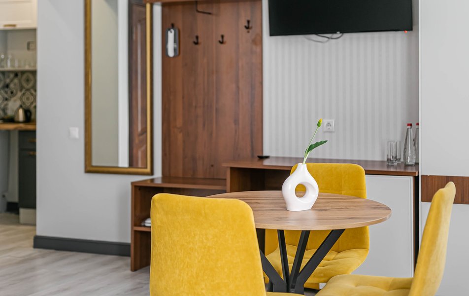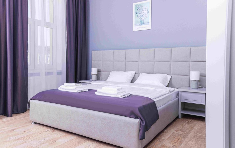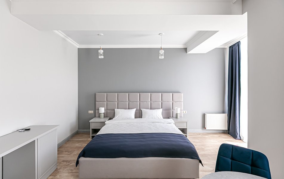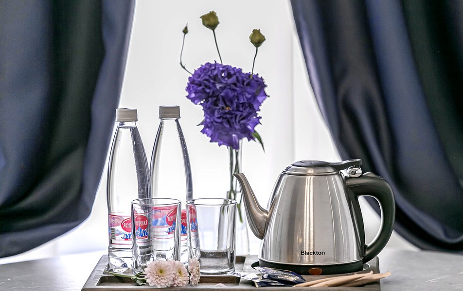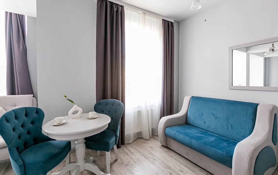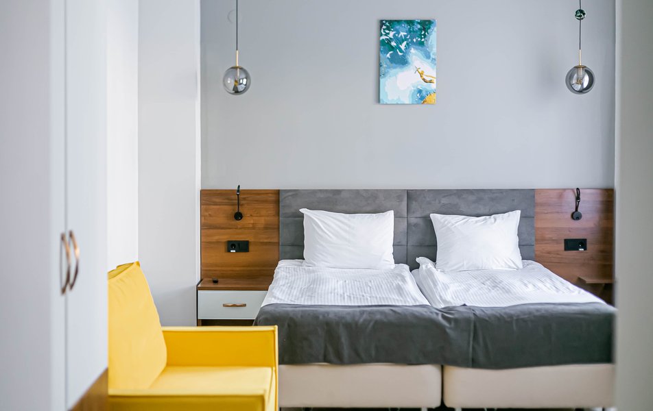 Стандартный 2-местный 1-комнатный Количество комнат: 1-комнатный Тип номера: Стандартный Дополнительное место: диван Вид из номера: на город Кол-во основных мест: 2 Мебель: диван, зеркало, кровать двуспальная, стол, стулья, шкаф Оборудование: кондиционер, телевизор, чайный набор посуды, электрочайник Санузел: с душем, туалетные принадлежности, фен Сервис: Wi-Fi бесплатно, смена полотенец, смена постельного белья, уборка номера