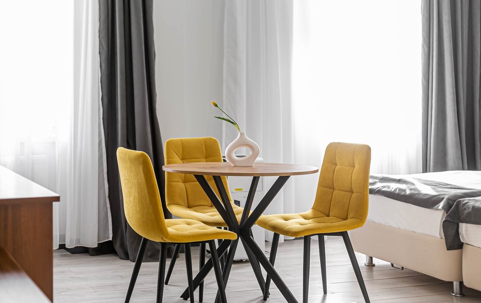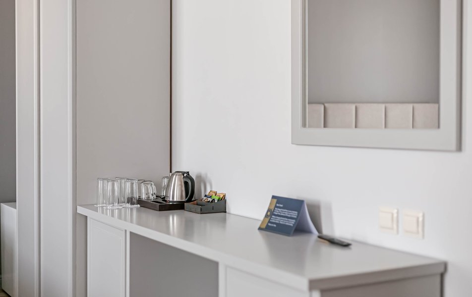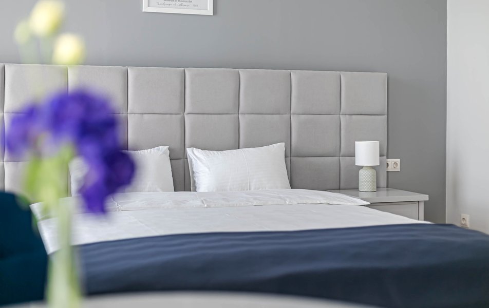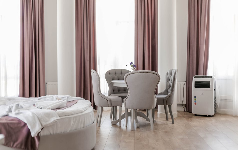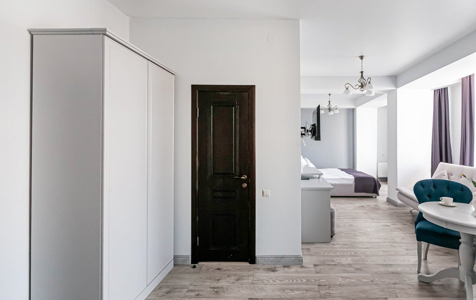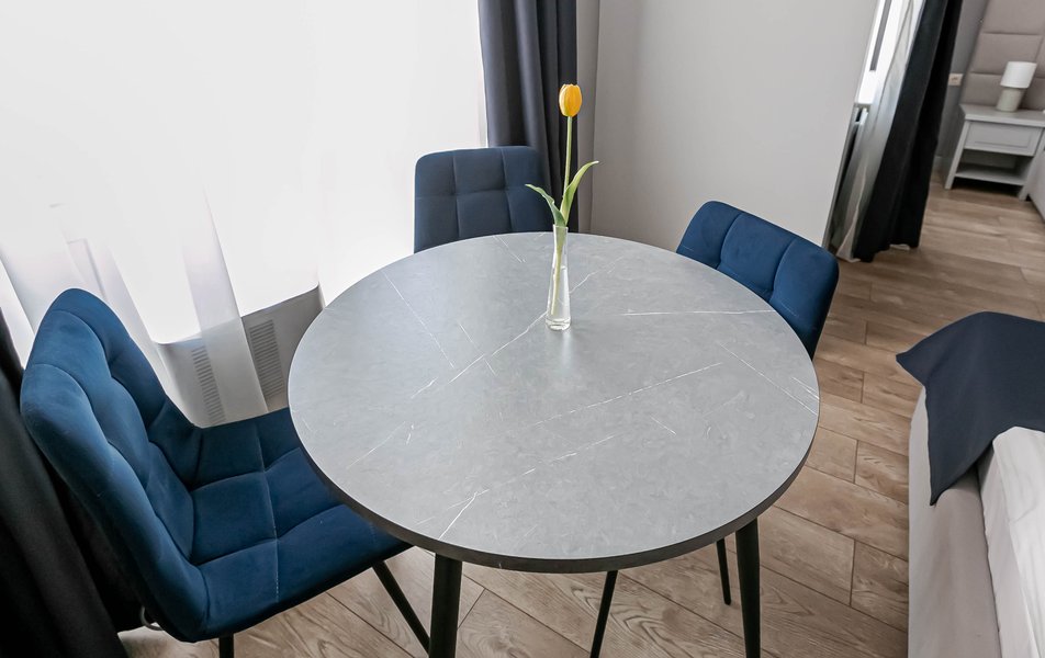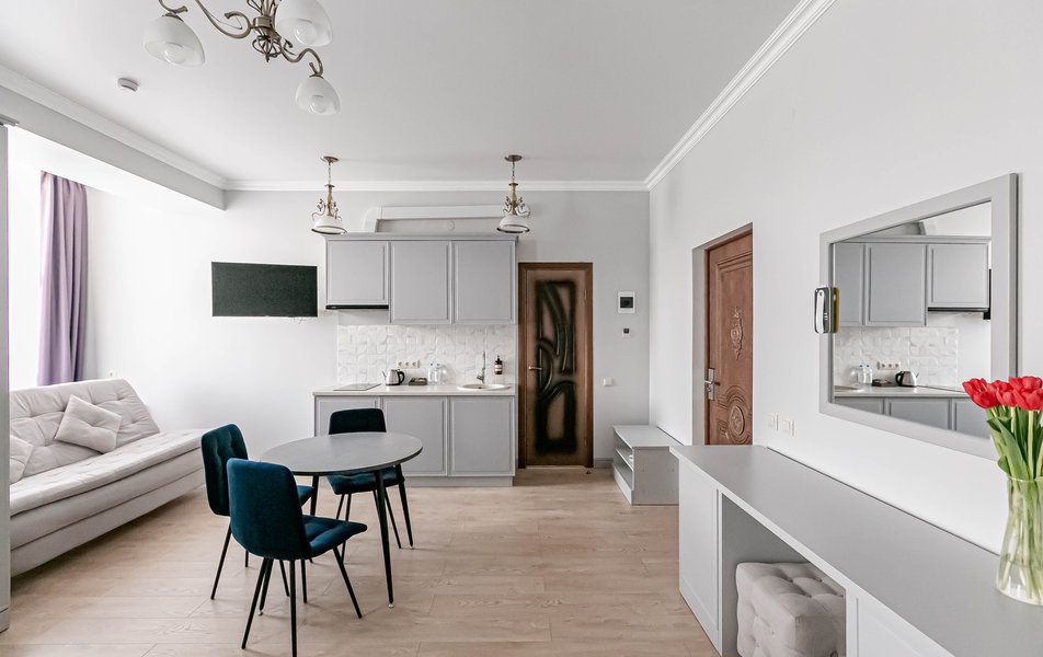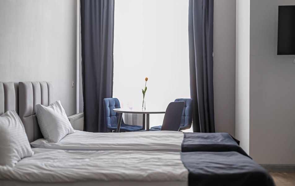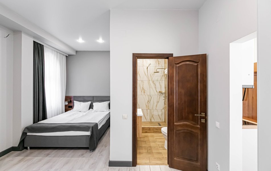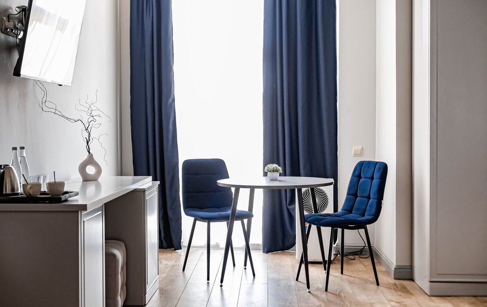 Стандартный 2-местный 1-комнатный Количество комнат: 1-комнатный Тип номера: Стандартный Дополнительное место: диван Вид из номера: на город Кол-во основных мест: 2 Мебель: диван, зеркало, кровать двуспальная, стол, стулья, шкаф Оборудование: кондиционер, телевизор, чайный набор посуды, электрочайник Санузел: с душем, туалетные принадлежности, фен Сервис: Wi-Fi бесплатно, смена полотенец, смена постельного белья, уборка номера