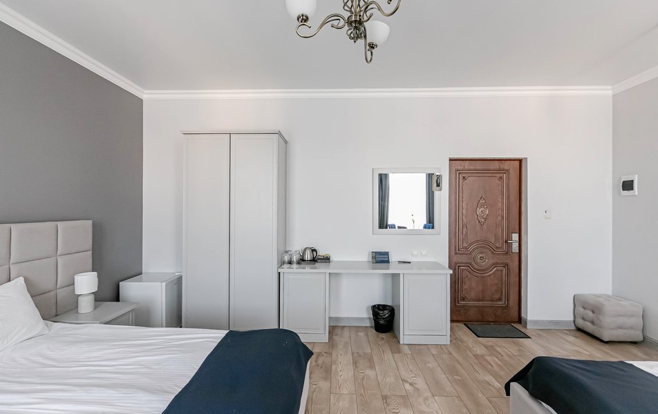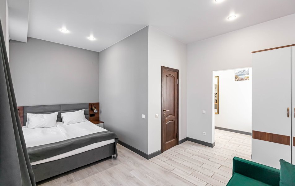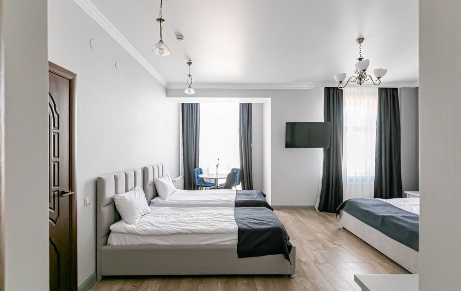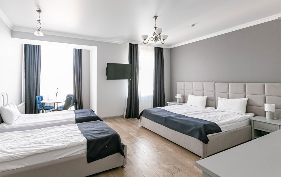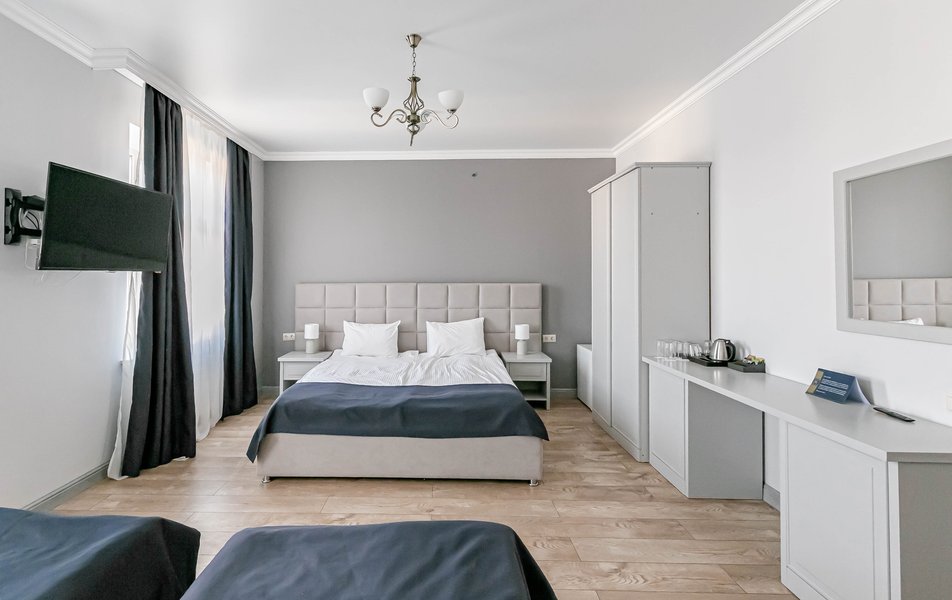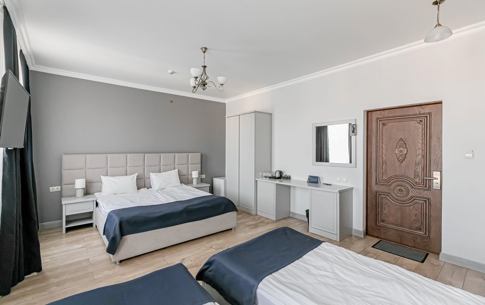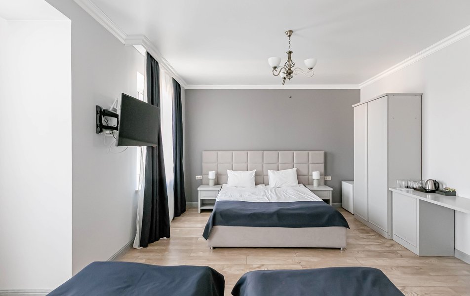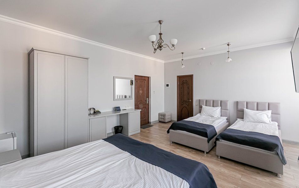 Люкс 4-местный 2-комнатный Количество комнат: 2-комнатный Тип номера: Люкс Вид из номера: на город Кол-во доп. мест: 1 Кол-во основных мест: 2 Мебель: диван, зеркало, кровати односпальные, кровать двуспальная, прикроватные тумбочки, стол, стулья, шкаф Оборудование: кондиционер, телевизор, чайный набор посуды, электрочайник Санузел: с душевой кабиной, туалетные принадлежности, фен Сервис: Wi-Fi бесплатно, смена полотенец, смена постельного белья, уборка номера