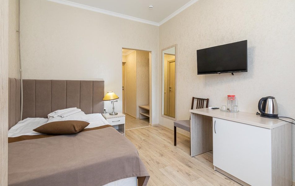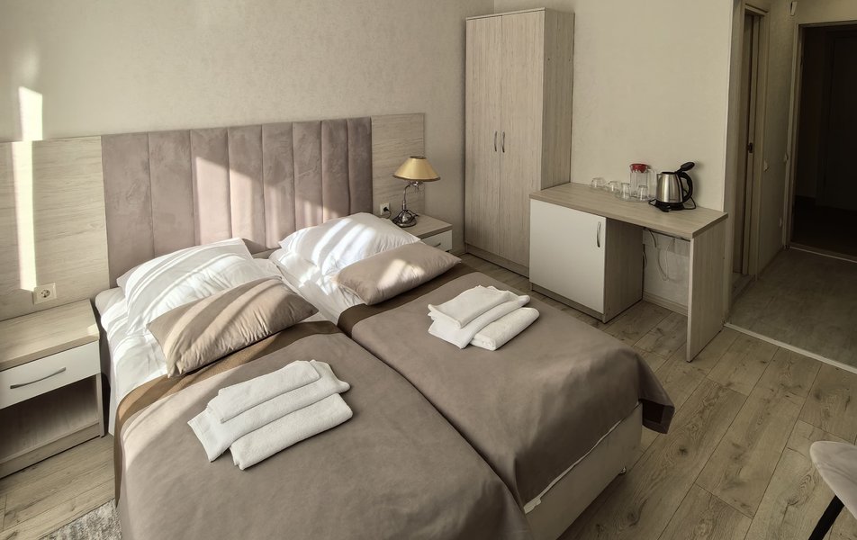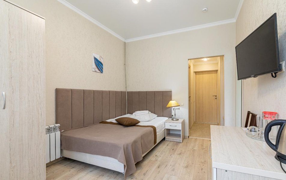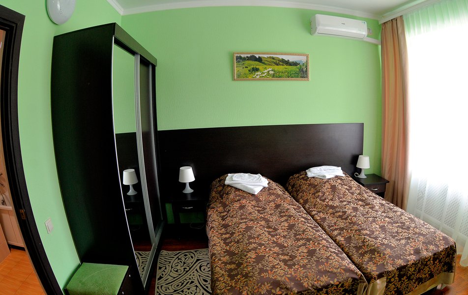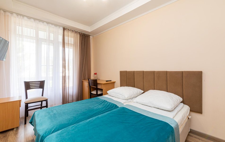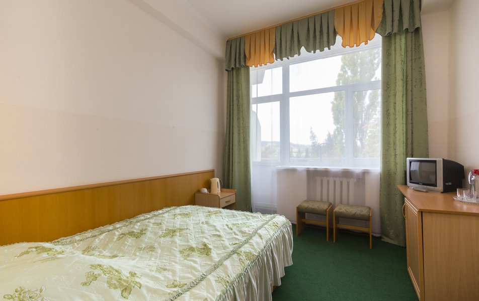 1 категория 2-местный 1-комнатный (Комфорт, корпус 4) Количество комнат: 1-комнатный Тип номера: Комфорт Дополнительное место: еврораскладушка Кол-во доп. мест: 1 Кол-во основных мест: 2 Площадь (кв. м): 12 Мебель: вешалка, зеркало, кровать двуспальная, прикроватные тумбочки, стол, стулья, шкаф Оборудование: телевизор, холодильник, чайный набор посуды, электрочайник Санузел: с душем, туалетные принадлежности, фен Сервис: Wi-Fi бесплатно, смена полотенец, смена постельного белья, уборка номера