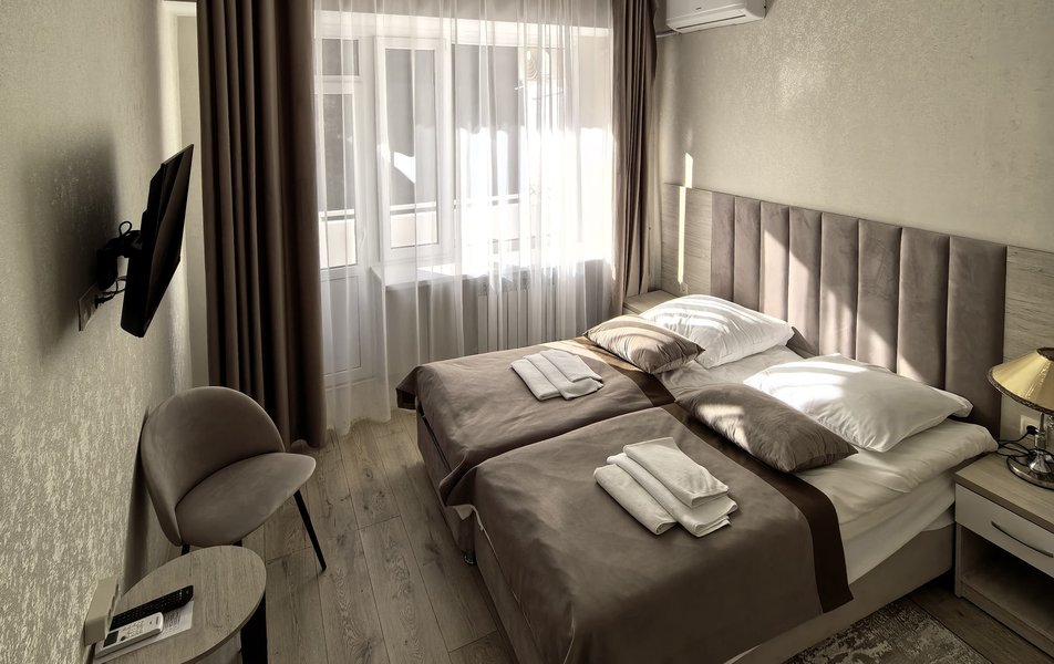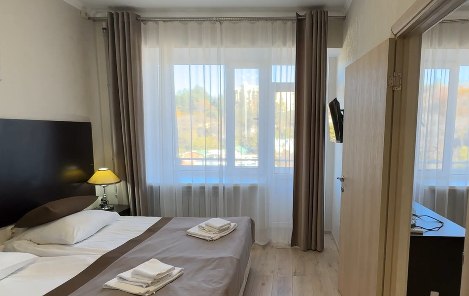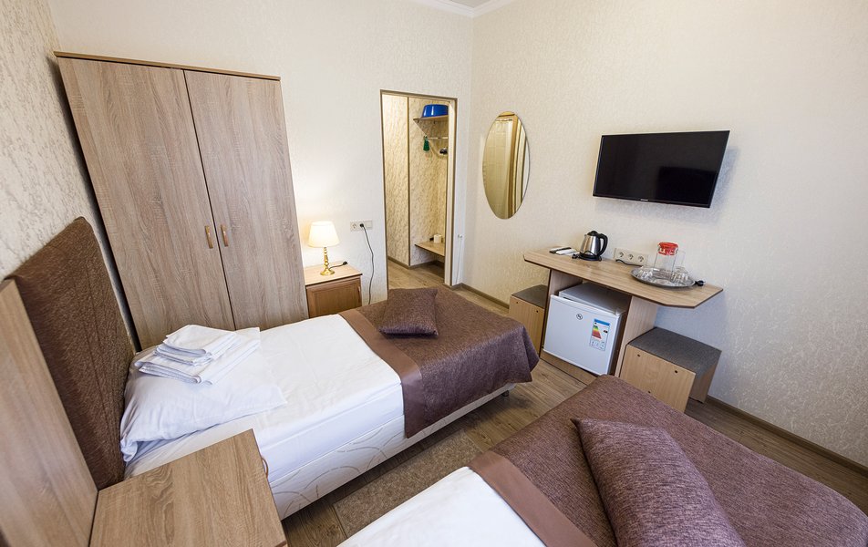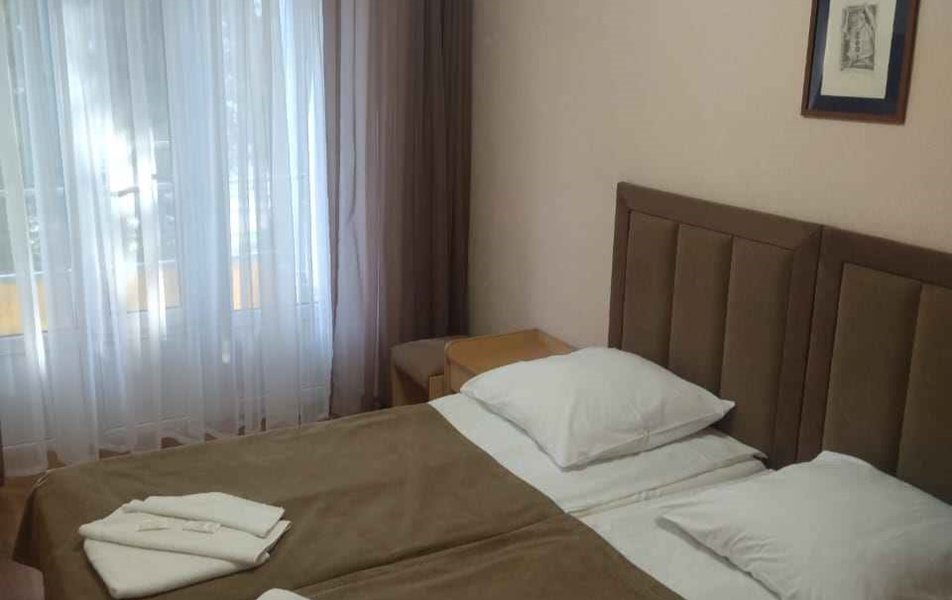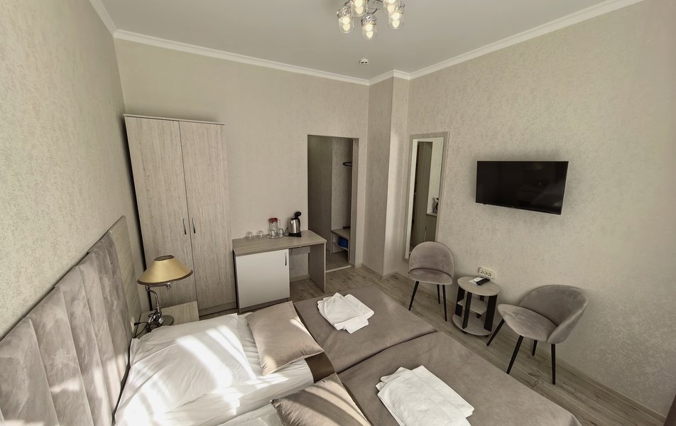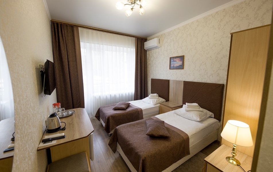1 категория 2-местный 1-комнатный (Комфорт, корпус 4) Количество комнат: 1-комнатный Тип номера: Комфорт Дополнительное место: еврораскладушка Кол-во доп. мест: 1 Кол-во основных мест: 2 Площадь (кв. м): 12 Мебель: вешалка, зеркало, кровать двуспальная, прикроватные тумбочки, стол, стулья, шкаф Оборудование: телевизор, холодильник, чайный набор посуды, электрочайник Санузел: с душем, туалетные принадлежности, фен Сервис: Wi-Fi бесплатно, смена полотенец, смена постельного белья, уборка номера
