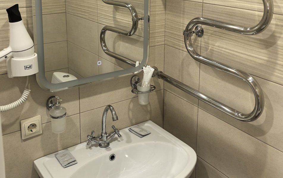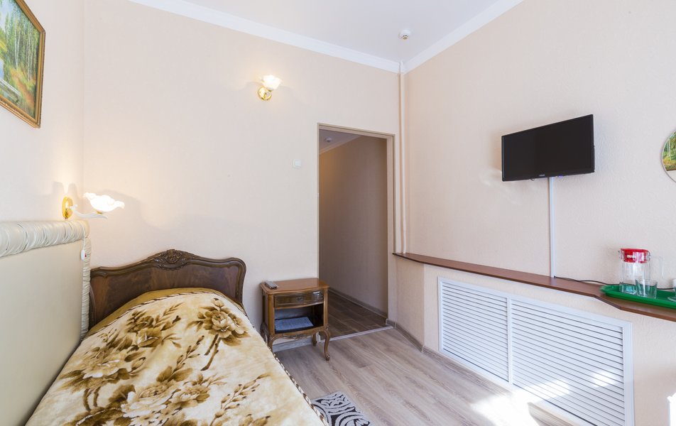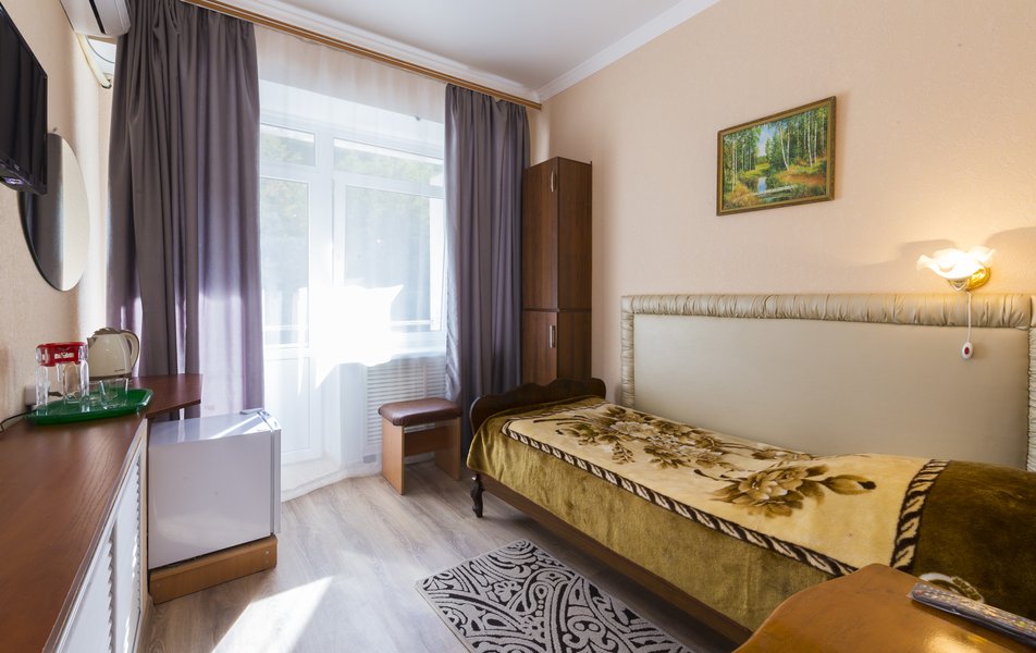 1 категория 1-местный 1-комнатный (Комфорт, корпус 4) Количество комнат: 1-комнатный Тип номера: Комфорт Дополнительное место: еврораскладушка Кол-во доп. мест: 1 Кол-во основных мест: 1 Площадь (кв. м): 10 Мебель: вешалка, зеркало, кровать односпальная, прикроватная тумбочка, стол, стул, шкаф Оборудование: телевизор, холодильник, чайный набор посуды, электрочайник Санузел: с душем, туалетные принадлежности, фен Сервис: Wi-Fi бесплатно, смена полотенец, смена постельного белья, уборка номера