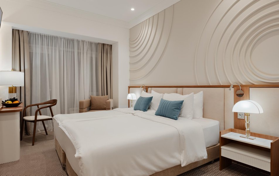 Люкс 2-местный 1-комнатный (Клубный этаж) Количество комнат: 1-комнатный Тип номера: Люкс Дополнительное место: евро-кровать Кол-во основных мест: 2 Мебель: вешалка, зеркало, кровать односпальная, прикроватные тумбочки, стол, стулья, шкаф Оборудование: кондиционер, кофемашина, сейф, телевизор, телефон, чайный набор посуды, электрочайник Санузел: с ванной, тапочки, туалетные принадлежности, фен, халат Сервис: Wi-Fi бесплатно, смена полотенец, смена постельного белья, уборка номера, услуги внутренней телефонной связи