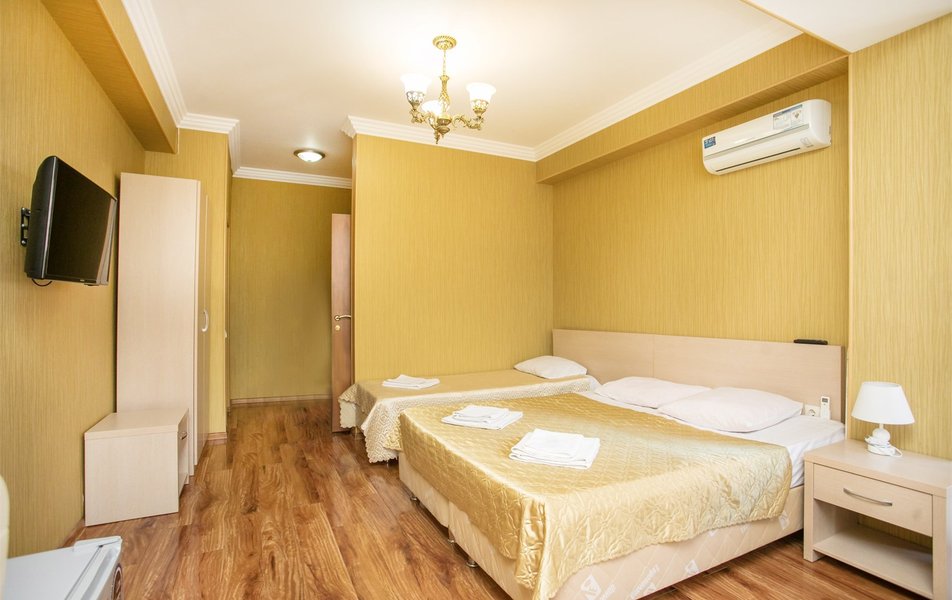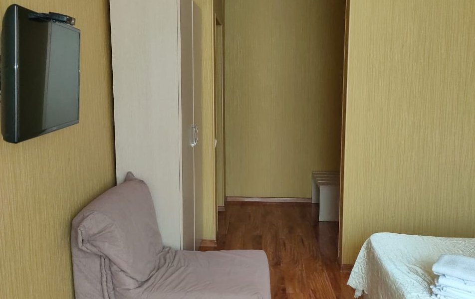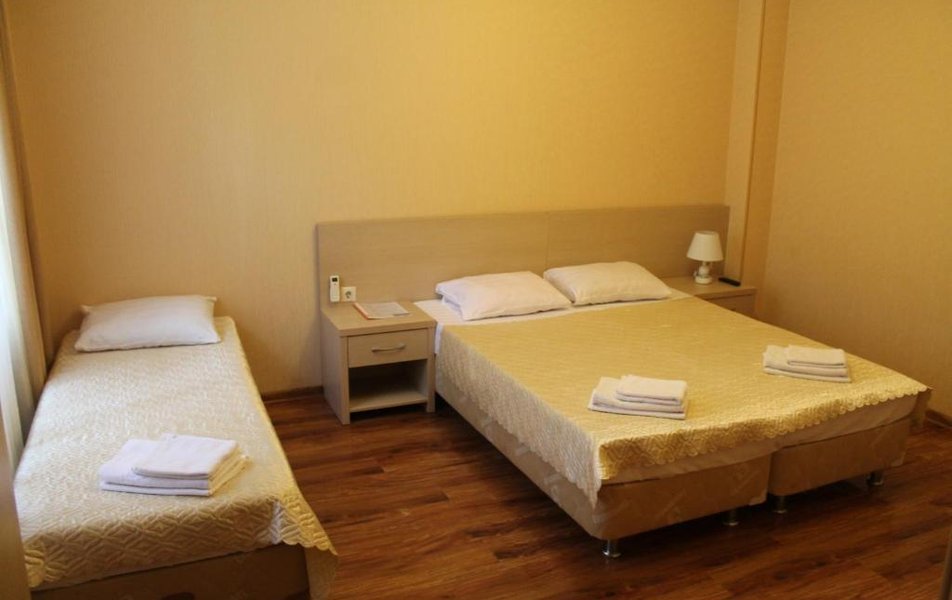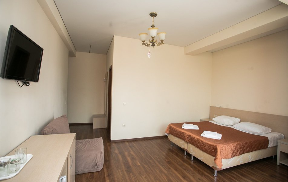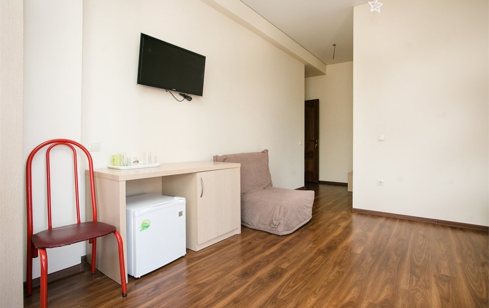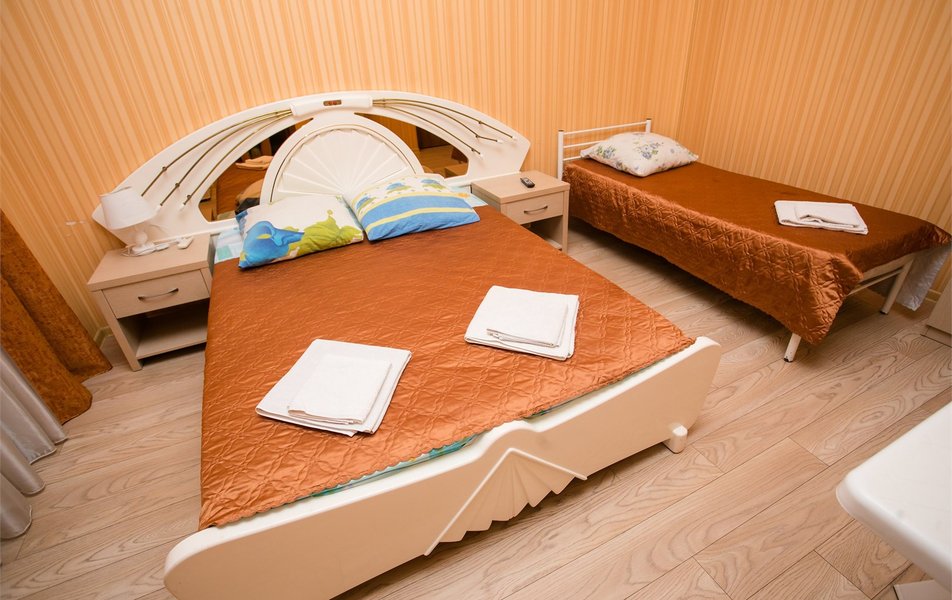 Семейный 4-местный 1-комнатный Количество комнат: 1-комнатный Тип номера: Семейный Кол-во основных мест: 4 Площадь (кв. м): 20 Мебель: вешалка, зеркало, кресло-кровать, кровать двуспальная, кровать односпальная, прикроватные тумбочки, стол, стулья, шкаф Оборудование: кондиционер, мини-холодильник, набор посуды, телевизор Санузел: с душем Сервис: Wi-Fi бесплатно, смена полотенец, смена постельного белья, уборка номера