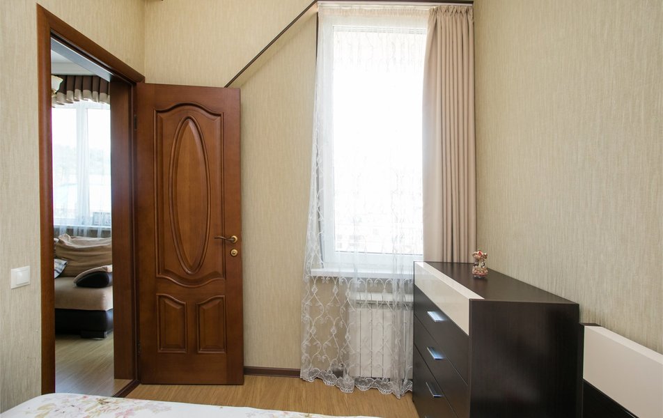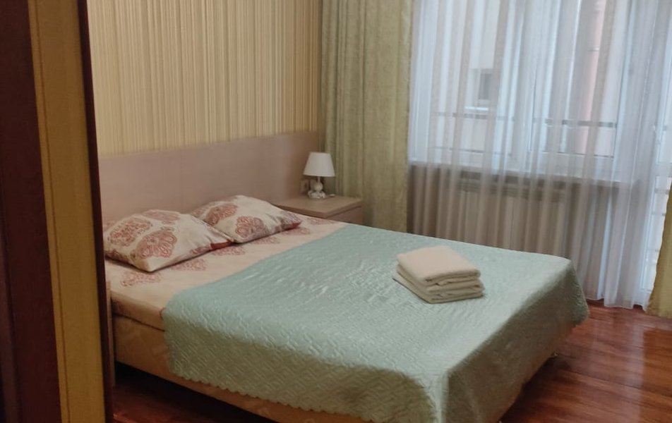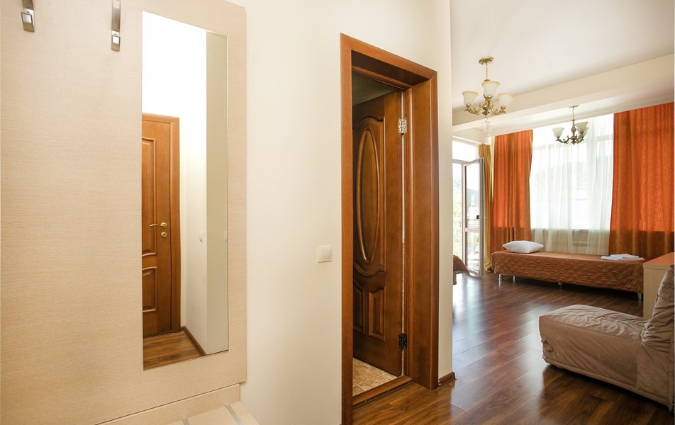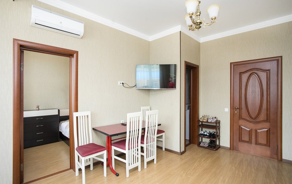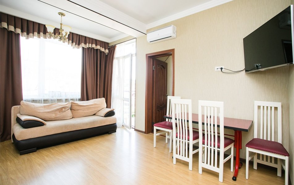 Люкс 4-местный 2-комнатный Количество комнат: 2-комнатный Тип номера: Люкс Вид из номера: на город Кол-во основных мест: 4 Площадь (кв. м): 40 Мебель: вешалка, диван раскладной, зеркало, комод, кровать двуспальная, кухонная мебель, стол обеденный, стулья, шкаф Оборудование: кондиционер, микроволновая печь, набор посуды, стиральная машина, телевизор, холодильник, чайный набор посуды, электрочайник Санузел: с ванной Сервис: Wi-Fi бесплатно, смена полотенец, смена постельного белья, уборка номера