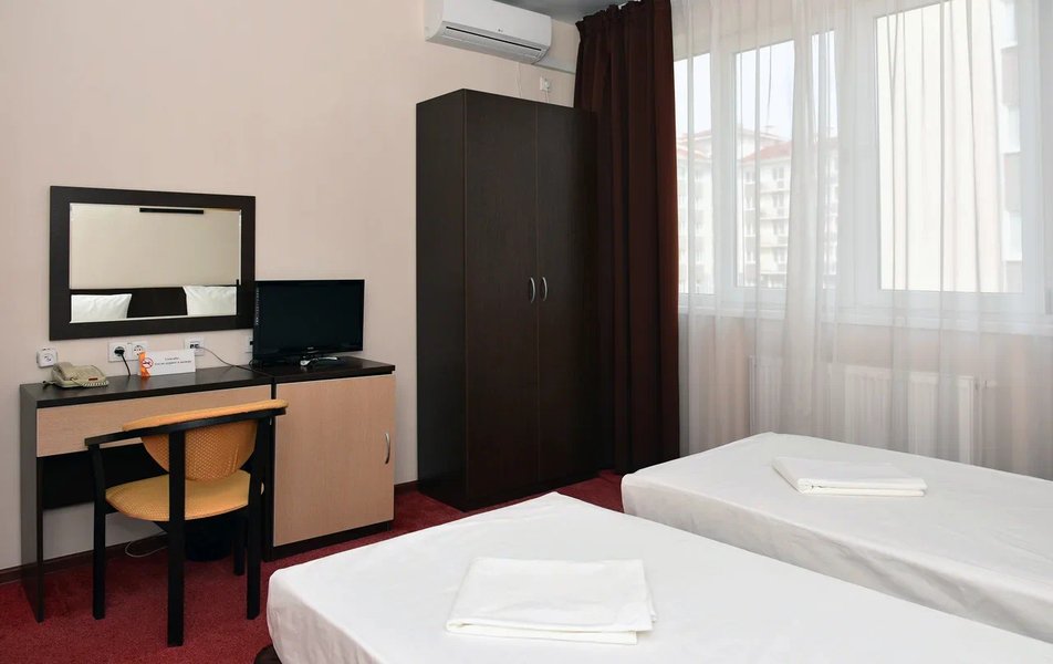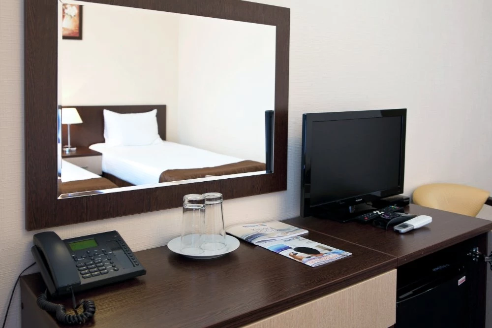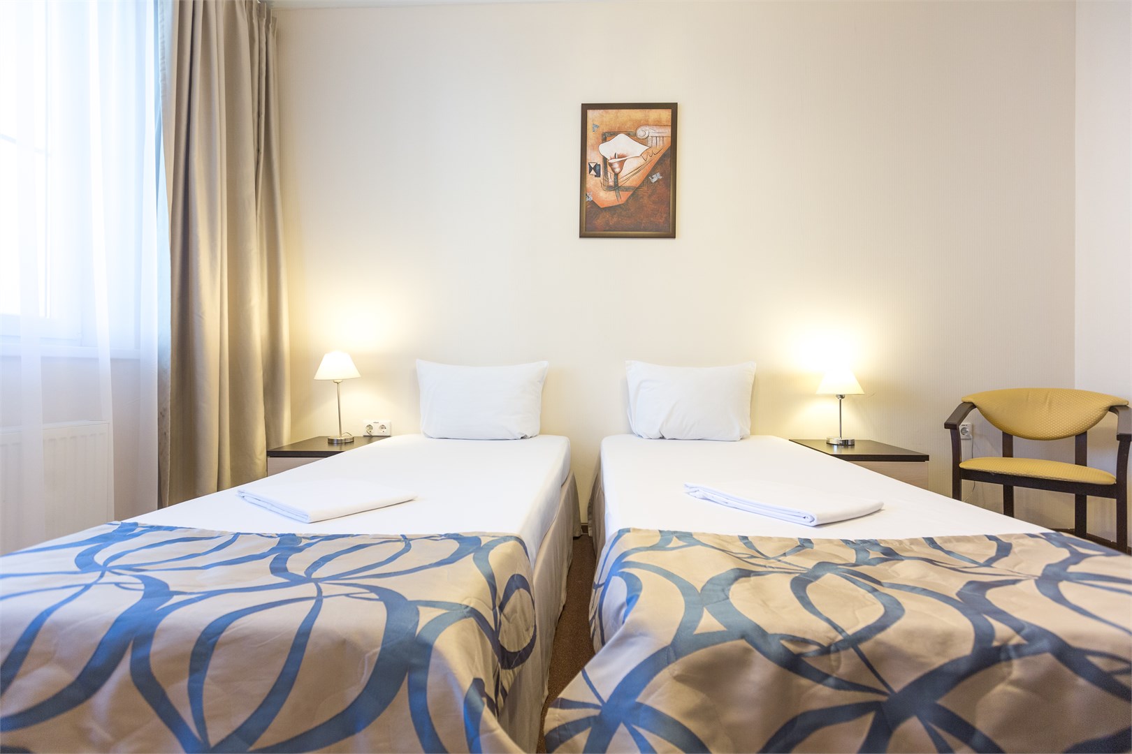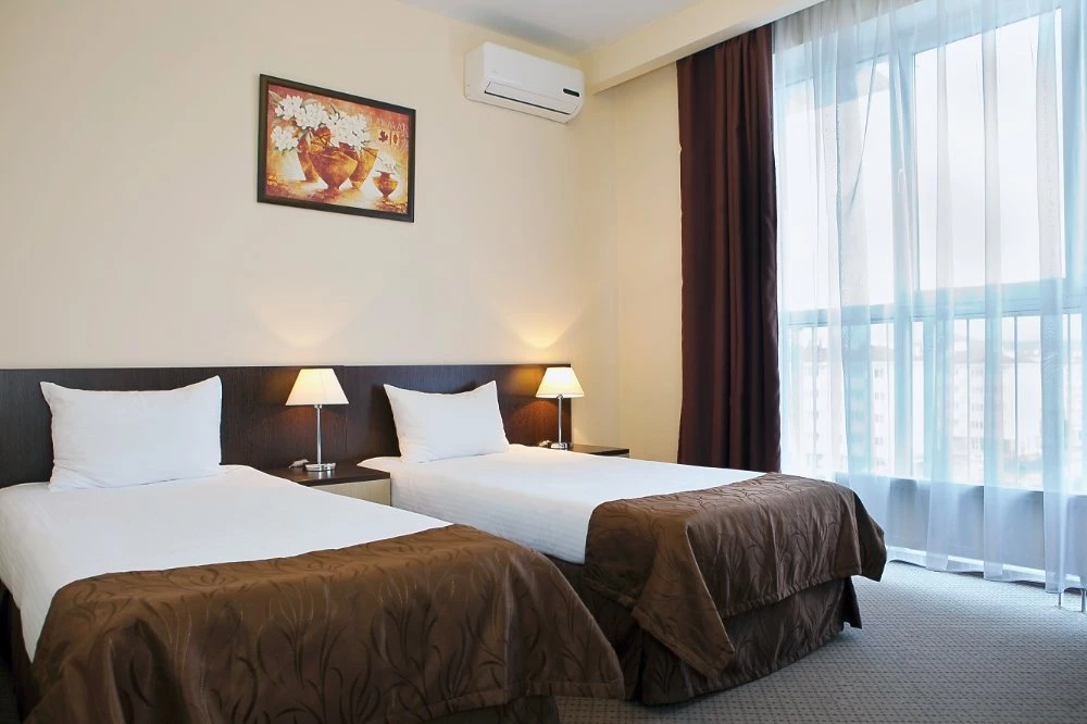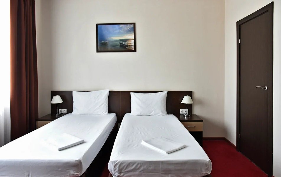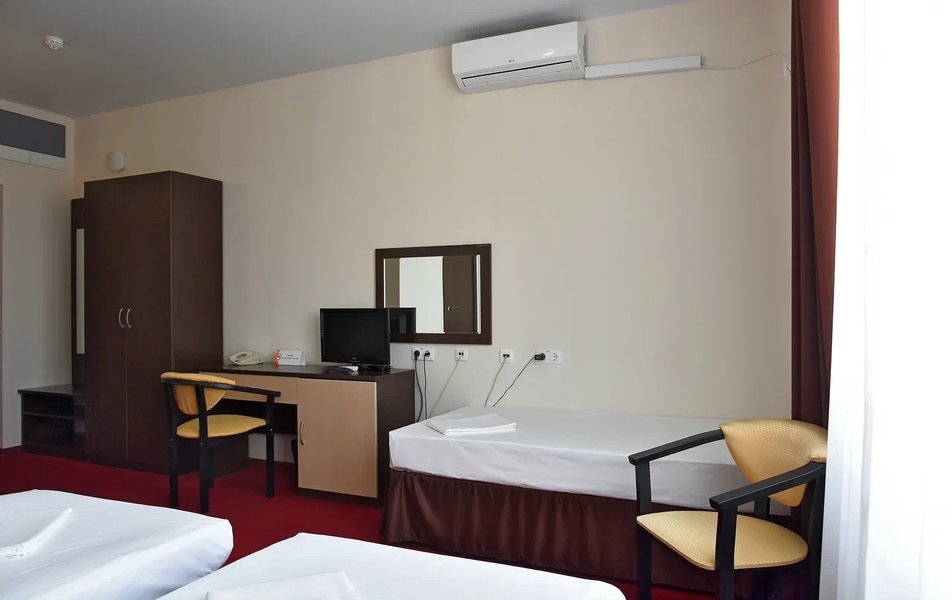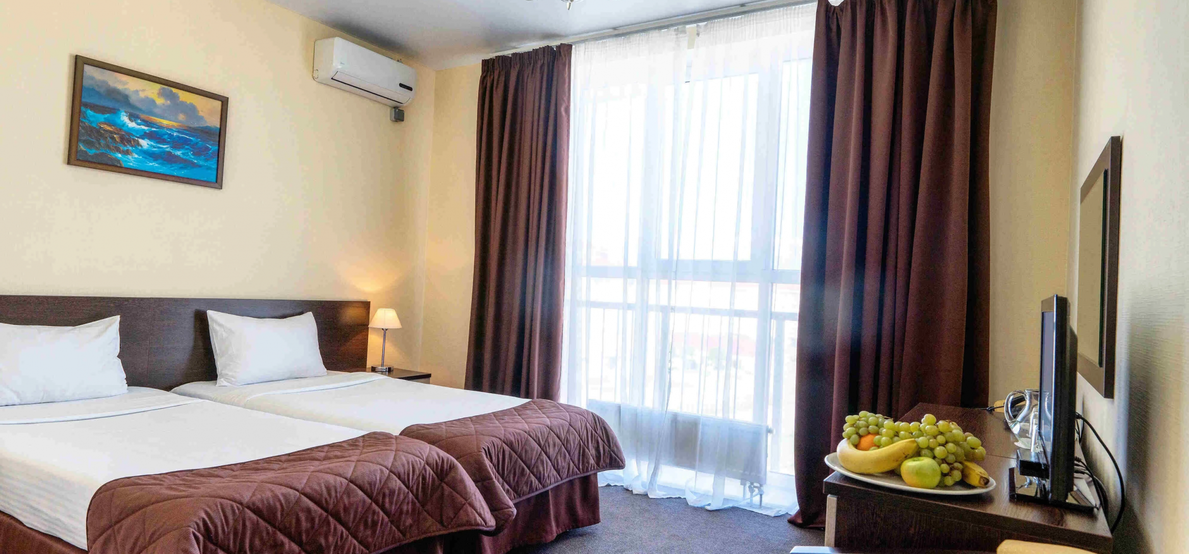 Бюджетный номер оснащен 2 односпальными кроватями, балконом (в части номеров), телевизором, телефоном, мини-баром, кондиционером, беспроводным интернетом. Санузел с ванной/душем, феном, туалетные принадлежности.