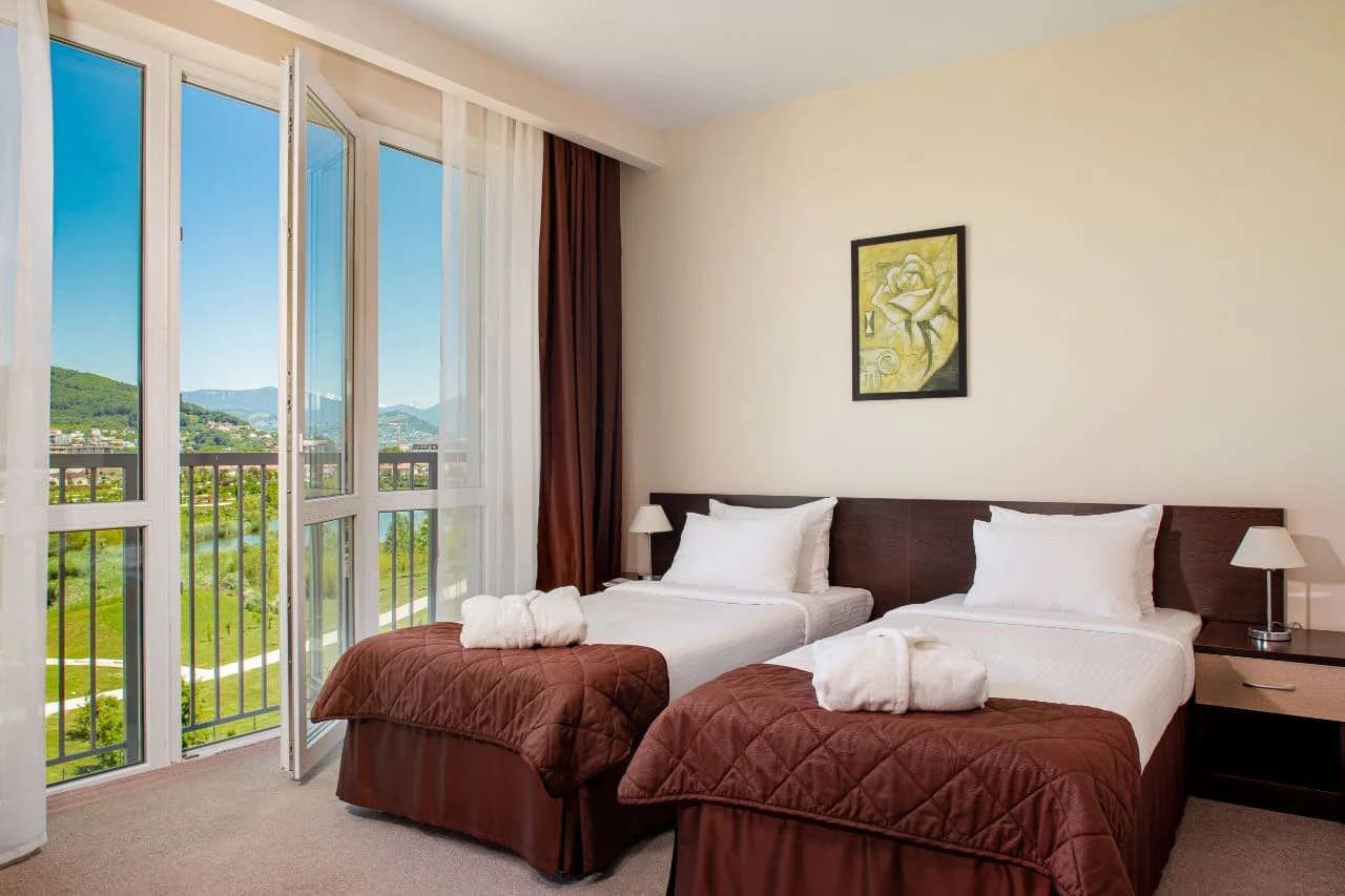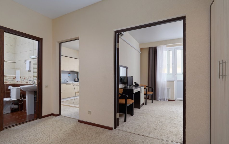 Двухкомнатный номер в спортивном квартале предлагает две спальни, санузел с ванной/душем, в части номеров есть балкона. Для размещения доступны 2 односпальные кровати (можно объединить в одну двуспальную кровать), во второй комнате предоставляются дополнительные спальные места по запросу. В числе удобств - Wi-Fi, кондиционер, мини-бар, телевизор, телефон, фен, набор гостиничной косметики.