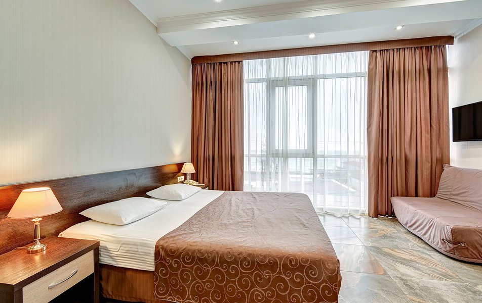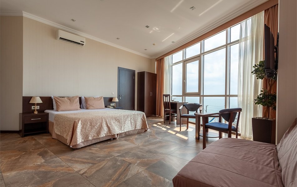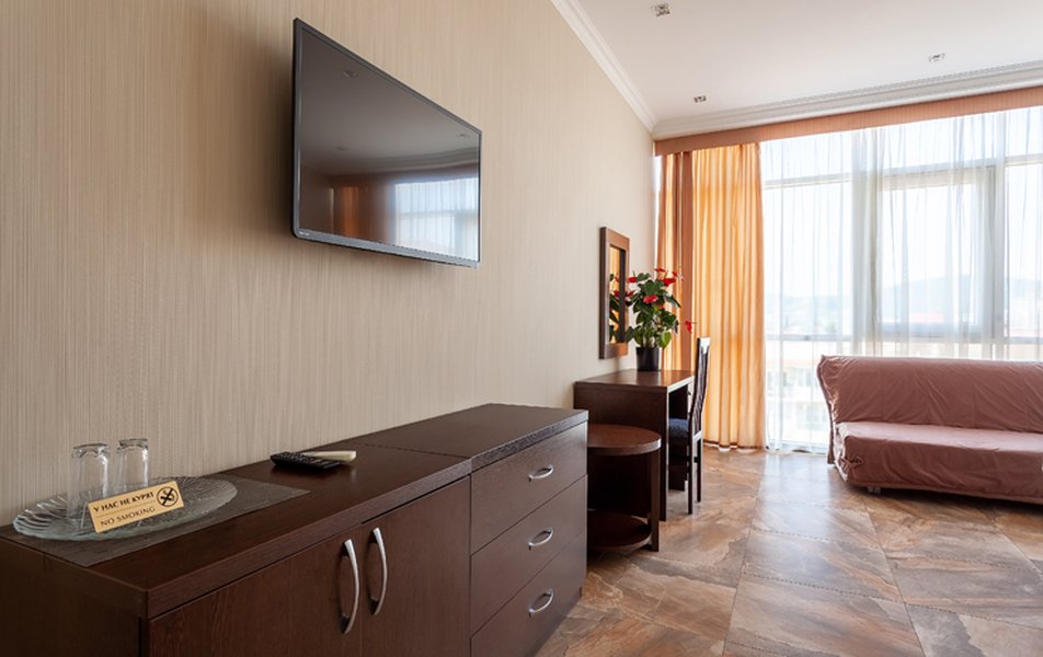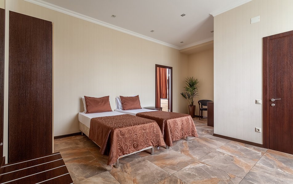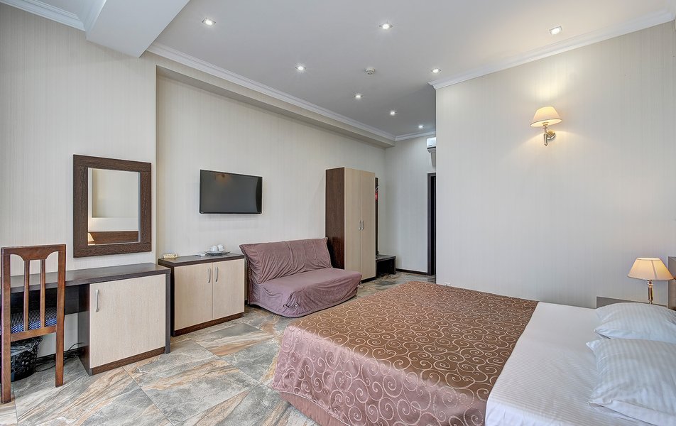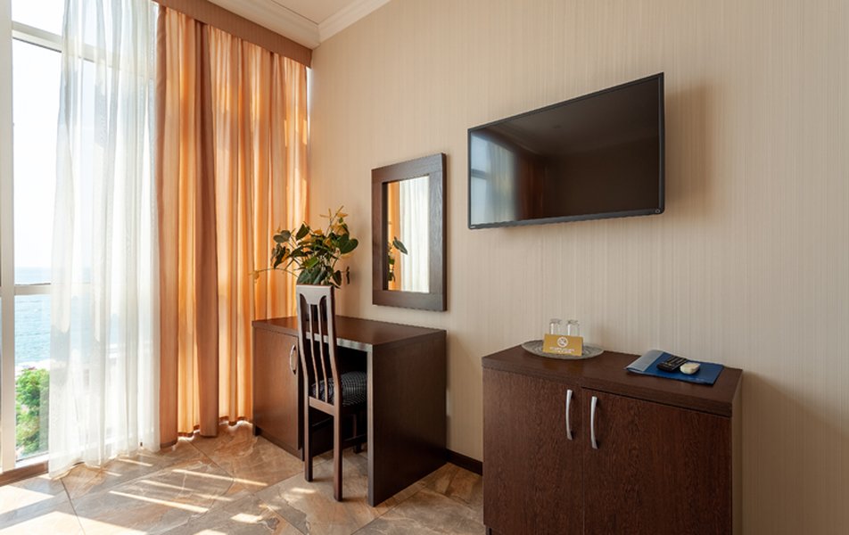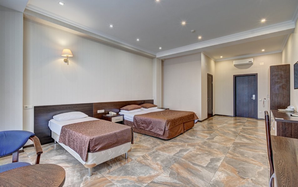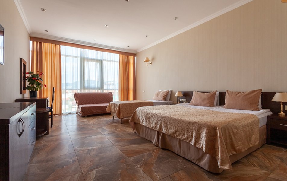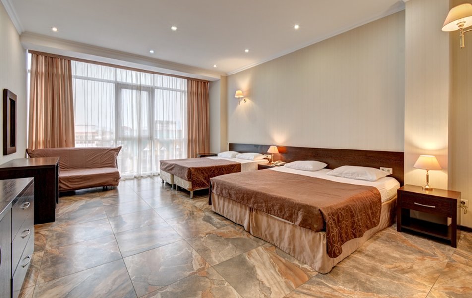 Номер неплохой, трёхместный, есть холодильник (работает плохо), огромные окна на город и чутка море. Пульт работает плохо, нет крышки на пульте, где батарейки, мебель пошарпаная местами, когда заехали телевизор не работал, сказали администратору, он ответил, что сделают утром, но муж всё сделал сам минут за 10, телефон в номере не работает, предупредили так же администратора, нам сказали, что заявку отправили, но ничего не изменилось, в номере нет тапок, полы холодные, муж сказал администратору, но она его игнорировала и сидела в телефоне, муж начал говорить на повышенных тонах, так как неприятно, когда отношение просто наплевательское, на нас вызвали охрану, просто супер, мы обязаны выполнять требования отеля, а работники нет. Вывод, отель неплохой, не смотря на недочёты в мебель, технику, элементарные нужды, но отношение администратора (девушки) имя не знаем, просто отвратительное, худшее, больше бы сюда не вернулись. По уборке вопросов нет. Номер был трёхместный.