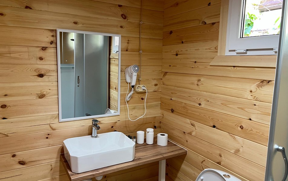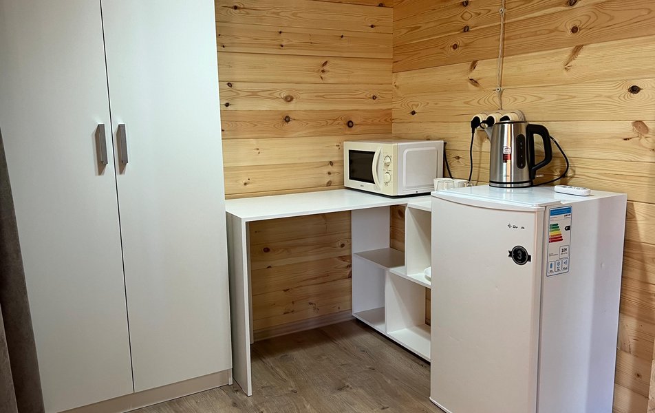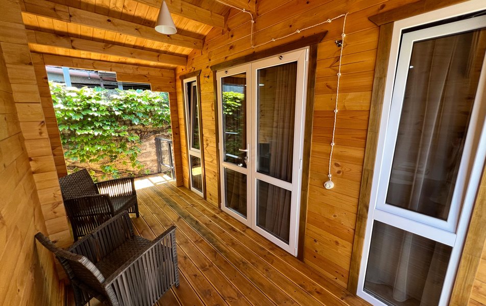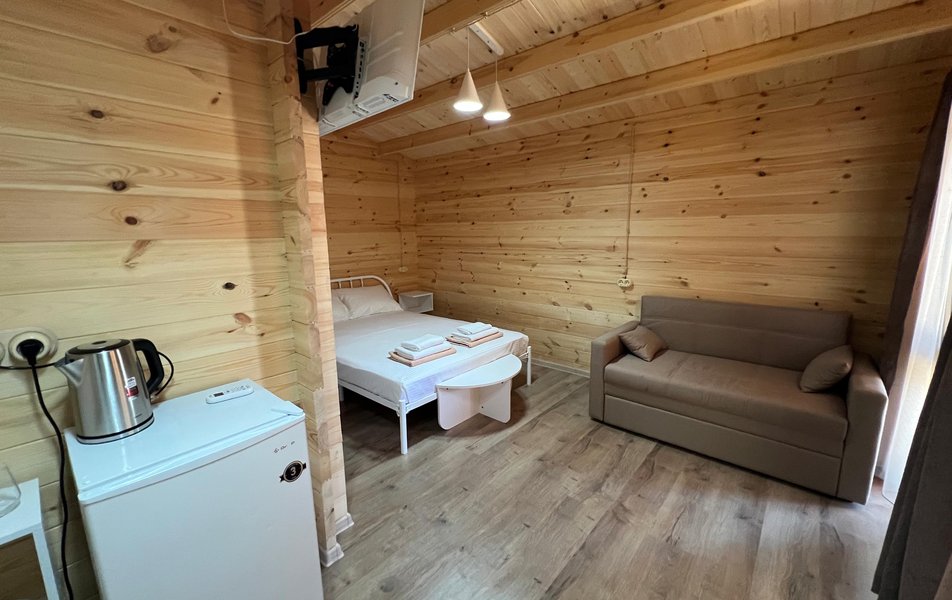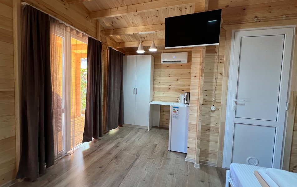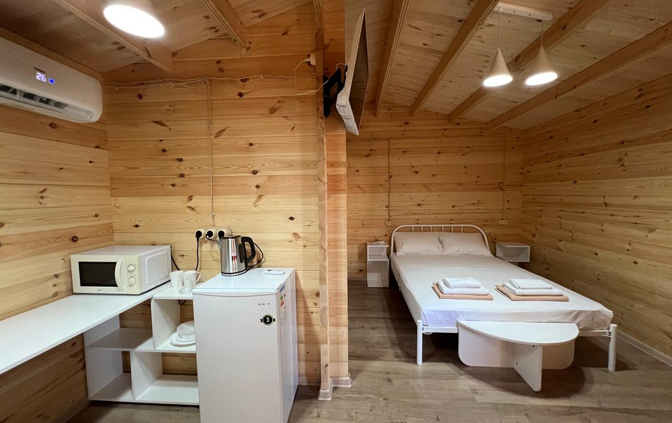 Бунгало 2-местный Количество комнат: 1-комнатный Тип номера: Дом/домик Дополнительное место: раскладной диван Кол-во доп. мест: 2 Кол-во номеров: 3 Кол-во основных мест: 2 Площадь (кв. м): 24 Мебель: диван раскладной: двухместный, кровать двуспальная, прикроватные тумбочки, столик журнальный, шкаф Оборудование: микроволновая печь, набор посуды, сплит-система, телевизор: со Smart TV, холодильник, электрочайник Санузел: с душем, туалетные принадлежности, фен Сервис: Wi-Fi бесплатно, уборка номера Терраса: оборудована мебелью