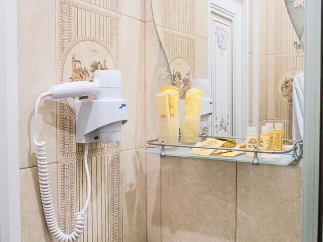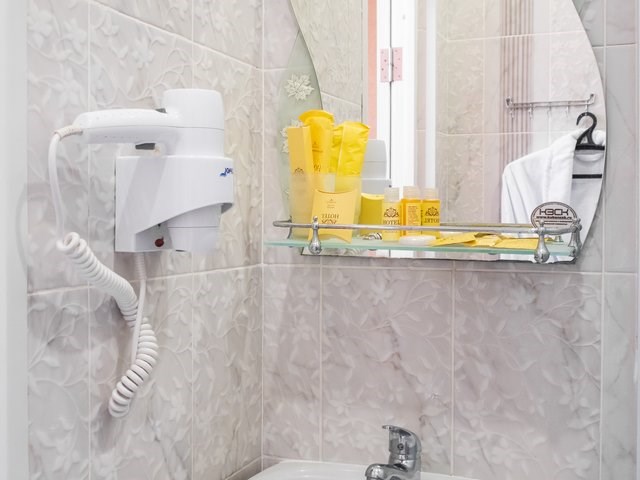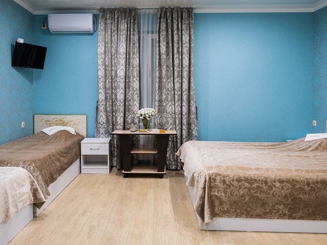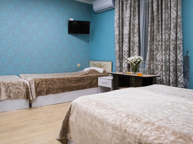 Однокомнатный номер с тремя односпальными кроватями и балконом. В числе удобств кабельное телевидение, кондиционер, мини-холодильник. Ванная комната оборудована душем, туалетными принадлежностями, феном.