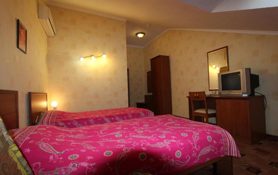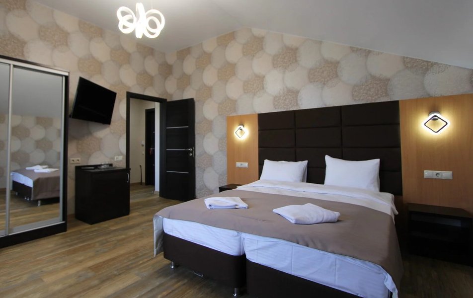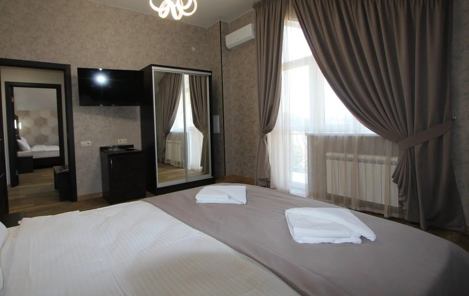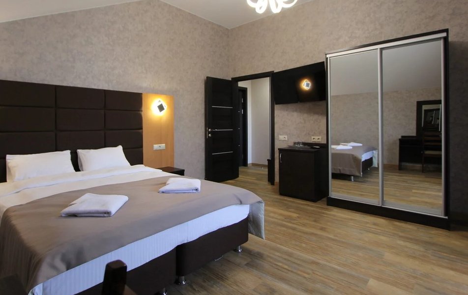Отель находится в частном секторе среди других похожих на него отелей. Парковка перед отелем на 4-5 машин. Внутри есть своё кафе, в котором можно поесть. Завтраки не пробовали, но они были с 8 до 11, дополнительно можно было приобрести за 500₽. Был небольшой балкон с 2 стульями, столом и сушилкой для белья. Вид на балконы соседнего отеля (расстояние около 20 метров). Ресепшен на первом этаже, нахождение администратора там не постоянное. Если на месте никого нет - надо позвонить по указанному телефону. На территории есть небольшой открытый бассей, стоял сложенный стол для настольного тенниса. Фен дают по запросу на ресепшене - 1 раз на все пребывание. Тёплых одеял в номере не было, дали по запросу на ресепшене. Ванная комната включает в себя душевую кабину (в хорошем состоянии), туалет, раковину, зеркало, полотенцесушитель. Есть бесплатный Wi-Fi (для использования с телефона нареканий не было). Мусор убирали практически каждый день Достоинства: - Полотенца обновлялись каждый день выдали бесплатно пляжные полотенца - Голосов из соседних номеров слышно не было - Дают одноразовые тапочки (один комплект на человека на все время пребывания) - Номер в хорошем состоянии (возможно свежий ремонт) Недостатки: - Банные принадлежности менялись не каждый день, на 5 день пребывания закончилось мыло, туалетная бумага закончилась на 3 день, пришлось идти просить на ресепшен - Вежливость на ресепшене оставила желать лучшего. При заселении выяснилось, что в номере 2 односпальные кровати, хотя бронировал 1 двуспальную. На вопрос почему не те кровати на ресепшене сказали что ничего не знают, дали номер телефона на визитке, сказали звонить туда, выяснять. Либо самому просто сдвинуть кровати (пробовали, в таком случае есть довольно большой зазор в который провалиться можно). Так как заселялись ночью, позвонил на следующий день. Сказали что вообще у них нет двуспальных кроватей. Они просто сдвигают кровати и кладут на них топпер 5 см. Попросил, чтобы положили. В итоге он не особо помог, все равно чувствовалась яма между кроватями - Ездил в Сочи на триатлон, велосипед в номер поставить не разрешили. Сказали - не знаем куда вы его будете ставить, но точно не в номер. По факту поставили в багажное отделение (комната, которая запирается на ключ) - Антенна телевизора работала плохо - в хорошую погоду показывало половина каналов, вторая половина сильно тормозила. В плохую погоду вообще отсутствовало подключение к антенне