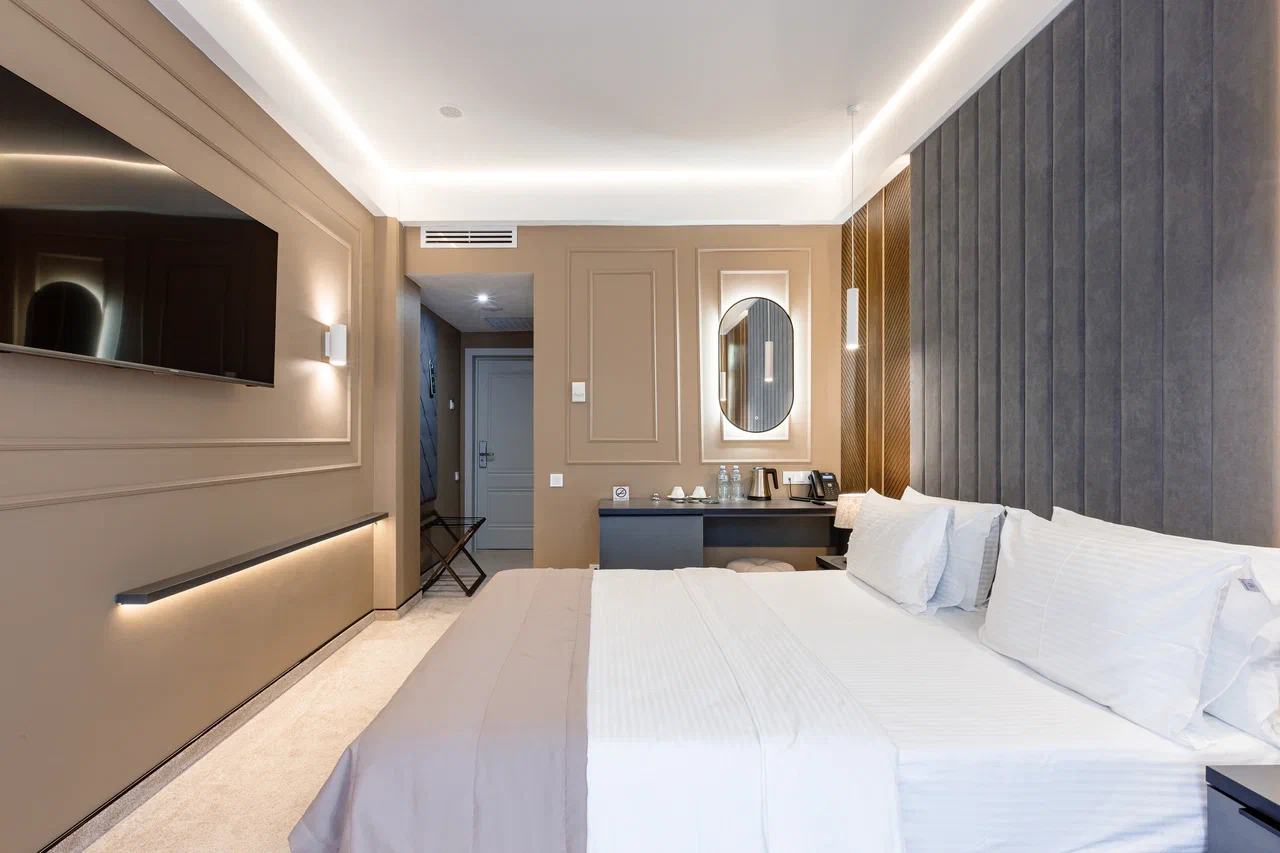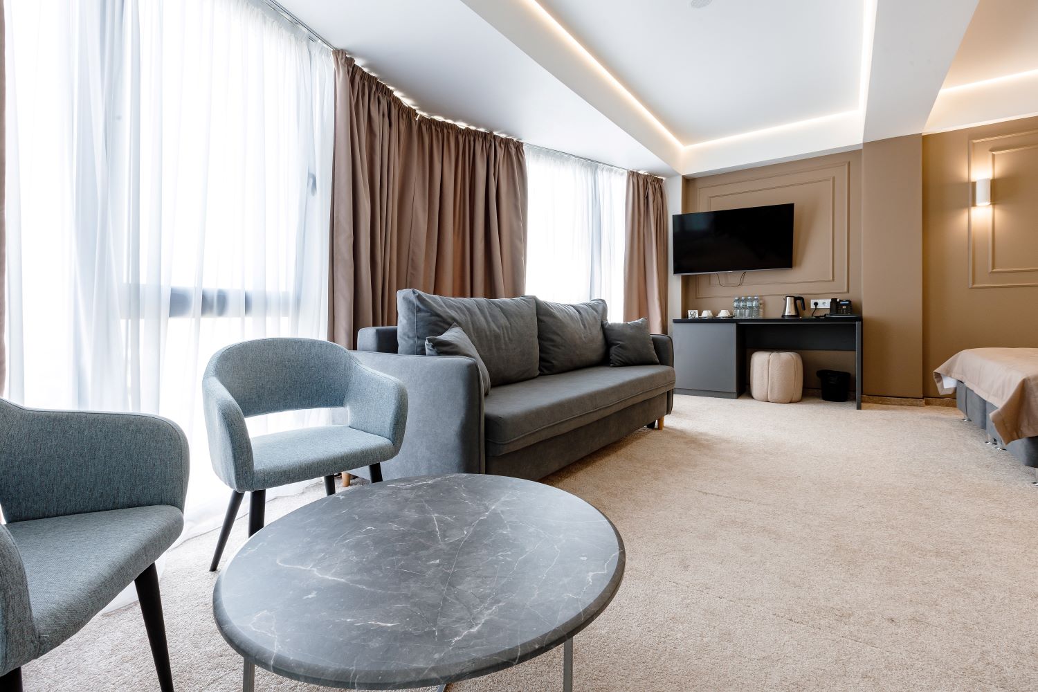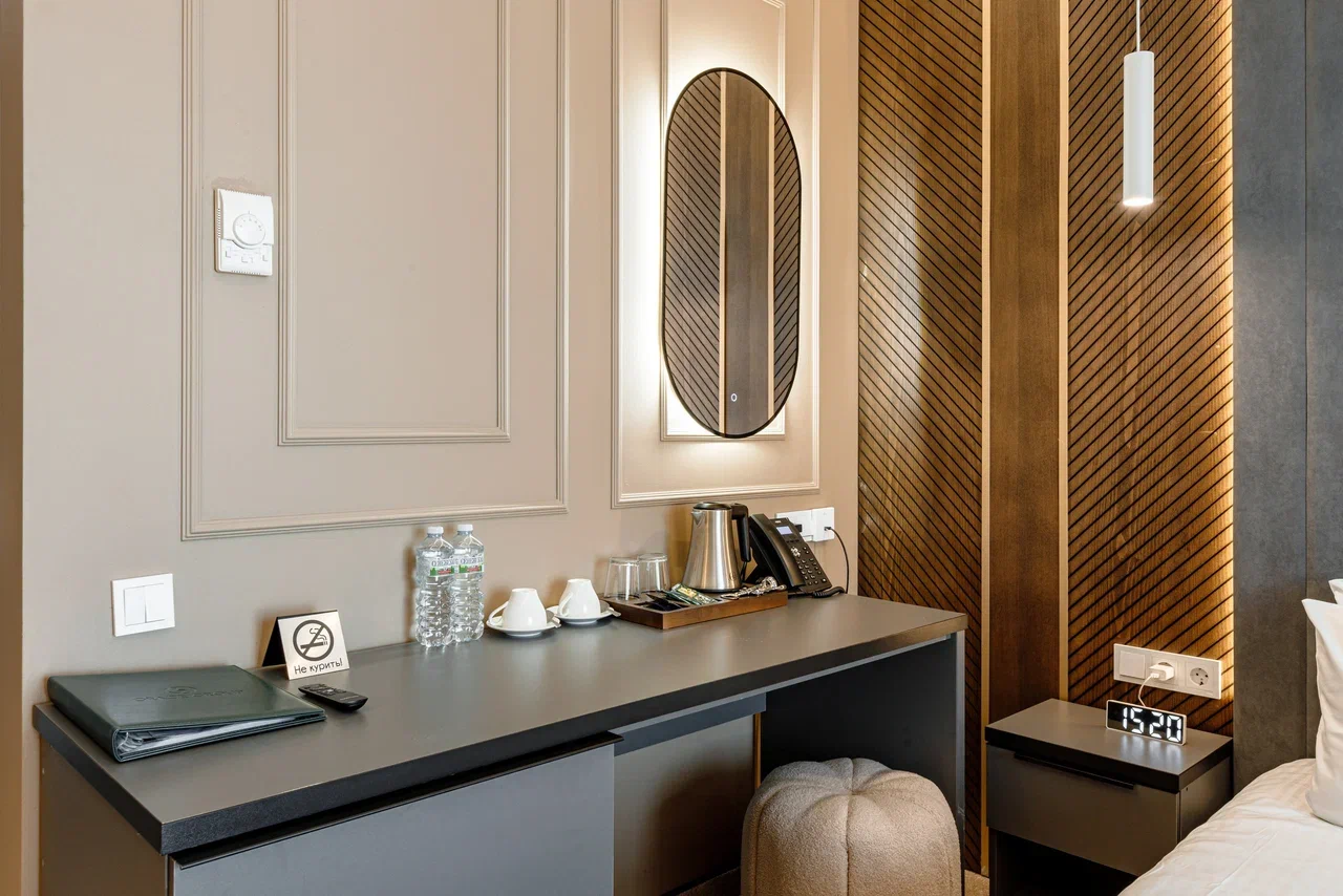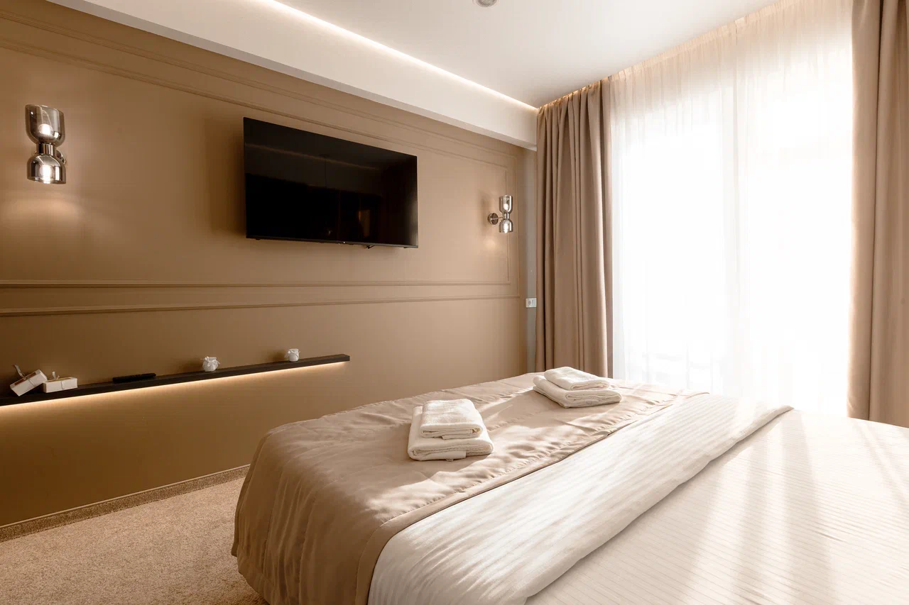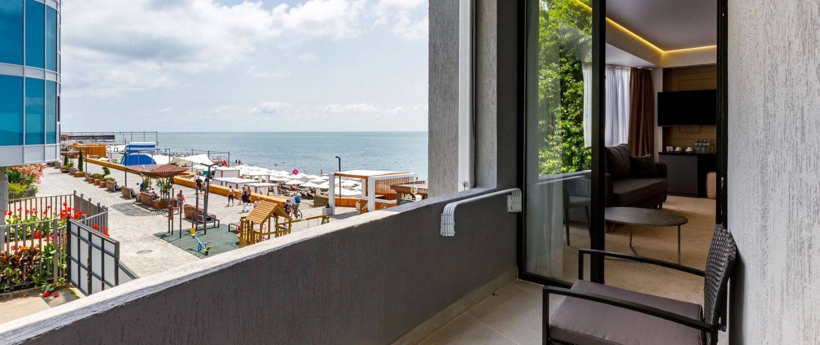 Комфортабельный номер оборудован спальней с двуспальной кроватью, диваном, ванной комнатой с душем, балконом с видом на море. К удобству гостей кондиционер, телевизор, телефон, утюг, гладильная доска, сейф, мини-холодильник, чайно-кофейные принадлежности, Wi-Fi, фен и туалетно-косметический набор. По запросу предоставляется кресло-кровать.