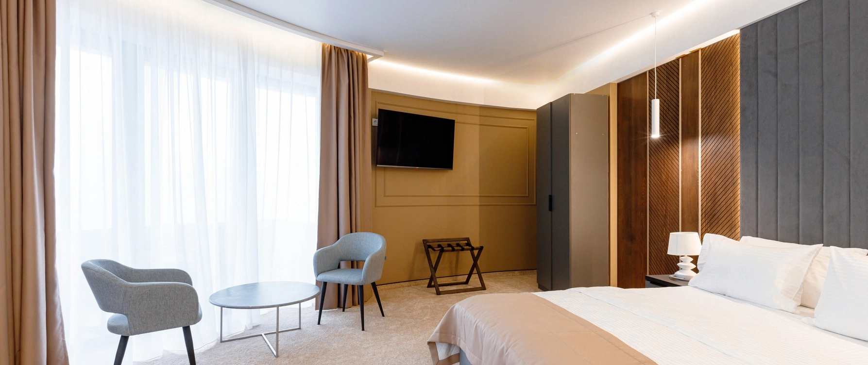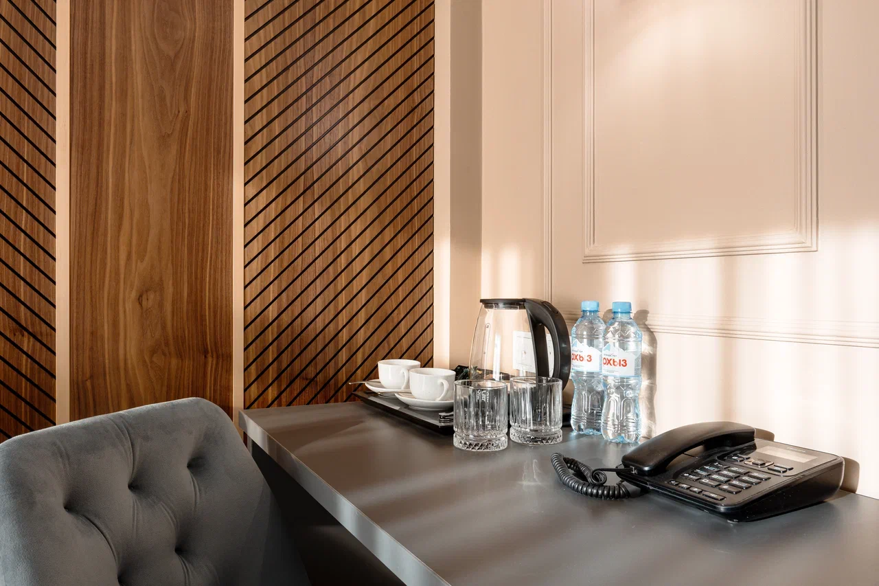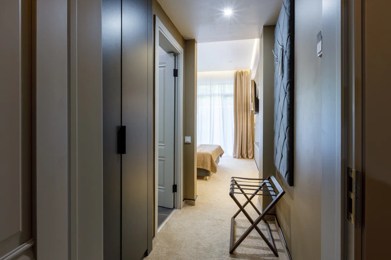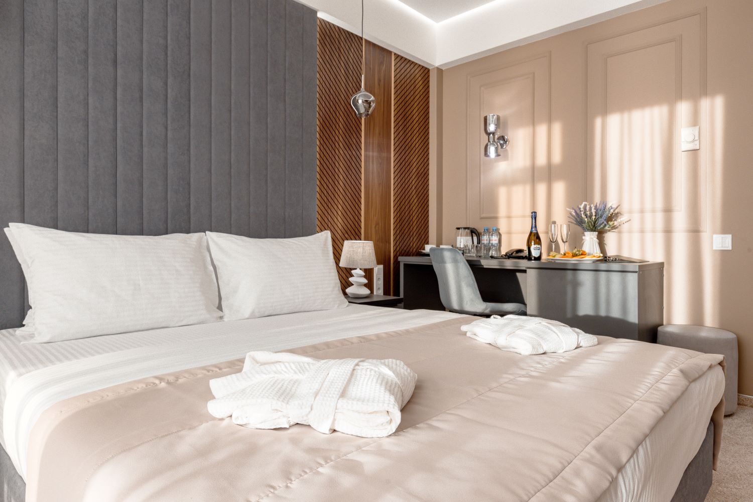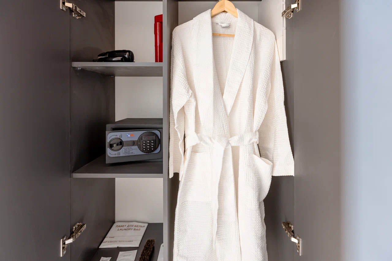 Комфортабельный номер оборудован спальней с двуспальной кроватью, диваном, ванной комнатой с душем, балконом с видом на море. К удобству гостей кондиционер, телевизор, телефон, утюг, гладильная доска, сейф, мини-холодильник, чайно-кофейные принадлежности, Wi-Fi, фен и туалетно-косметический набор. По запросу предоставляется кресло-кровать.