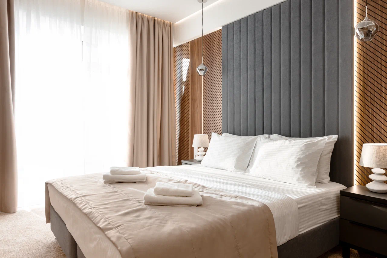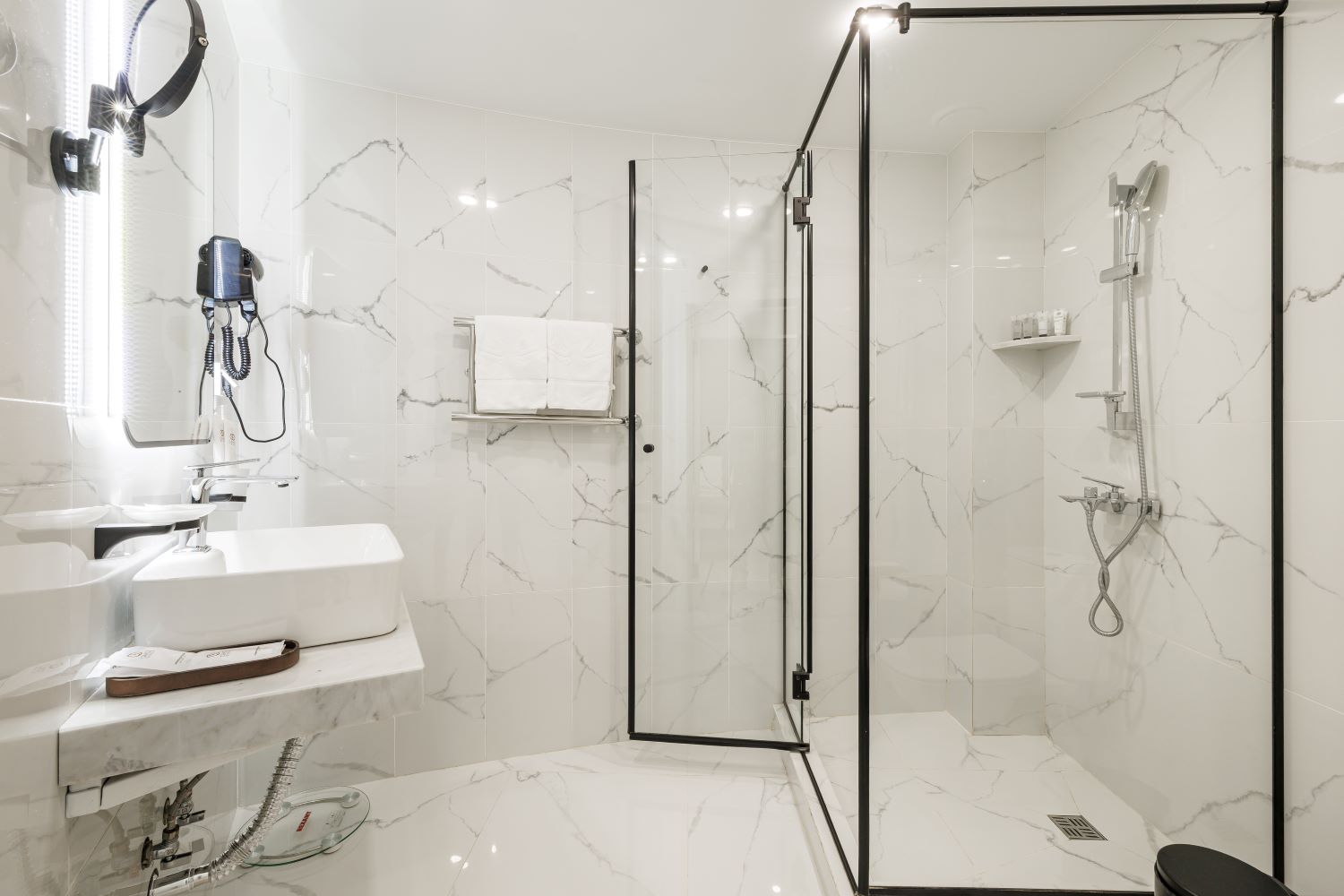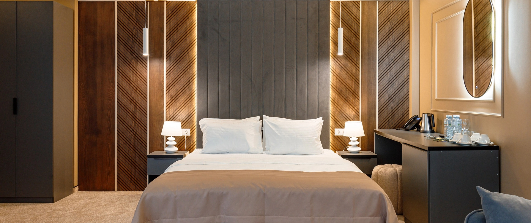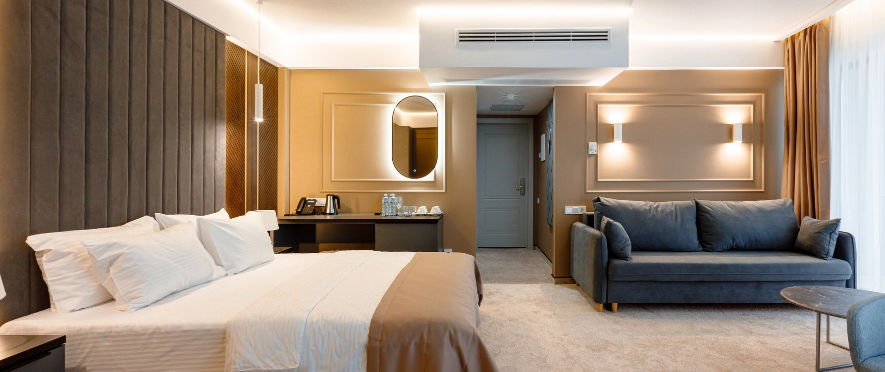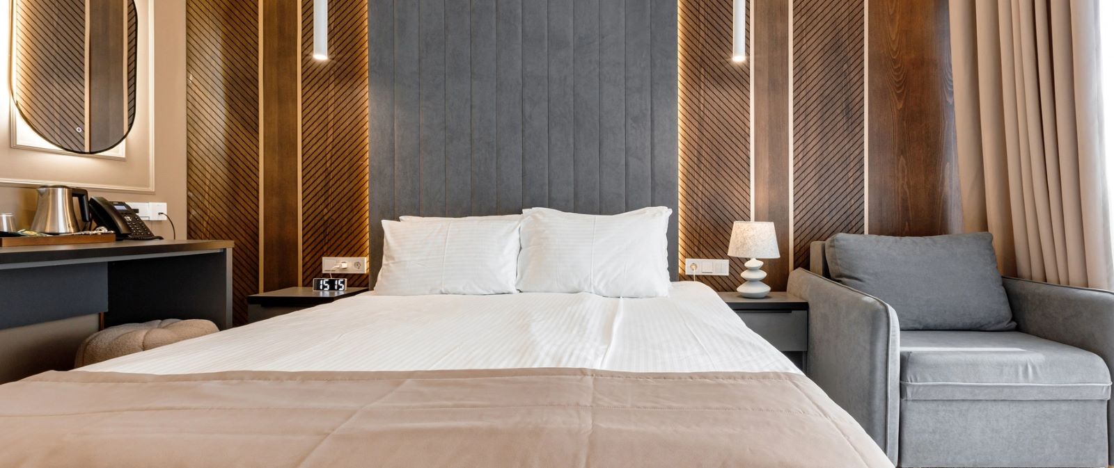 Комфортабельный номер оборудован спальней с двуспальной кроватью, диваном, ванной комнатой с душем, балконом с видом на море. К удобству гостей кондиционер, телевизор, телефон, утюг, гладильная доска, сейф, мини-холодильник, чайно-кофейные принадлежности, Wi-Fi, фен и туалетно-косметический набор. По запросу предоставляется кресло-кровать.