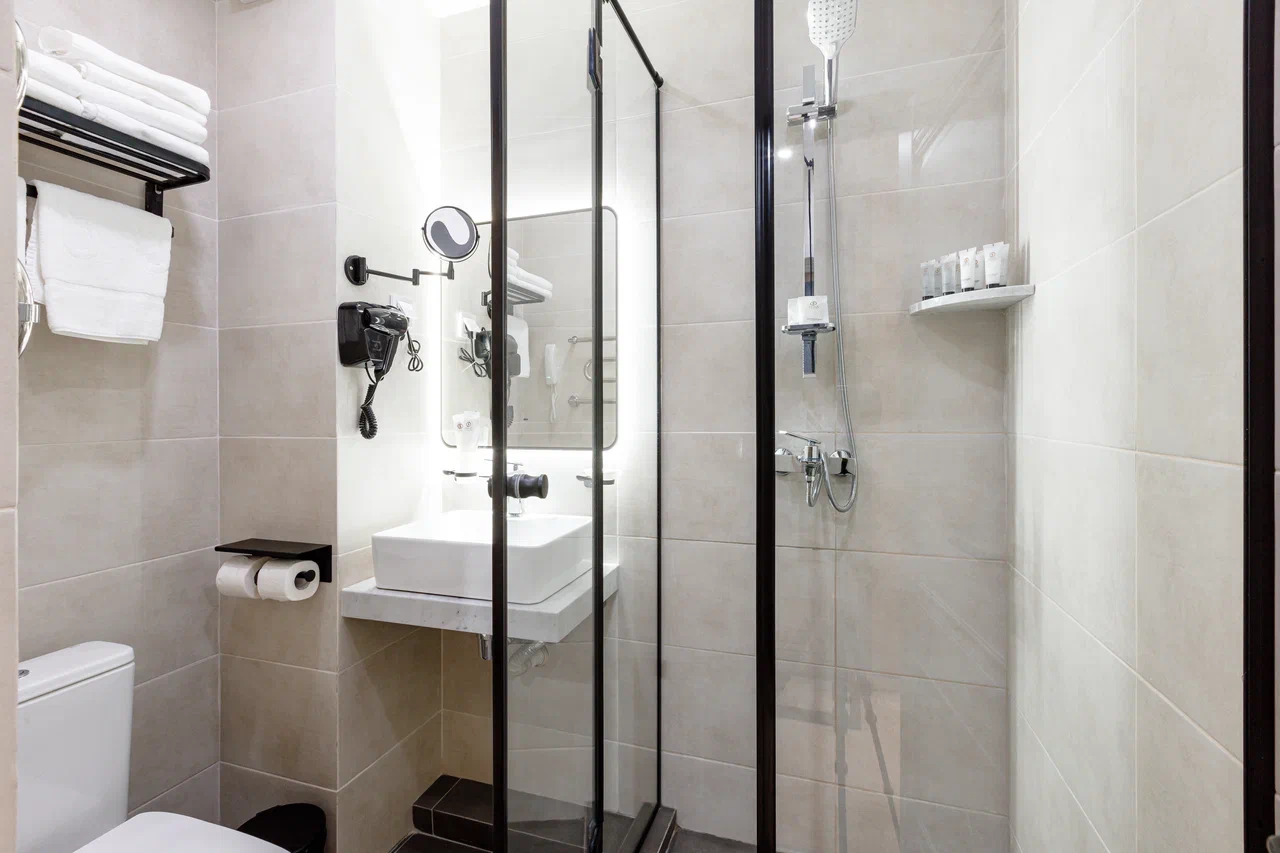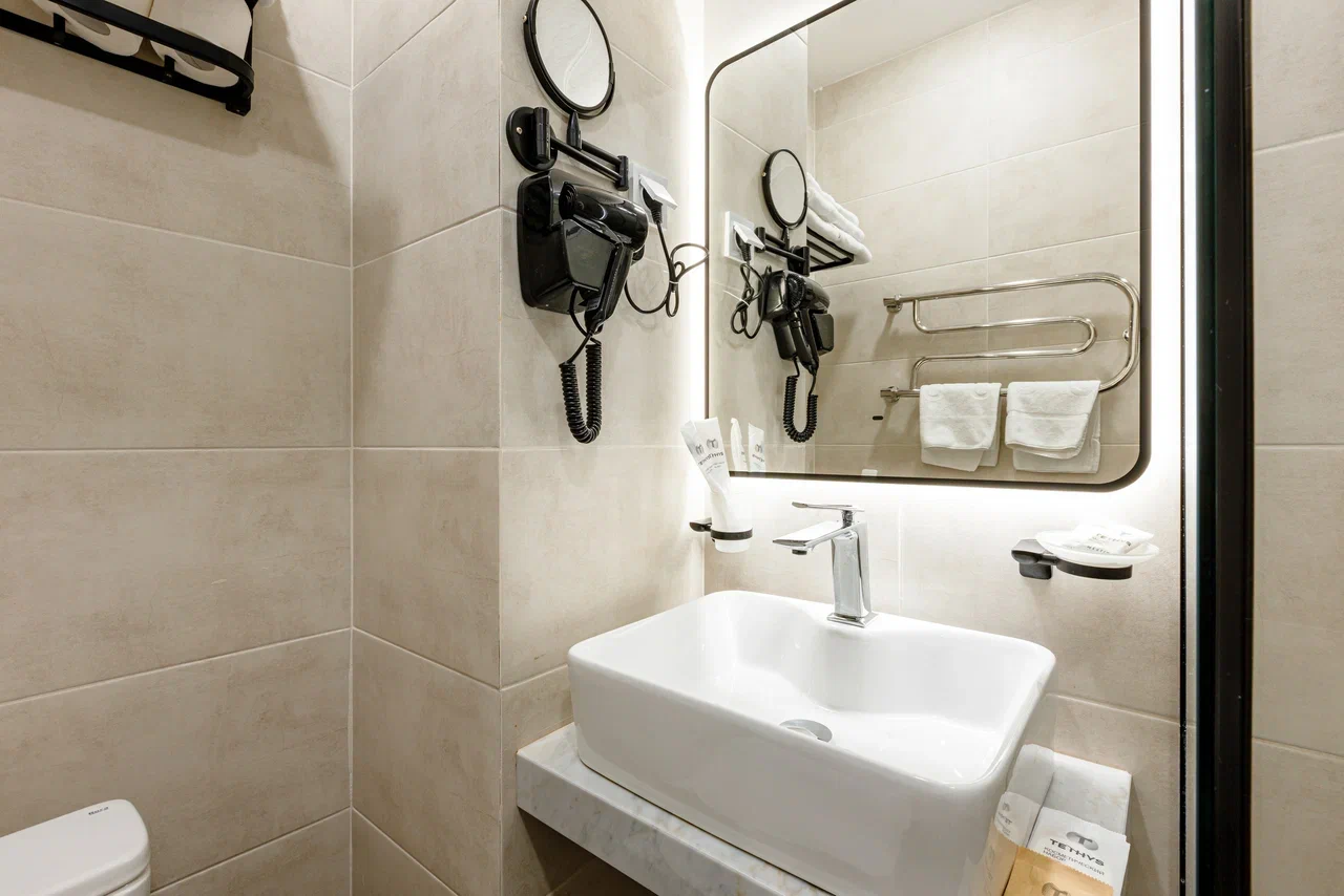 Эконом номер без окна расположен на цокольном этаже. Гости располагаются на двуспальной и кресло-кровати. Ванная комната с душевой кабиной, феном и туалетно-косметическим набором. В числе удобств - Wi-Fi, кондиционер, сейф, телевизор, гладильные принадлежности, телефон, мини-холодильник, набор для приготовления чая и кофе.