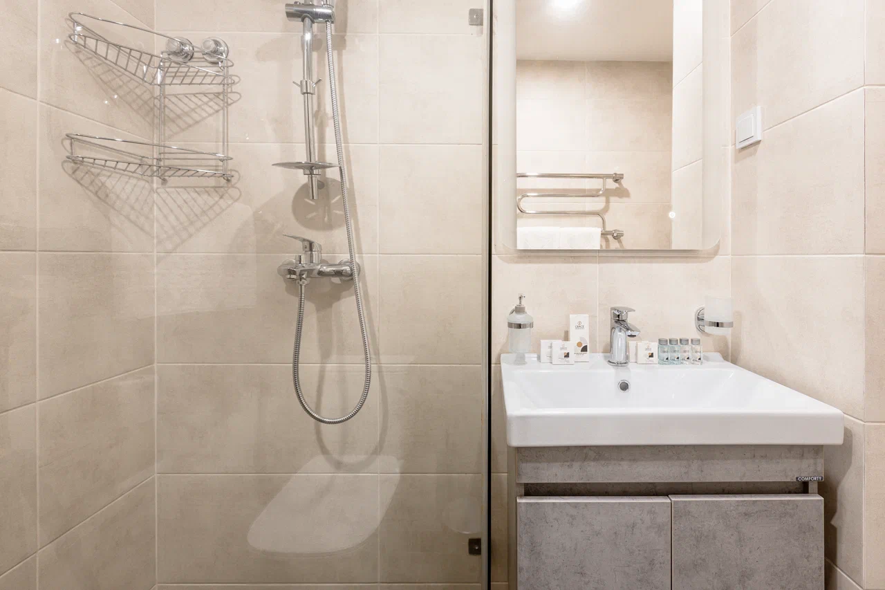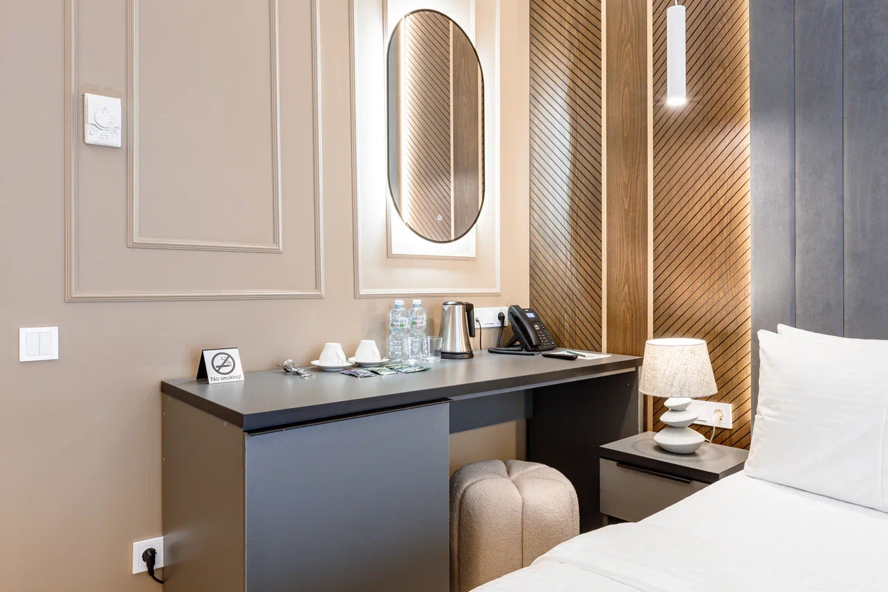 Однокомнатный номер на цокольном этаже, без окна. Для размещения предоставляется двуспальная кровать. В числе стандартных удобств - чайный набор, мини-холодильник, телефон, телевизор, сейф, кондиционер, утюг и гладильная доска, Wi-Fi. В номере ванная комната с душем, есть фен и косметический набор.