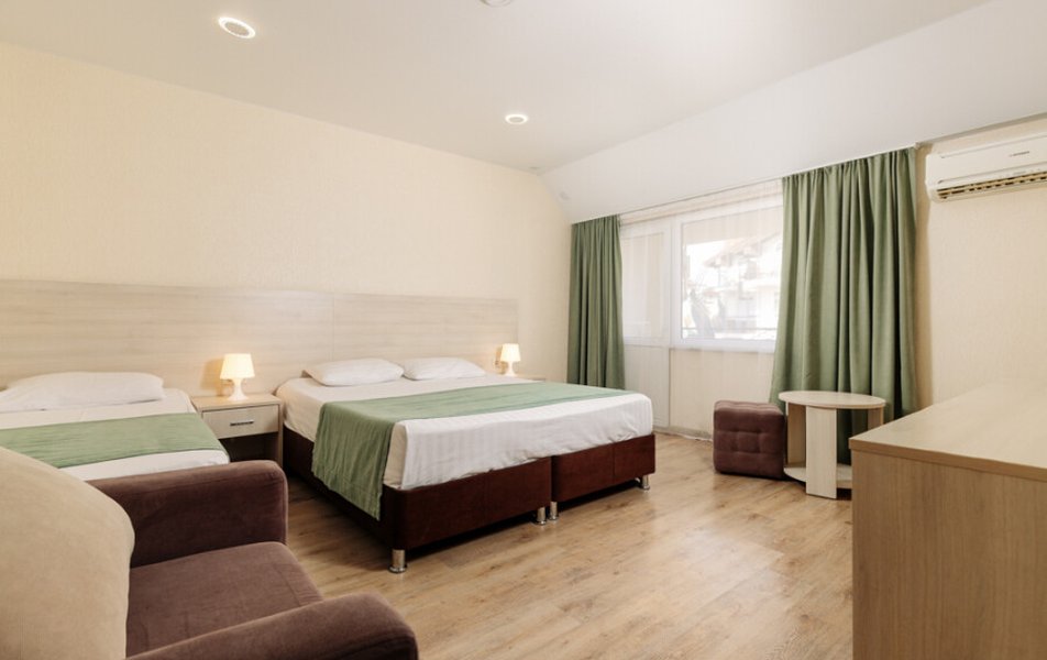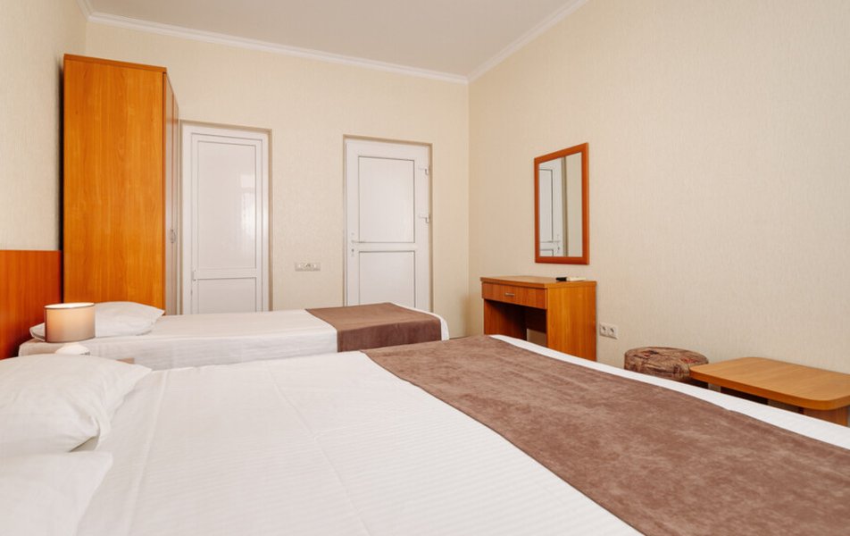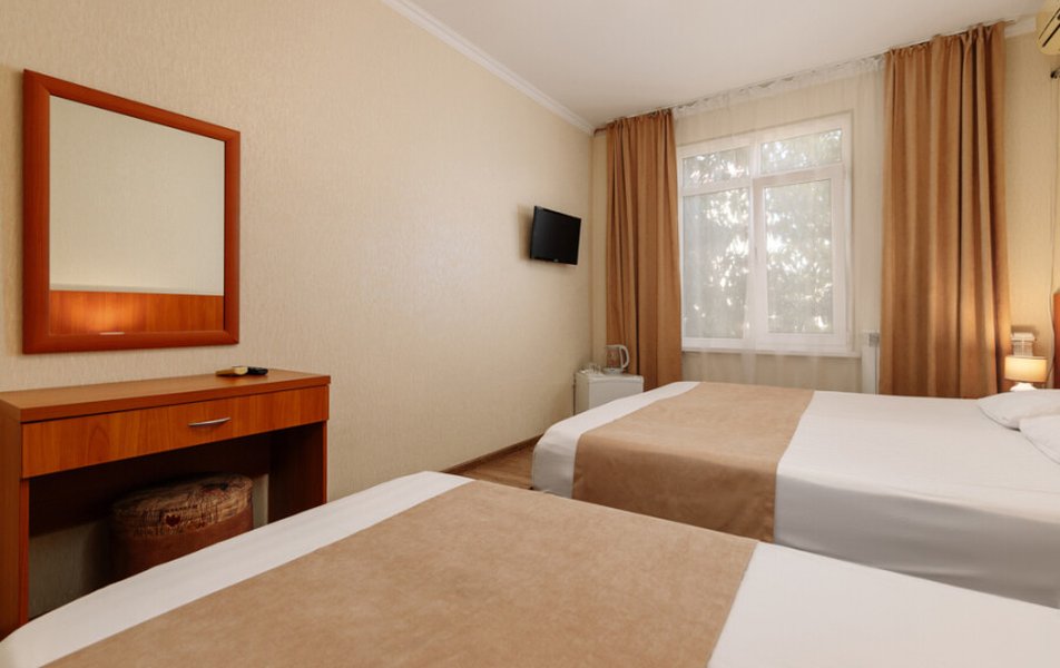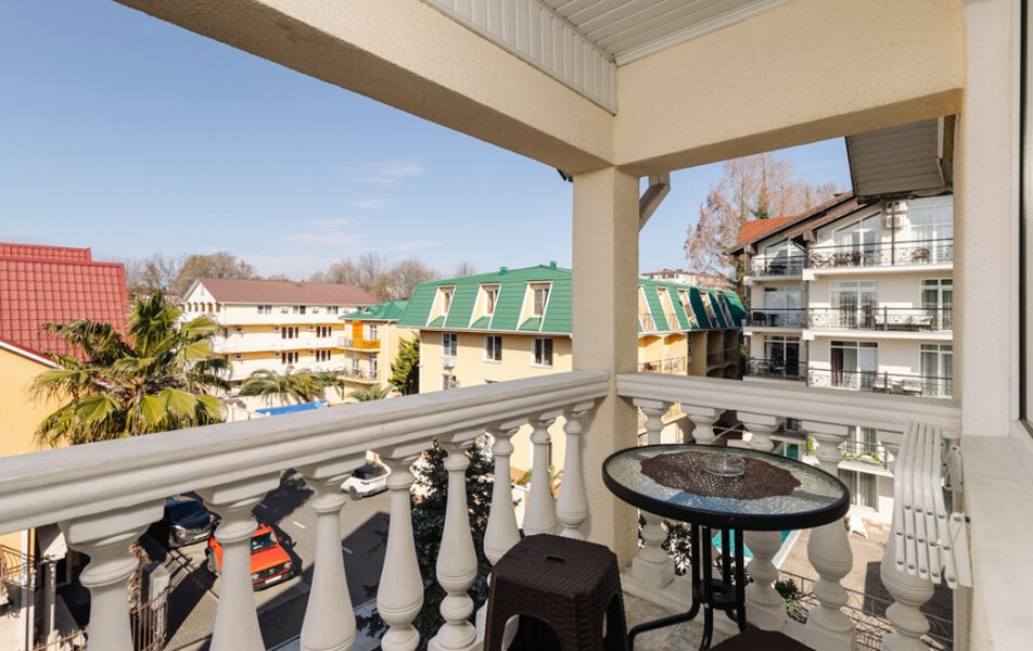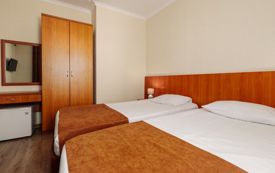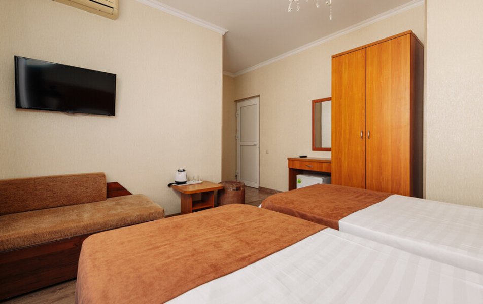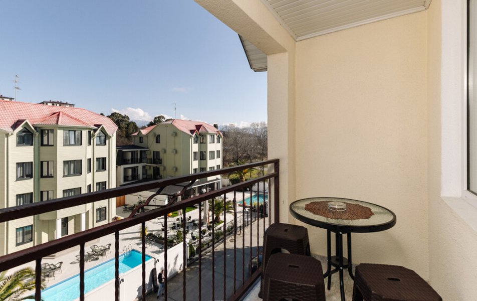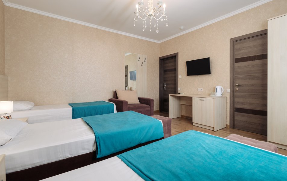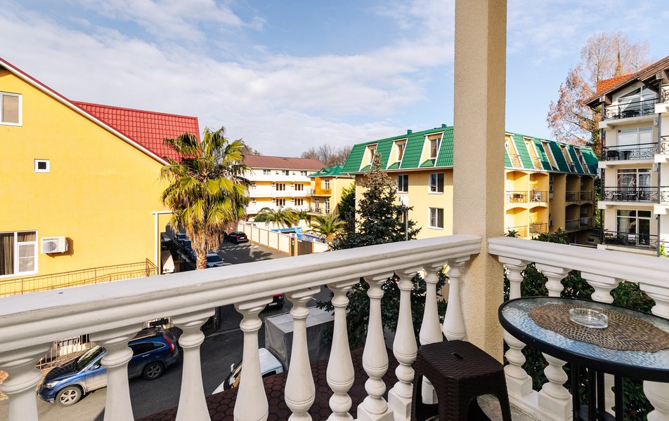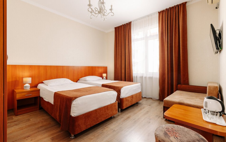 Плюсы: -Номер чистый, симпатичный, (брали трёхместный, который остался. Но жили вдвоем. На цене это не сказалось. Видимо, потому что не сезон, май 2021 выдался холодным). Окна выходят на дорогу и соседние отели. Между ними видно горы. У других номеров окна во двор. - Постели чистые. Полотенца каждому для лица, ног, тела. - Утром после 10 часов приходят забрать мусор. В санузле есть таз для стирки, тряпочка. - В номере есть плоский телевизор (не смарт, но есть HDMI и USB), фен, чайник, мини-холодильник, стол, 3 чашки (без ложек), кондиционер, сушилка, 1 двухспальная и 1 односпальная кровати, кресло, 2 тумбы со светильниками у кроватей, шкаф вешалка зеркало, 2 табуретки на балконе. Везде есть розетки, освещение - раздельно (не забудьте вставить ключ-карту в отсек у двери, иначе свет не включится). На фото отеля есть этот номер. Гладильная доска и утюг есть на этаже. В общем, минимальный набор для комфортного проживания. Не хватает микроволновки, но это уже придирки. - Шторы плотные, закрывают окно полностью. В санузле отдельная форточка. - Отзывчивый, доброжелательный персонал Минусы: -Завтрак для мужчины мал (1 каша, 2 яичница/омлет/сосиски/сырники/блины, 3 чай/кофе). За небольшую доплату можно договориться совместить, например, сосиски омлет -Сантехника немного уставшая (но, по просьбе, сразу пришли и заменили прокладку в соединении душа и смесителя) -Шумоизоляции нет вообще. Слышно сморкающегося соседа, шум воды, пролетающие самолёты (которые часто взлетают и садятся прям над головой) - Возможно, это наши придирки, но не хватает сейфа. -Из принадлежностей в санузле всего лишь мыло и шампунь. Геля для душа нет. Остальное: -В кафе поужинать вкусно (!), много, но дороговато, засчет больших порций (мы не справились, пришлось забрать с собой. Есть такая услуга). Кафе крытое. -Трансфер из аэропорта платный, 500 руб. Скорее всего, Вас забудут об этом предупредить -В шаговой доступности магазины, мост через реку в сторону старого Адлера, еда, дендрарий. Но придется немного покружить. Некоторые пути неявные, многие ведут в тупик. Если выйти к Имеретинскому гостиничному комплексу, можно сесть на автобусы до олимпийских объектов, Сочи-парка, до Красной поляны (есть вариант доехать на Ласточке). -В номере работают датчики задымления (не курить!). Курить можно на балконе, есть пепельница.
