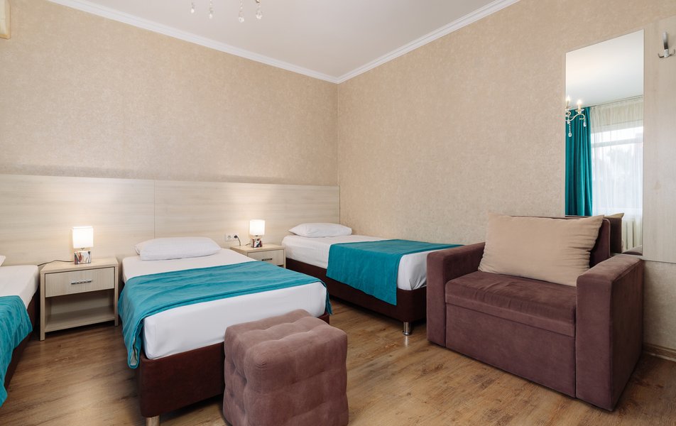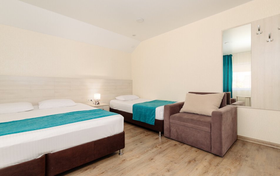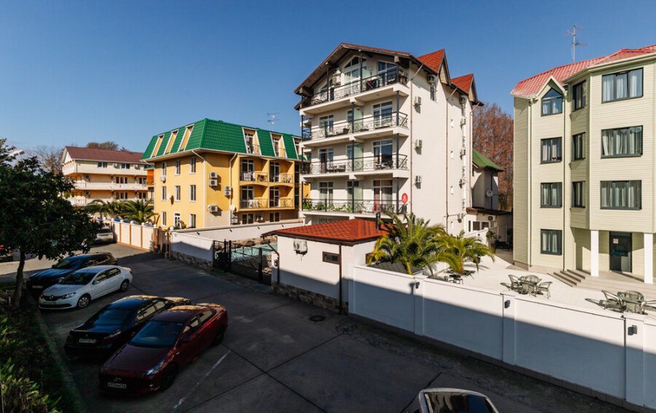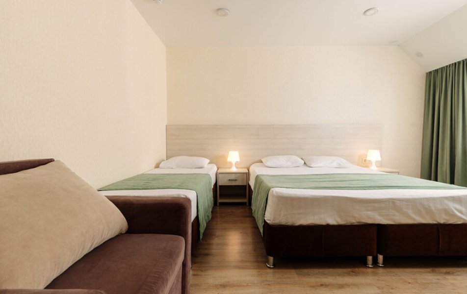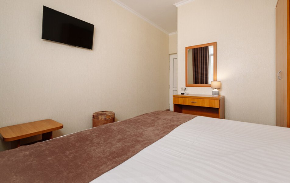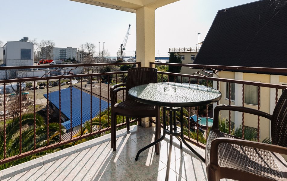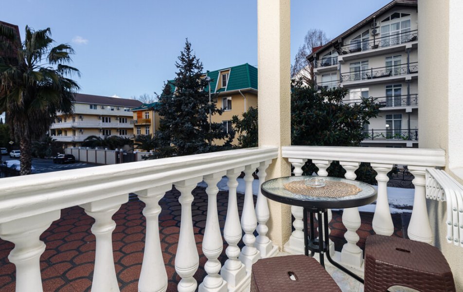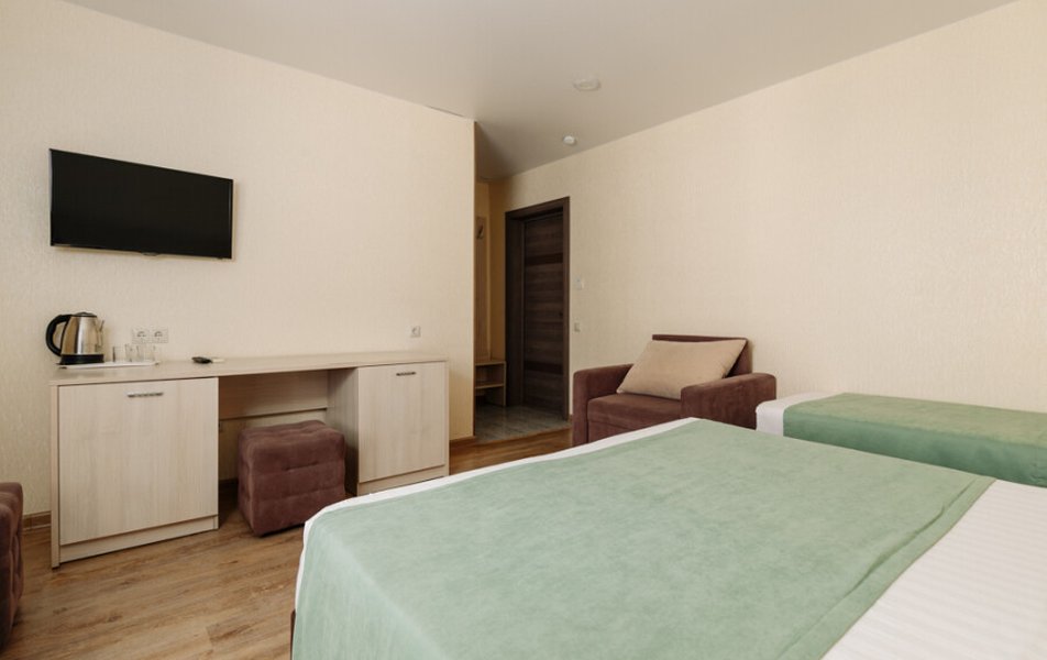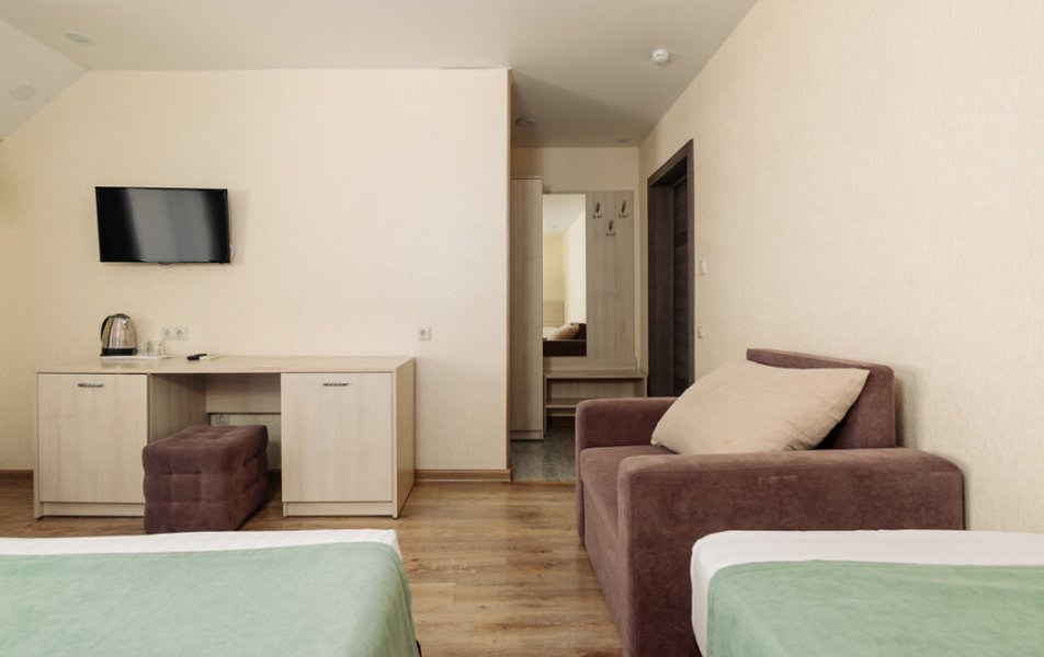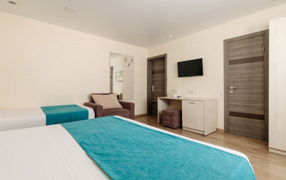 Плюсы: -Номер чистый, симпатичный, (брали трёхместный, который остался. Но жили вдвоем. На цене это не сказалось. Видимо, потому что не сезон, май 2021 выдался холодным). Окна выходят на дорогу и соседние отели. Между ними видно горы. У других номеров окна во двор. - Постели чистые. Полотенца каждому для лица, ног, тела. - Утром после 10 часов приходят забрать мусор. В санузле есть таз для стирки, тряпочка. - В номере есть плоский телевизор (не смарт, но есть HDMI и USB), фен, чайник, мини-холодильник, стол, 3 чашки (без ложек), кондиционер, сушилка, 1 двухспальная и 1 односпальная кровати, кресло, 2 тумбы со светильниками у кроватей, шкаф вешалка зеркало, 2 табуретки на балконе. Везде есть розетки, освещение - раздельно (не забудьте вставить ключ-карту в отсек у двери, иначе свет не включится). На фото отеля есть этот номер. Гладильная доска и утюг есть на этаже. В общем, минимальный набор для комфортного проживания. Не хватает микроволновки, но это уже придирки. - Шторы плотные, закрывают окно полностью. В санузле отдельная форточка. - Отзывчивый, доброжелательный персонал Минусы: -Завтрак для мужчины мал (1 каша, 2 яичница/омлет/сосиски/сырники/блины, 3 чай/кофе). За небольшую доплату можно договориться совместить, например, сосиски омлет -Сантехника немного уставшая (но, по просьбе, сразу пришли и заменили прокладку в соединении душа и смесителя) -Шумоизоляции нет вообще. Слышно сморкающегося соседа, шум воды, пролетающие самолёты (которые часто взлетают и садятся прям над головой) - Возможно, это наши придирки, но не хватает сейфа. -Из принадлежностей в санузле всего лишь мыло и шампунь. Геля для душа нет. Остальное: -В кафе поужинать вкусно (!), много, но дороговато, засчет больших порций (мы не справились, пришлось забрать с собой. Есть такая услуга). Кафе крытое. -Трансфер из аэропорта платный, 500 руб. Скорее всего, Вас забудут об этом предупредить -В шаговой доступности магазины, мост через реку в сторону старого Адлера, еда, дендрарий. Но придется немного покружить. Некоторые пути неявные, многие ведут в тупик. Если выйти к Имеретинскому гостиничному комплексу, можно сесть на автобусы до олимпийских объектов, Сочи-парка, до Красной поляны (есть вариант доехать на Ласточке). -В номере работают датчики задымления (не курить!). Курить можно на балконе, есть пепельница.