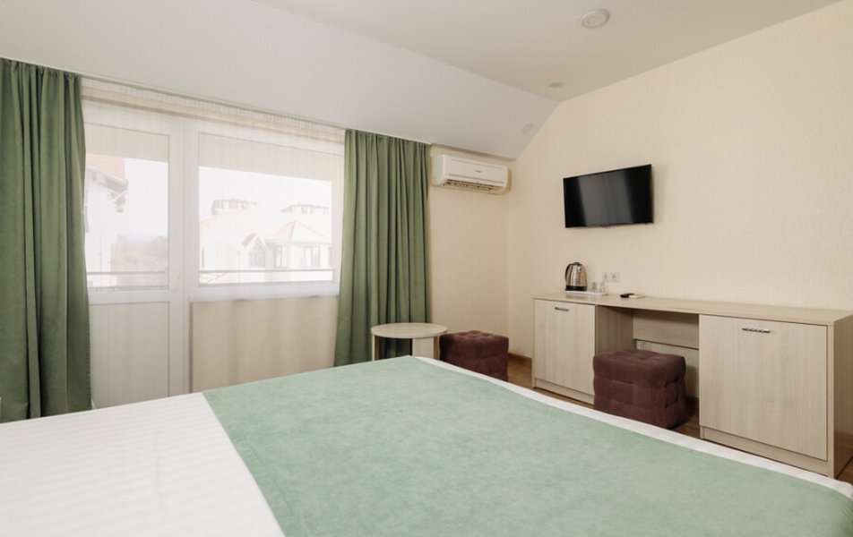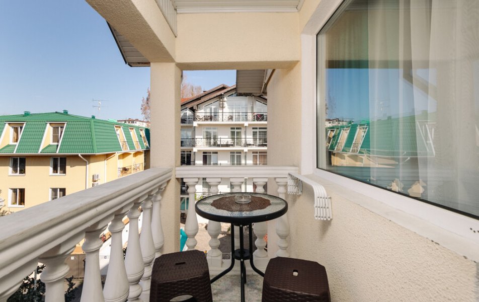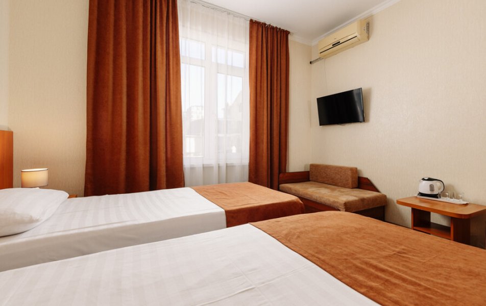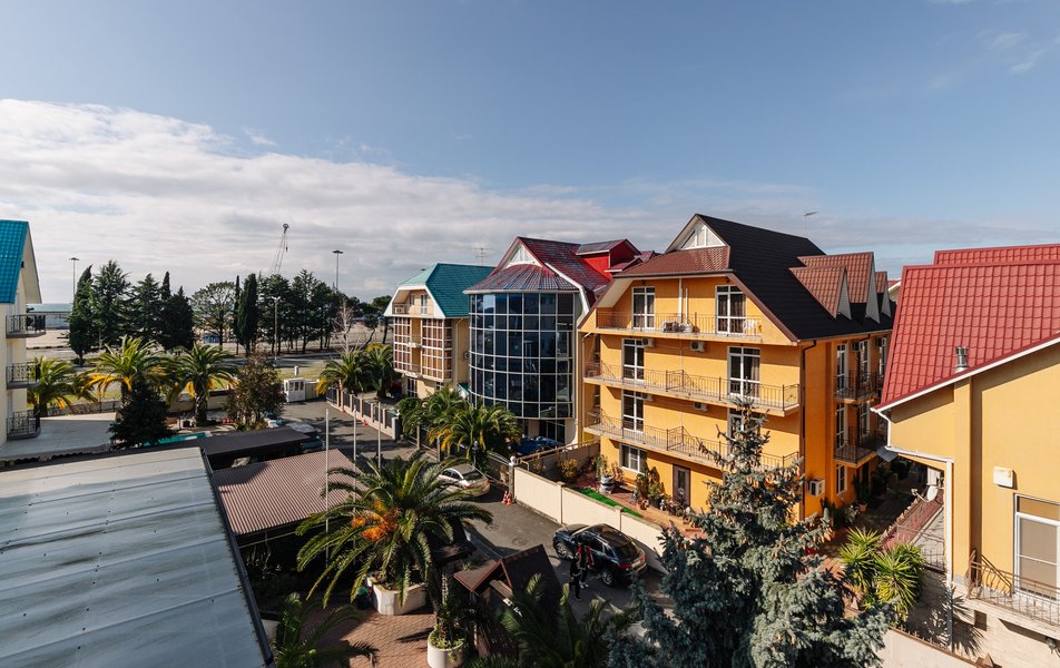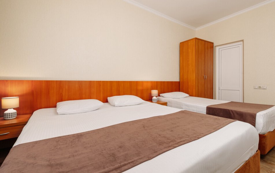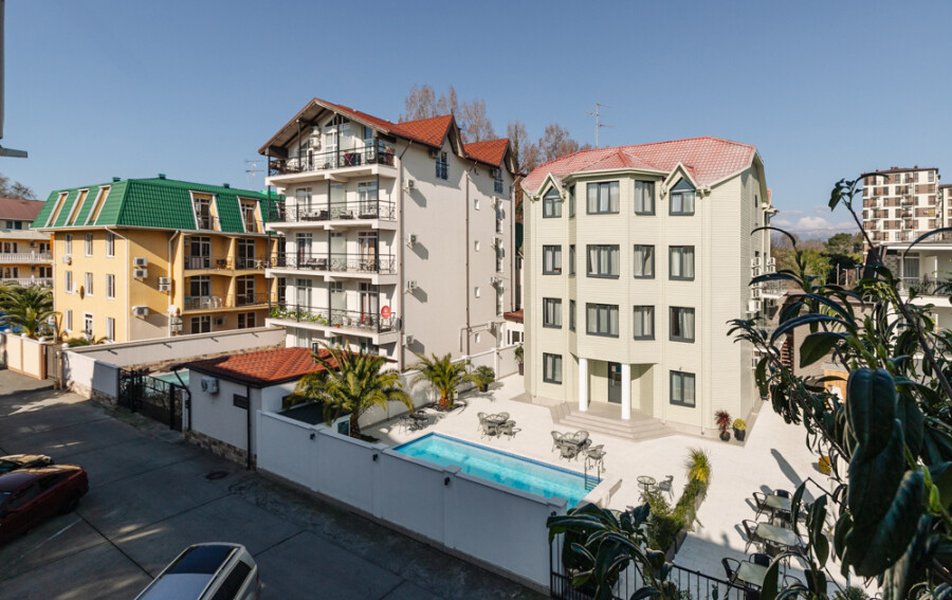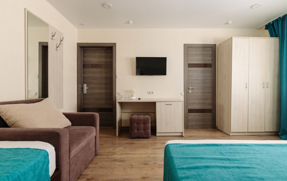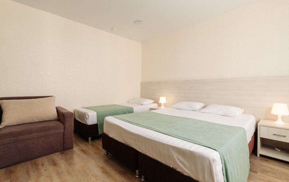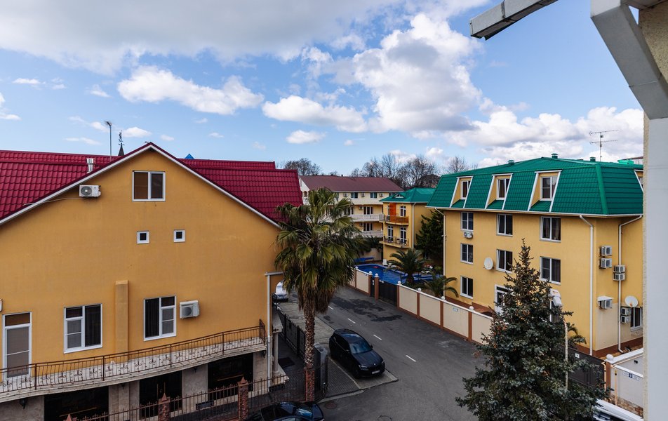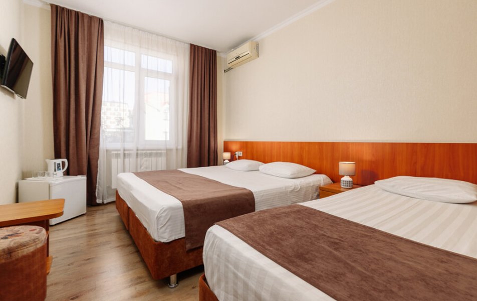 Плюсы: -Номер чистый, симпатичный, (брали трёхместный, который остался. Но жили вдвоем. На цене это не сказалось. Видимо, потому что не сезон, май 2021 выдался холодным). Окна выходят на дорогу и соседние отели. Между ними видно горы. У других номеров окна во двор. - Постели чистые. Полотенца каждому для лица, ног, тела. - Утром после 10 часов приходят забрать мусор. В санузле есть таз для стирки, тряпочка. - В номере есть плоский телевизор (не смарт, но есть HDMI и USB), фен, чайник, мини-холодильник, стол, 3 чашки (без ложек), кондиционер, сушилка, 1 двухспальная и 1 односпальная кровати, кресло, 2 тумбы со светильниками у кроватей, шкаф вешалка зеркало, 2 табуретки на балконе. Везде есть розетки, освещение - раздельно (не забудьте вставить ключ-карту в отсек у двери, иначе свет не включится). На фото отеля есть этот номер. Гладильная доска и утюг есть на этаже. В общем, минимальный набор для комфортного проживания. Не хватает микроволновки, но это уже придирки. - Шторы плотные, закрывают окно полностью. В санузле отдельная форточка. - Отзывчивый, доброжелательный персонал Минусы: -Завтрак для мужчины мал (1 каша, 2 яичница/омлет/сосиски/сырники/блины, 3 чай/кофе). За небольшую доплату можно договориться совместить, например, сосиски омлет -Сантехника немного уставшая (но, по просьбе, сразу пришли и заменили прокладку в соединении душа и смесителя) -Шумоизоляции нет вообще. Слышно сморкающегося соседа, шум воды, пролетающие самолёты (которые часто взлетают и садятся прям над головой) - Возможно, это наши придирки, но не хватает сейфа. -Из принадлежностей в санузле всего лишь мыло и шампунь. Геля для душа нет. Остальное: -В кафе поужинать вкусно (!), много, но дороговато, засчет больших порций (мы не справились, пришлось забрать с собой. Есть такая услуга). Кафе крытое. -Трансфер из аэропорта платный, 500 руб. Скорее всего, Вас забудут об этом предупредить -В шаговой доступности магазины, мост через реку в сторону старого Адлера, еда, дендрарий. Но придется немного покружить. Некоторые пути неявные, многие ведут в тупик. Если выйти к Имеретинскому гостиничному комплексу, можно сесть на автобусы до олимпийских объектов, Сочи-парка, до Красной поляны (есть вариант доехать на Ласточке). -В номере работают датчики задымления (не курить!). Курить можно на балконе, есть пепельница.