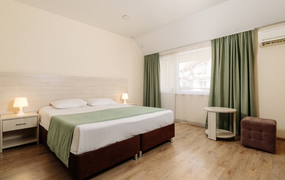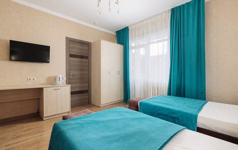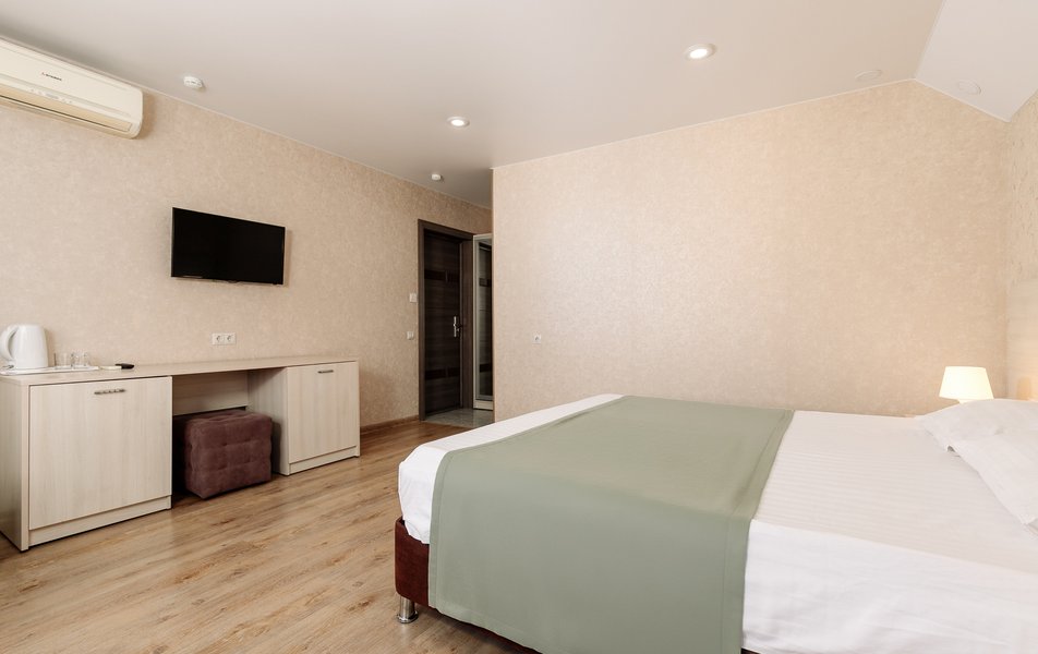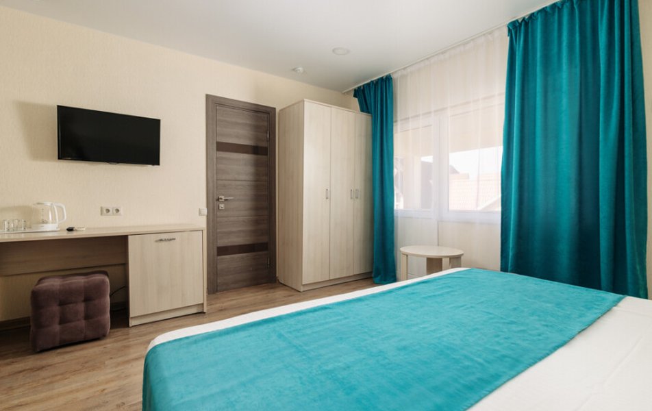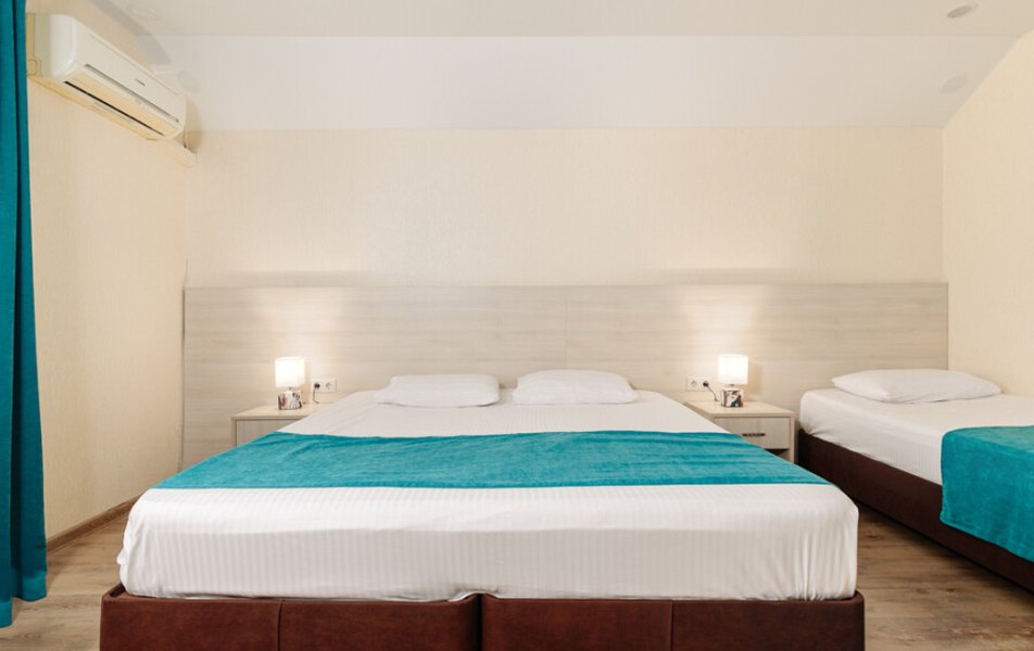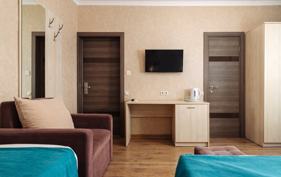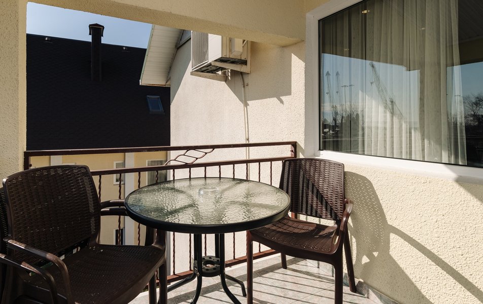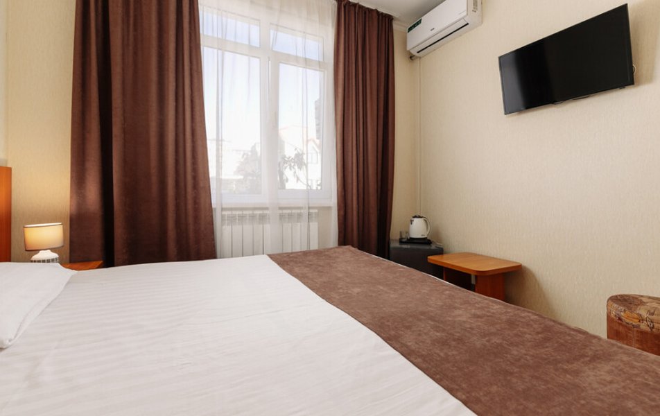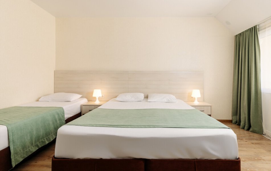 Плюсы: -Номер чистый, симпатичный, (брали трёхместный, который остался. Но жили вдвоем. На цене это не сказалось. Видимо, потому что не сезон, май 2021 выдался холодным). Окна выходят на дорогу и соседние отели. Между ними видно горы. У других номеров окна во двор. - Постели чистые. Полотенца каждому для лица, ног, тела. - Утром после 10 часов приходят забрать мусор. В санузле есть таз для стирки, тряпочка. - В номере есть плоский телевизор (не смарт, но есть HDMI и USB), фен, чайник, мини-холодильник, стол, 3 чашки (без ложек), кондиционер, сушилка, 1 двухспальная и 1 односпальная кровати, кресло, 2 тумбы со светильниками у кроватей, шкаф вешалка зеркало, 2 табуретки на балконе. Везде есть розетки, освещение - раздельно (не забудьте вставить ключ-карту в отсек у двери, иначе свет не включится). На фото отеля есть этот номер. Гладильная доска и утюг есть на этаже. В общем, минимальный набор для комфортного проживания. Не хватает микроволновки, но это уже придирки. - Шторы плотные, закрывают окно полностью. В санузле отдельная форточка. - Отзывчивый, доброжелательный персонал Минусы: -Завтрак для мужчины мал (1 каша, 2 яичница/омлет/сосиски/сырники/блины, 3 чай/кофе). За небольшую доплату можно договориться совместить, например, сосиски омлет -Сантехника немного уставшая (но, по просьбе, сразу пришли и заменили прокладку в соединении душа и смесителя) -Шумоизоляции нет вообще. Слышно сморкающегося соседа, шум воды, пролетающие самолёты (которые часто взлетают и садятся прям над головой) - Возможно, это наши придирки, но не хватает сейфа. -Из принадлежностей в санузле всего лишь мыло и шампунь. Геля для душа нет. Остальное: -В кафе поужинать вкусно (!), много, но дороговато, засчет больших порций (мы не справились, пришлось забрать с собой. Есть такая услуга). Кафе крытое. -Трансфер из аэропорта платный, 500 руб. Скорее всего, Вас забудут об этом предупредить -В шаговой доступности магазины, мост через реку в сторону старого Адлера, еда, дендрарий. Но придется немного покружить. Некоторые пути неявные, многие ведут в тупик. Если выйти к Имеретинскому гостиничному комплексу, можно сесть на автобусы до олимпийских объектов, Сочи-парка, до Красной поляны (есть вариант доехать на Ласточке). -В номере работают датчики задымления (не курить!). Курить можно на балконе, есть пепельница.