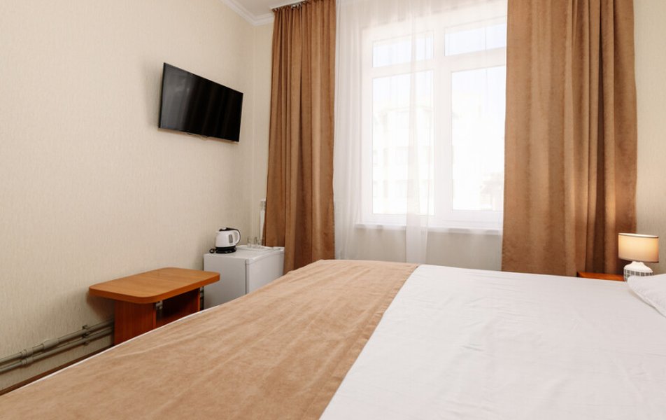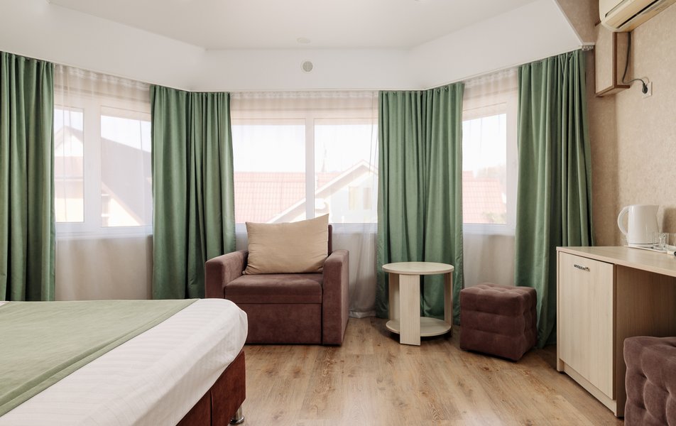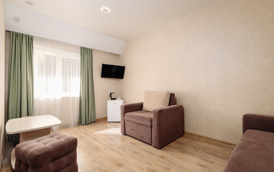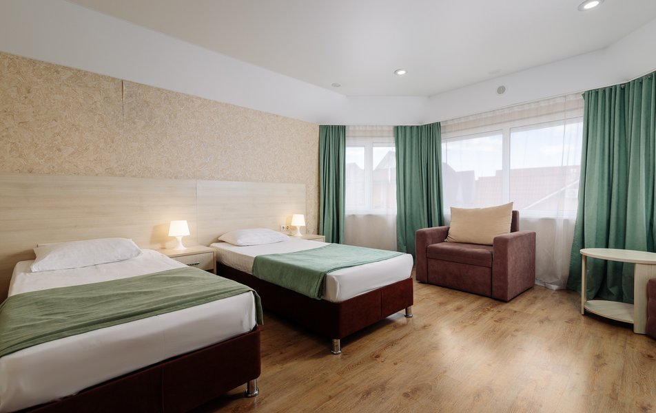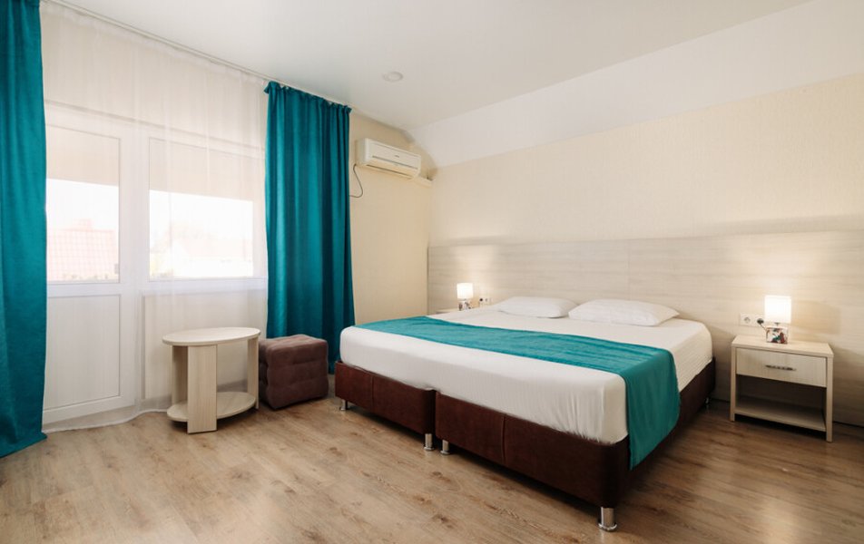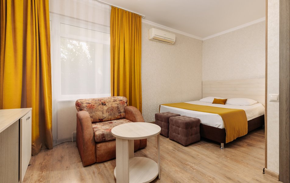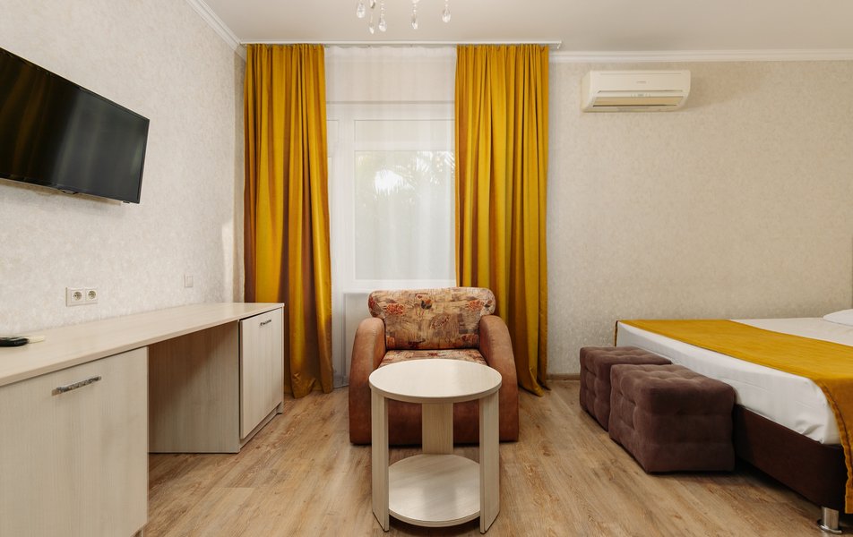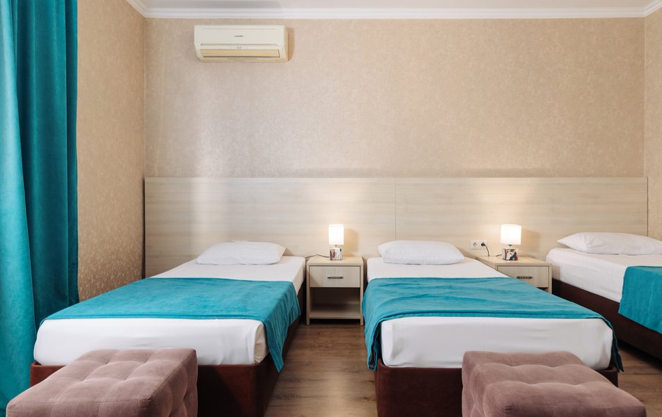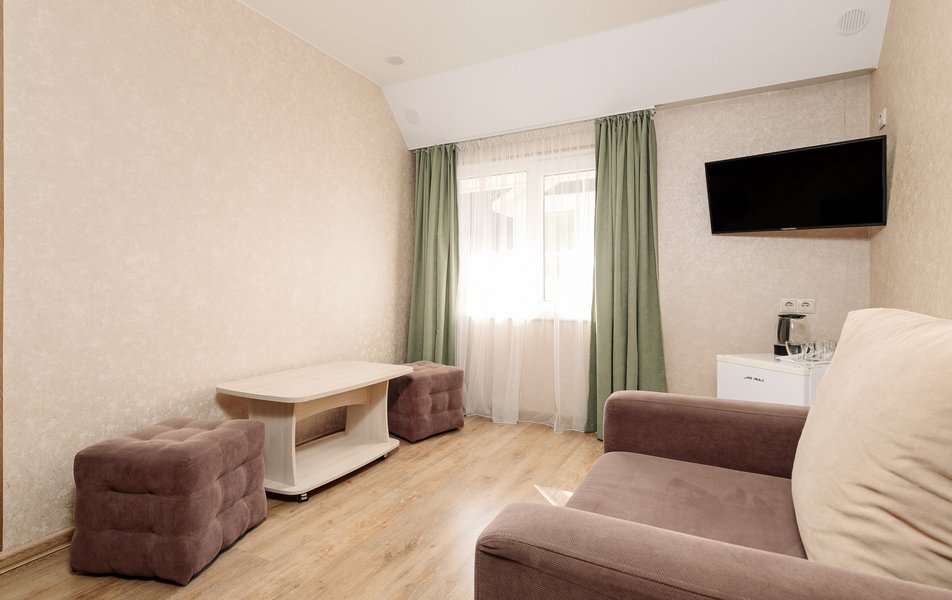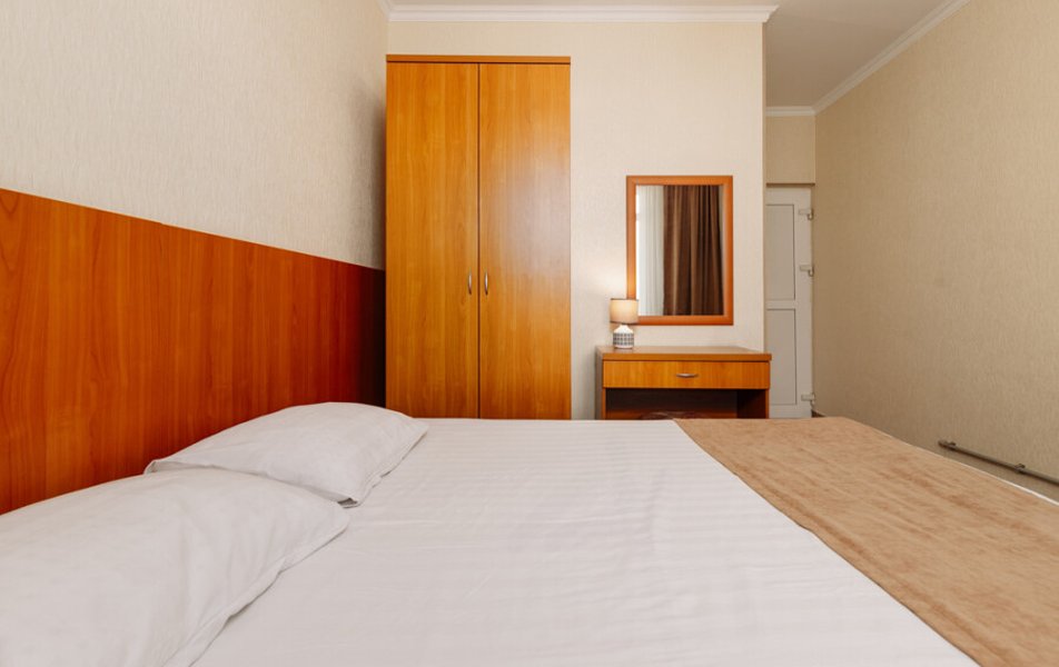 Плюсы: -Номер чистый, симпатичный, (брали трёхместный, который остался. Но жили вдвоем. На цене это не сказалось. Видимо, потому что не сезон, май 2021 выдался холодным). Окна выходят на дорогу и соседние отели. Между ними видно горы. У других номеров окна во двор. - Постели чистые. Полотенца каждому для лица, ног, тела. - Утром после 10 часов приходят забрать мусор. В санузле есть таз для стирки, тряпочка. - В номере есть плоский телевизор (не смарт, но есть HDMI и USB), фен, чайник, мини-холодильник, стол, 3 чашки (без ложек), кондиционер, сушилка, 1 двухспальная и 1 односпальная кровати, кресло, 2 тумбы со светильниками у кроватей, шкаф вешалка зеркало, 2 табуретки на балконе. Везде есть розетки, освещение - раздельно (не забудьте вставить ключ-карту в отсек у двери, иначе свет не включится). На фото отеля есть этот номер. Гладильная доска и утюг есть на этаже. В общем, минимальный набор для комфортного проживания. Не хватает микроволновки, но это уже придирки. - Шторы плотные, закрывают окно полностью. В санузле отдельная форточка. - Отзывчивый, доброжелательный персонал Минусы: -Завтрак для мужчины мал (1 каша, 2 яичница/омлет/сосиски/сырники/блины, 3 чай/кофе). За небольшую доплату можно договориться совместить, например, сосиски омлет -Сантехника немного уставшая (но, по просьбе, сразу пришли и заменили прокладку в соединении душа и смесителя) -Шумоизоляции нет вообще. Слышно сморкающегося соседа, шум воды, пролетающие самолёты (которые часто взлетают и садятся прям над головой) - Возможно, это наши придирки, но не хватает сейфа. -Из принадлежностей в санузле всего лишь мыло и шампунь. Геля для душа нет. Остальное: -В кафе поужинать вкусно (!), много, но дороговато, засчет больших порций (мы не справились, пришлось забрать с собой. Есть такая услуга). Кафе крытое. -Трансфер из аэропорта платный, 500 руб. Скорее всего, Вас забудут об этом предупредить -В шаговой доступности магазины, мост через реку в сторону старого Адлера, еда, дендрарий. Но придется немного покружить. Некоторые пути неявные, многие ведут в тупик. Если выйти к Имеретинскому гостиничному комплексу, можно сесть на автобусы до олимпийских объектов, Сочи-парка, до Красной поляны (есть вариант доехать на Ласточке). -В номере работают датчики задымления (не курить!). Курить можно на балконе, есть пепельница.