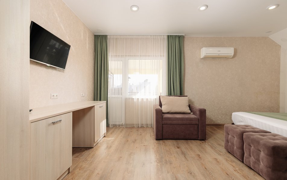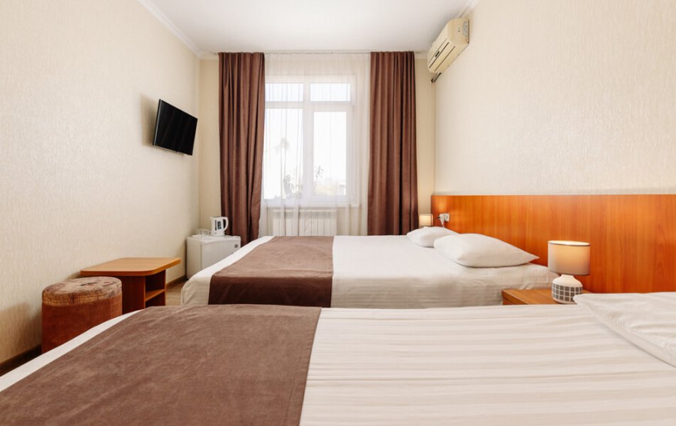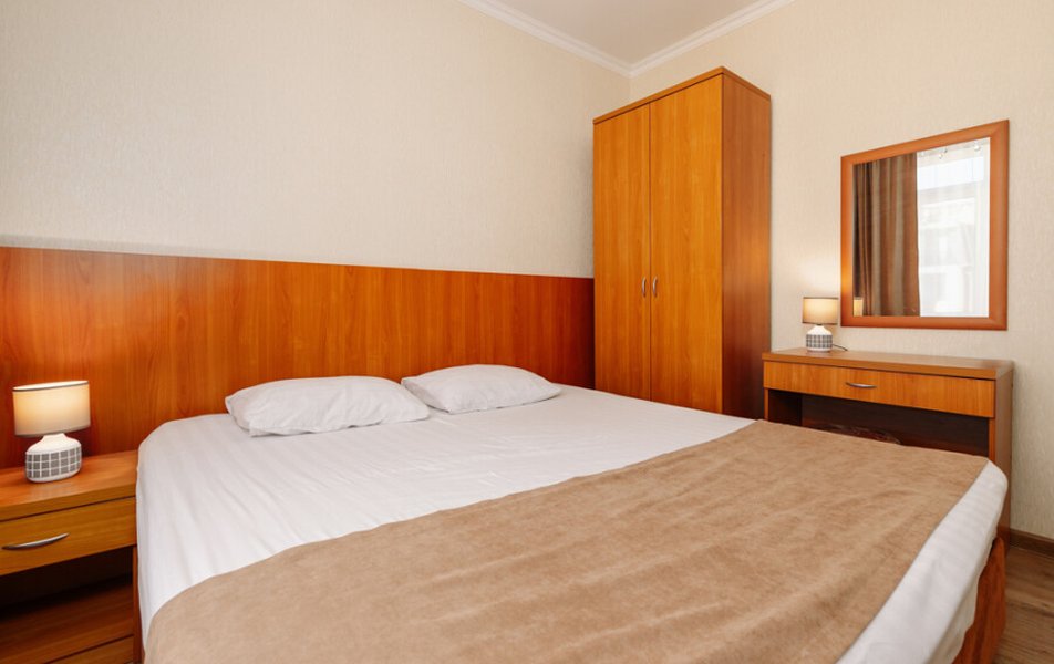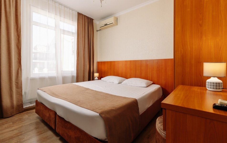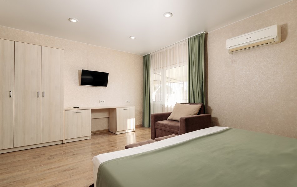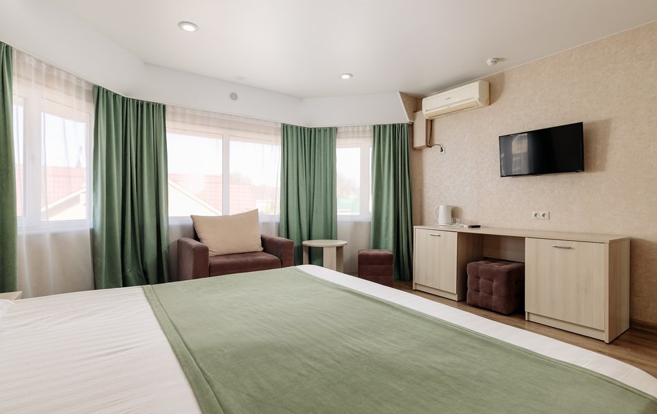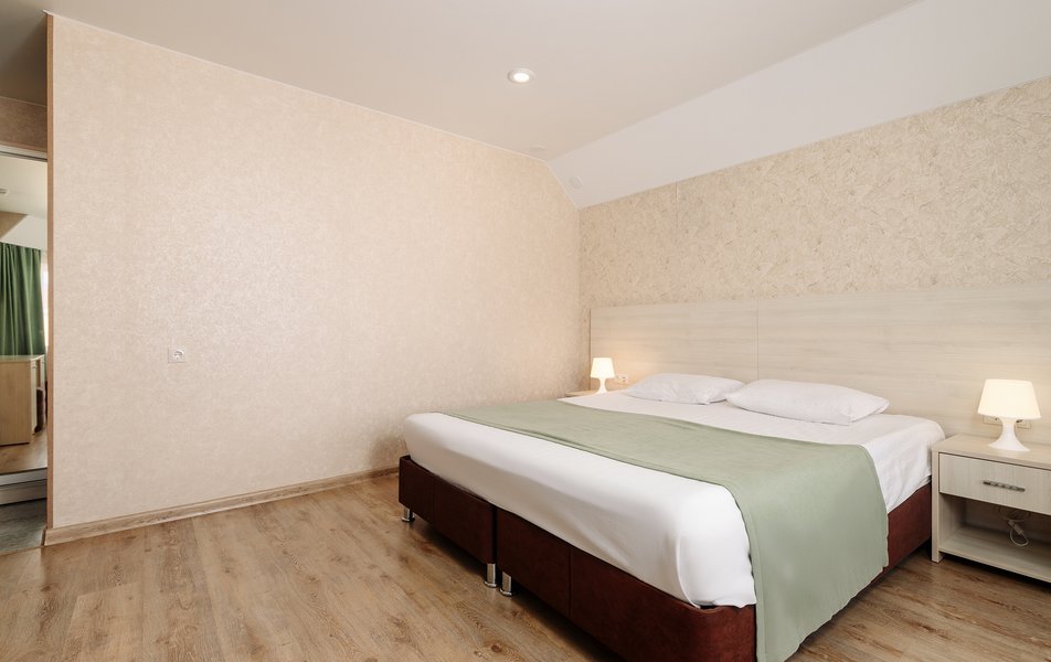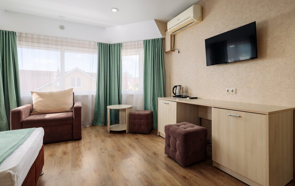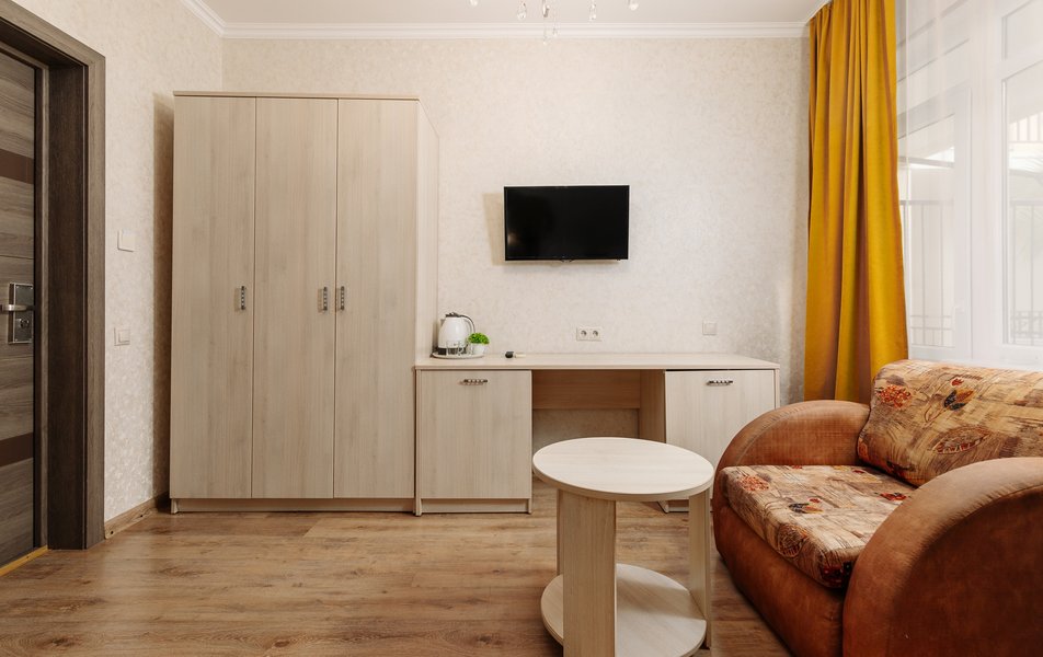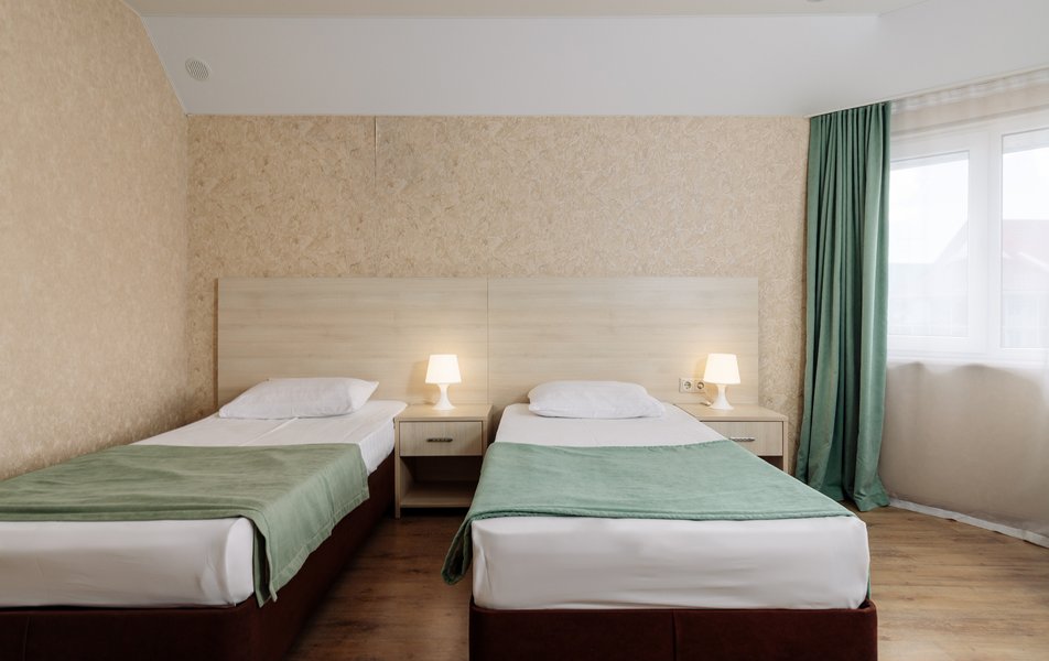 Плюсы: -Номер чистый, симпатичный, (брали трёхместный, который остался. Но жили вдвоем. На цене это не сказалось. Видимо, потому что не сезон, май 2021 выдался холодным). Окна выходят на дорогу и соседние отели. Между ними видно горы. У других номеров окна во двор. - Постели чистые. Полотенца каждому для лица, ног, тела. - Утром после 10 часов приходят забрать мусор. В санузле есть таз для стирки, тряпочка. - В номере есть плоский телевизор (не смарт, но есть HDMI и USB), фен, чайник, мини-холодильник, стол, 3 чашки (без ложек), кондиционер, сушилка, 1 двухспальная и 1 односпальная кровати, кресло, 2 тумбы со светильниками у кроватей, шкаф вешалка зеркало, 2 табуретки на балконе. Везде есть розетки, освещение - раздельно (не забудьте вставить ключ-карту в отсек у двери, иначе свет не включится). На фото отеля есть этот номер. Гладильная доска и утюг есть на этаже. В общем, минимальный набор для комфортного проживания. Не хватает микроволновки, но это уже придирки. - Шторы плотные, закрывают окно полностью. В санузле отдельная форточка. - Отзывчивый, доброжелательный персонал Минусы: -Завтрак для мужчины мал (1 каша, 2 яичница/омлет/сосиски/сырники/блины, 3 чай/кофе). За небольшую доплату можно договориться совместить, например, сосиски омлет -Сантехника немного уставшая (но, по просьбе, сразу пришли и заменили прокладку в соединении душа и смесителя) -Шумоизоляции нет вообще. Слышно сморкающегося соседа, шум воды, пролетающие самолёты (которые часто взлетают и садятся прям над головой) - Возможно, это наши придирки, но не хватает сейфа. -Из принадлежностей в санузле всего лишь мыло и шампунь. Геля для душа нет. Остальное: -В кафе поужинать вкусно (!), много, но дороговато, засчет больших порций (мы не справились, пришлось забрать с собой. Есть такая услуга). Кафе крытое. -Трансфер из аэропорта платный, 500 руб. Скорее всего, Вас забудут об этом предупредить -В шаговой доступности магазины, мост через реку в сторону старого Адлера, еда, дендрарий. Но придется немного покружить. Некоторые пути неявные, многие ведут в тупик. Если выйти к Имеретинскому гостиничному комплексу, можно сесть на автобусы до олимпийских объектов, Сочи-парка, до Красной поляны (есть вариант доехать на Ласточке). -В номере работают датчики задымления (не курить!). Курить можно на балконе, есть пепельница.