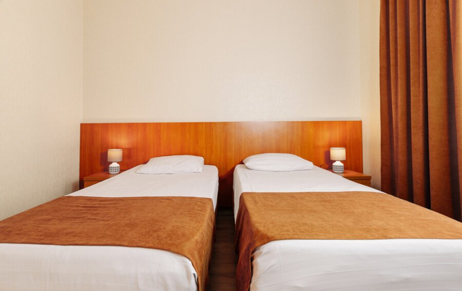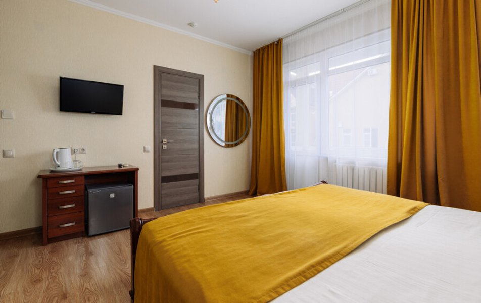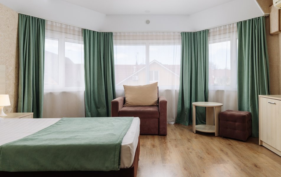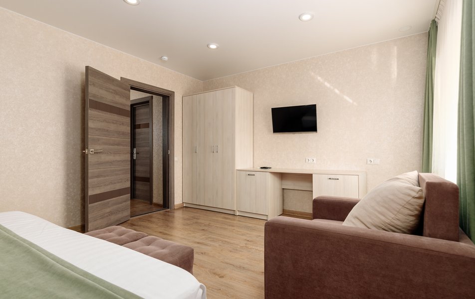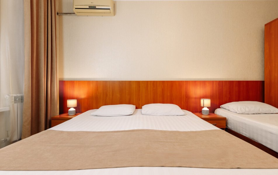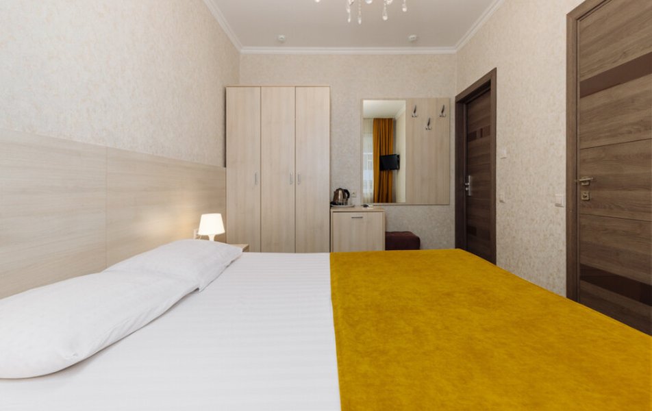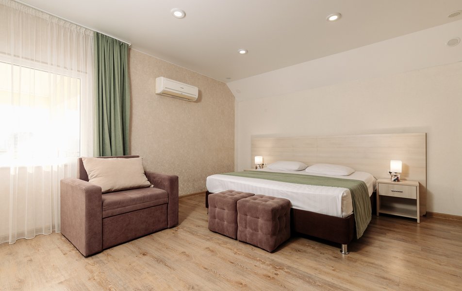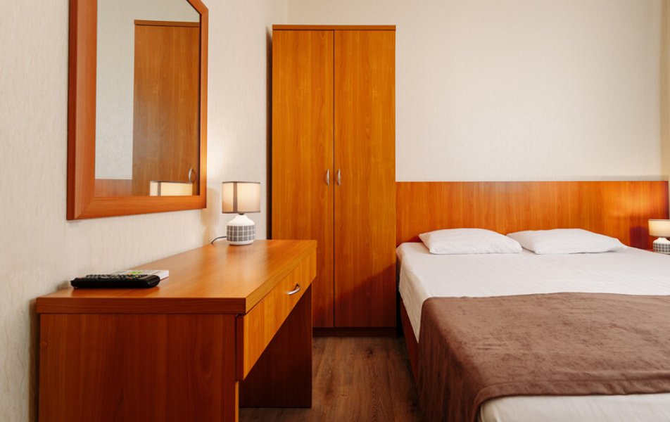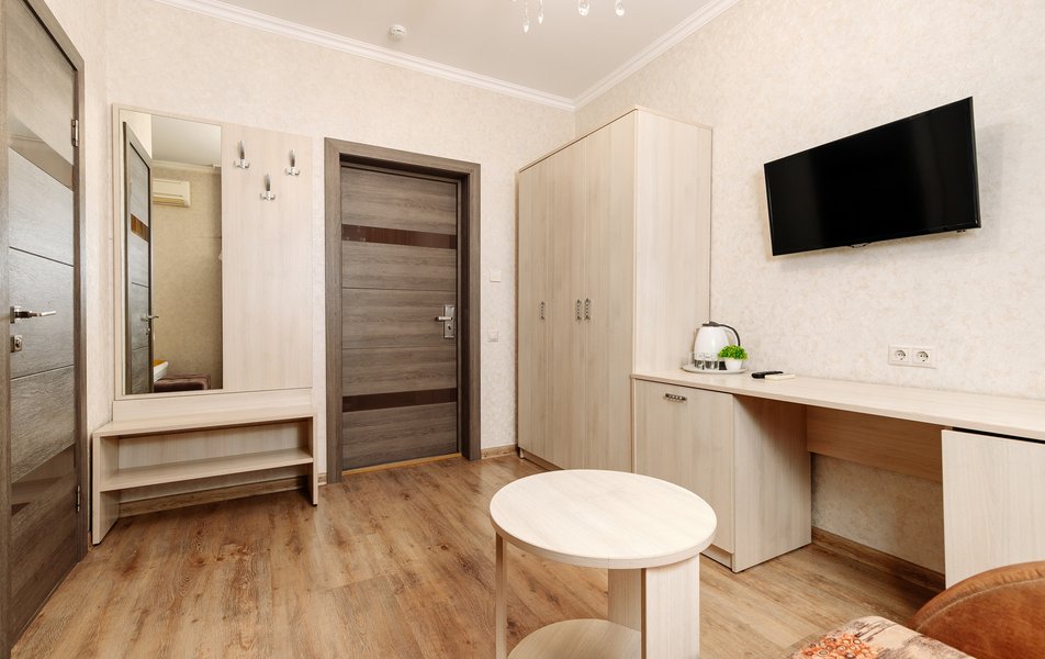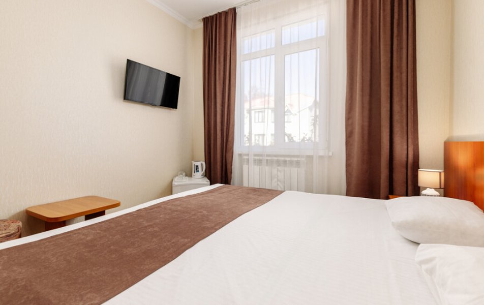 Плюсы: -Номер чистый, симпатичный, (брали трёхместный, который остался. Но жили вдвоем. На цене это не сказалось. Видимо, потому что не сезон, май 2021 выдался холодным). Окна выходят на дорогу и соседние отели. Между ними видно горы. У других номеров окна во двор. - Постели чистые. Полотенца каждому для лица, ног, тела. - Утром после 10 часов приходят забрать мусор. В санузле есть таз для стирки, тряпочка. - В номере есть плоский телевизор (не смарт, но есть HDMI и USB), фен, чайник, мини-холодильник, стол, 3 чашки (без ложек), кондиционер, сушилка, 1 двухспальная и 1 односпальная кровати, кресло, 2 тумбы со светильниками у кроватей, шкаф вешалка зеркало, 2 табуретки на балконе. Везде есть розетки, освещение - раздельно (не забудьте вставить ключ-карту в отсек у двери, иначе свет не включится). На фото отеля есть этот номер. Гладильная доска и утюг есть на этаже. В общем, минимальный набор для комфортного проживания. Не хватает микроволновки, но это уже придирки. - Шторы плотные, закрывают окно полностью. В санузле отдельная форточка. - Отзывчивый, доброжелательный персонал Минусы: -Завтрак для мужчины мал (1 каша, 2 яичница/омлет/сосиски/сырники/блины, 3 чай/кофе). За небольшую доплату можно договориться совместить, например, сосиски омлет -Сантехника немного уставшая (но, по просьбе, сразу пришли и заменили прокладку в соединении душа и смесителя) -Шумоизоляции нет вообще. Слышно сморкающегося соседа, шум воды, пролетающие самолёты (которые часто взлетают и садятся прям над головой) - Возможно, это наши придирки, но не хватает сейфа. -Из принадлежностей в санузле всего лишь мыло и шампунь. Геля для душа нет. Остальное: -В кафе поужинать вкусно (!), много, но дороговато, засчет больших порций (мы не справились, пришлось забрать с собой. Есть такая услуга). Кафе крытое. -Трансфер из аэропорта платный, 500 руб. Скорее всего, Вас забудут об этом предупредить -В шаговой доступности магазины, мост через реку в сторону старого Адлера, еда, дендрарий. Но придется немного покружить. Некоторые пути неявные, многие ведут в тупик. Если выйти к Имеретинскому гостиничному комплексу, можно сесть на автобусы до олимпийских объектов, Сочи-парка, до Красной поляны (есть вариант доехать на Ласточке). -В номере работают датчики задымления (не курить!). Курить можно на балконе, есть пепельница.