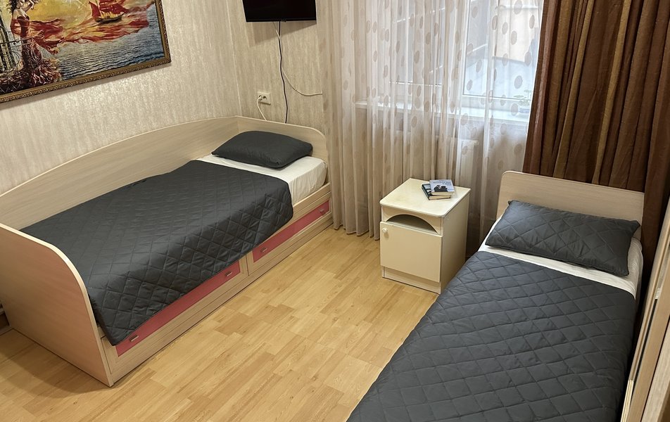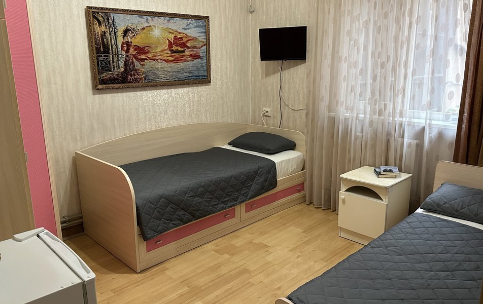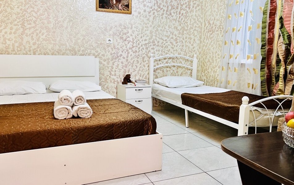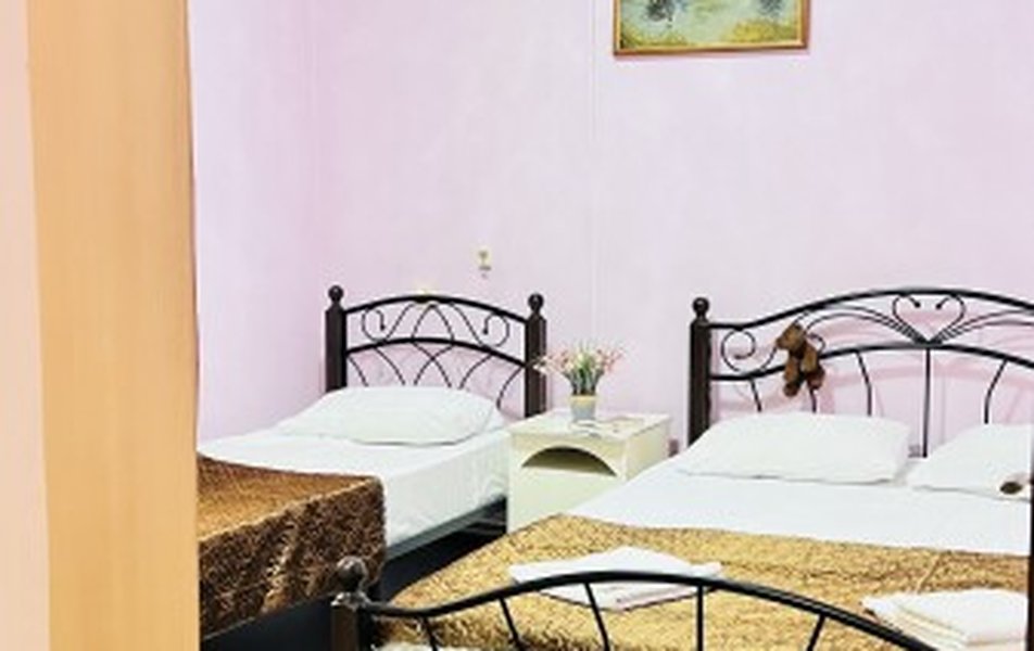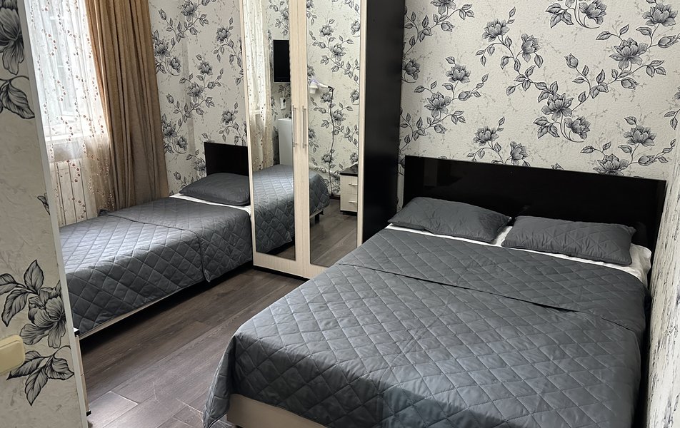 Семейный 5-местный 2-комнатный Количество комнат: 2-комнатный Тип номера: Семейный Вид из номера: на город: на двор Кол-во номеров: 2 Кол-во основных мест: 5 Площадь (кв. м): 30 Этаж: 2,3 Мебель: диван раскладной, кровать двуспальная, кровать односпальная, прикроватная тумбочка, шкаф Оборудование: мини-холодильник, сплит-система, телевизор Санузел: с ванной, фен Сервис: Wi-Fi бесплатно, уборка номера